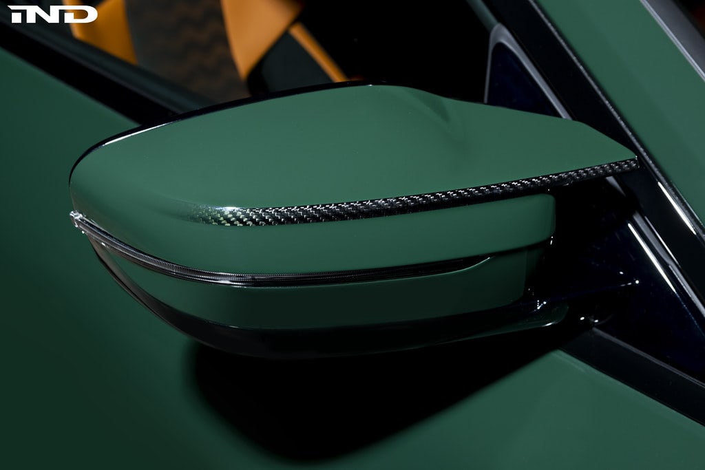 Open the hood and you’ll immediately notice that even the engine cover has been finished in BRG. Elsewhere, the roundel front and back now has an elegant glossy black finish and the Bavarian sports coupe is chock-full of M Performance carbon fiber upgrades. The list is quite extensive and includes everything from the front lip and side mirror caps to the rear wing and even a fuel cap cover.