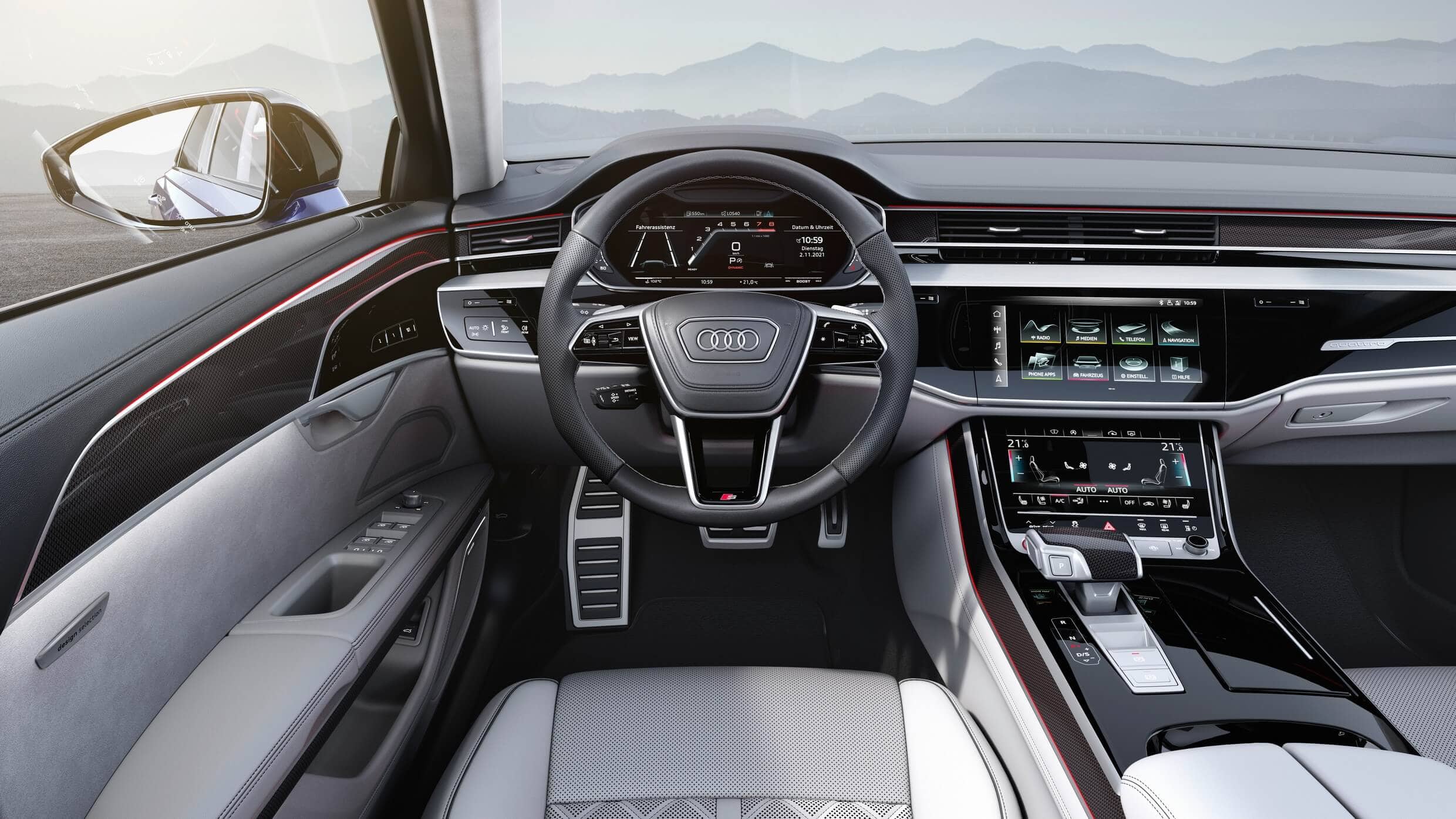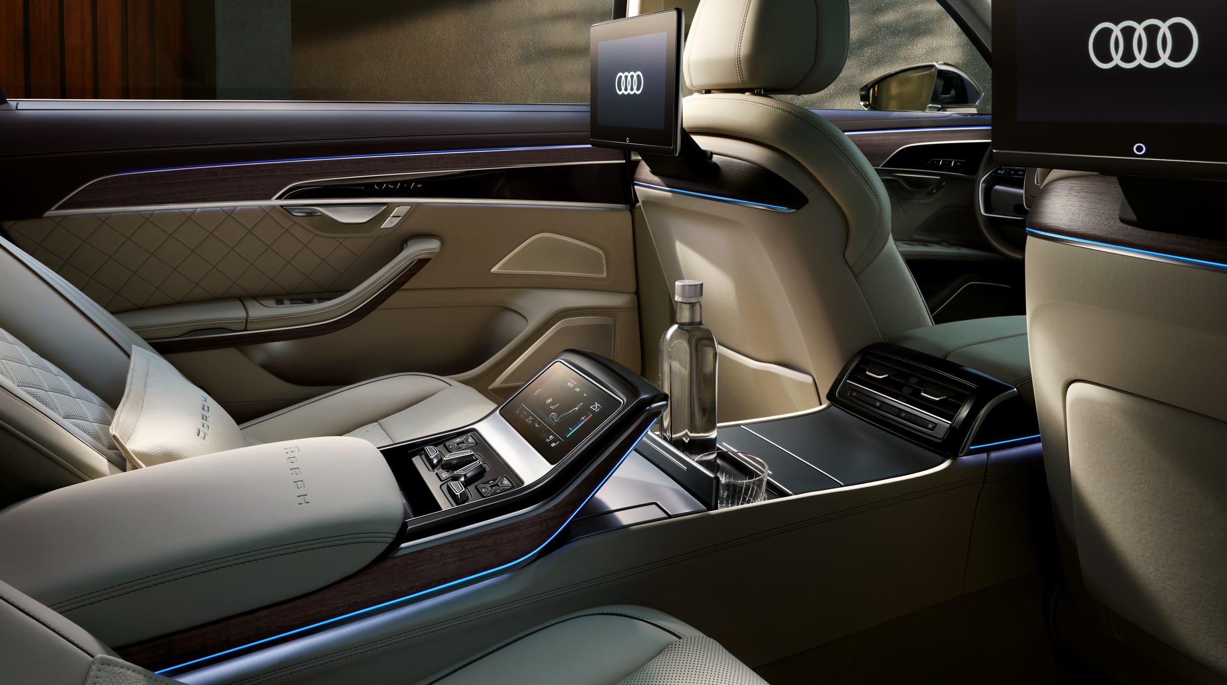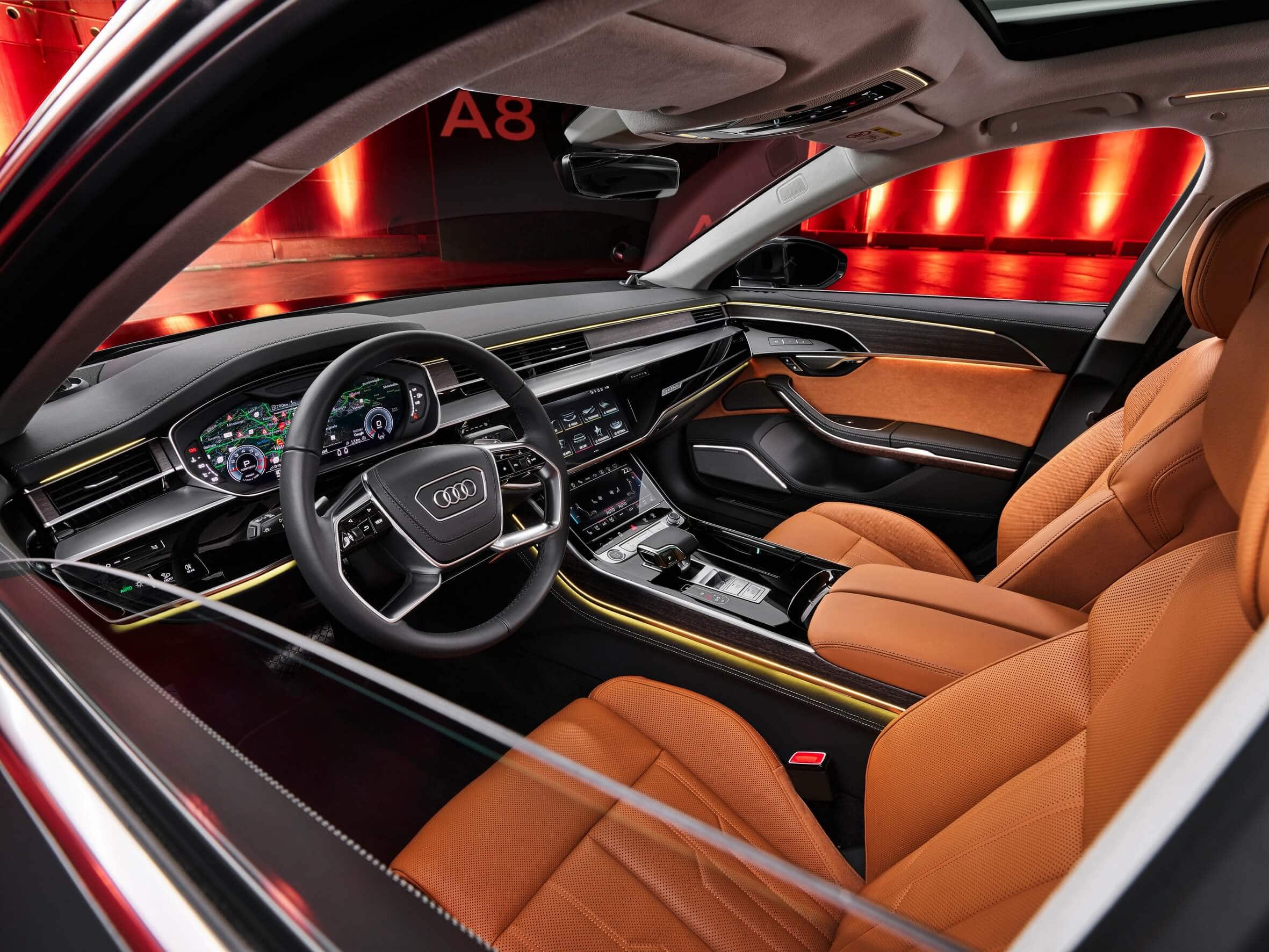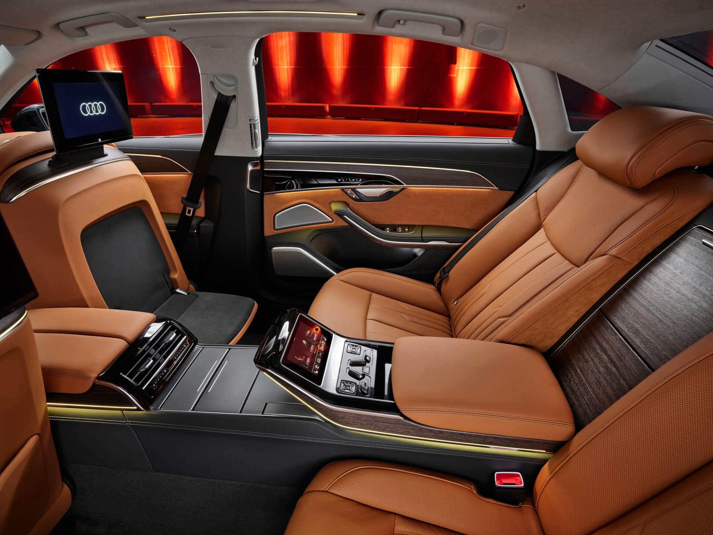 The fully digital Audi Virtual Cockpit sits in front of the driver and can be complemented by an optional head-up display and even a night vision system. The center console is dominated by a pair of touchscreens, measuring 10.1 inches and 8.6 inches, while the rear seats can get their own dual 10.1-inch displays.