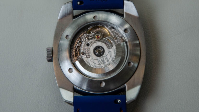 The movement is a Peseux P224 automatic movement, decorated with “cote de geneve” and “perlage”, and has a date display, a hacking seconds hand, and a 38 hour power reserve. It’s not the sexiest of movements but it’s affordable, accurate, and reliable. Plus, while DWISS’ decorations aren’t extensive, they are pleasant and dress up the watch quite a bit. It’s about as decorated as a $1,000 watch’s movement should be.