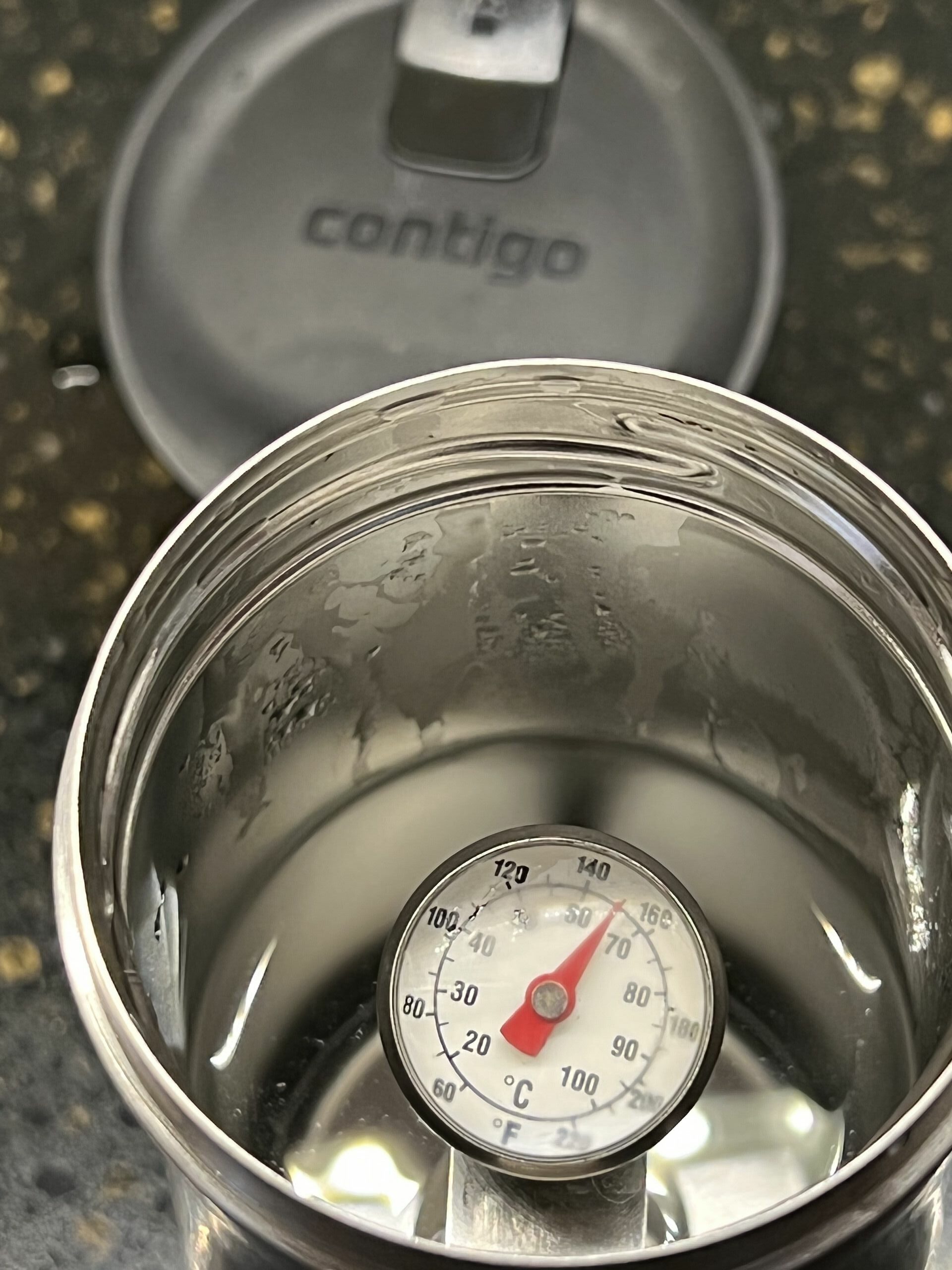 This coffee mug is another frequent winner of comparisons. It really is almost more thermos-like with a lid that springs up with a push of your thumb. This is in the exact opposite location of the Contigo. I find it actually easier to open than the Contigo as my thumb naturally hits it when I pick it up versus the Contigo where I have rotate my grip a bit to line up my fingers with the button. It appears odd to drink from it initially, but actually works quite well despite the button remaining at the 6 o’clock position when you drink. This was the winner of the thermal competition having 162F temp after 1 hour. $23.99 from Amazon.