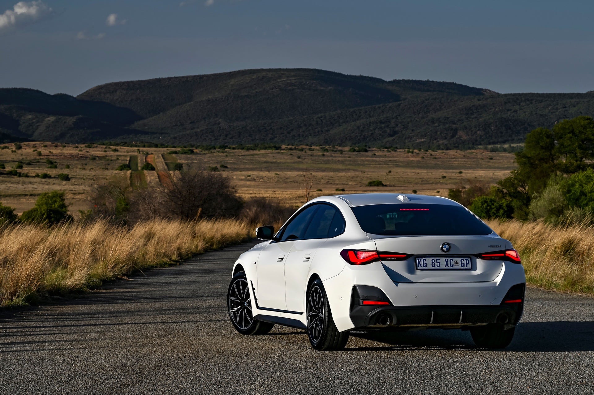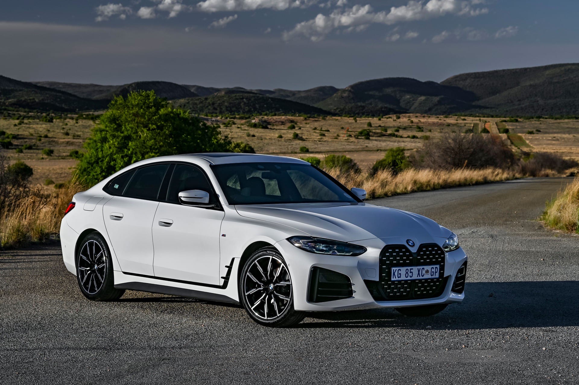 Hailing from South Africa is a new BMW 4 Series Gran Coupe (G26) in a stylish black and white look exterior combination. The BMW 420i Gran Coupe features an M Sport Package with the extended Shadow Line option which adds black contrasts to the Mineral White Metallic color. The Shadow Line adds a black lacquered kidney frame, tailpipe trims in black chrome, together with the black “hockey stick” on the side.