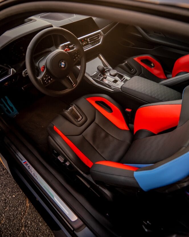 Moving inside and you will soon be wowed by the M tri-color interior and carbon bucket seats. In my opinion, the color combination tops any other color combo BMW has to offer. The black, red and blue are classic and iconic. The interior colorway is amazing and the attention to details is shown even on the seat belt strap stitching.