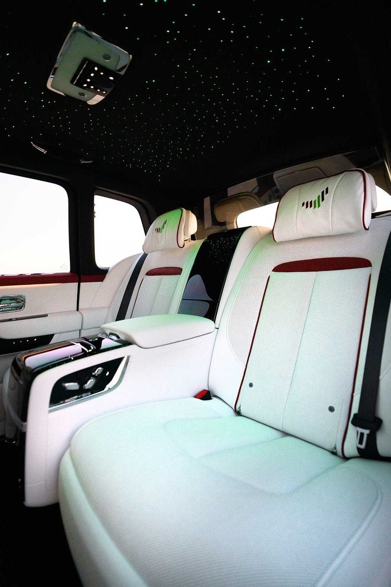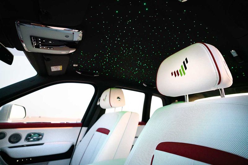 The exterior is finished in Crystal over Arctic White, adorned with a hand-painted double coachline – the upper line in Hotspur Red, the lower Fame Green. The effect is completed with a Gold Bullion Coachline Motif, the national flag rendered in Hotspur Red, Fame Green and Black on the C-Pillar Motif, and a double wheel-center pinstripe to represent the National Flag of the UAE.