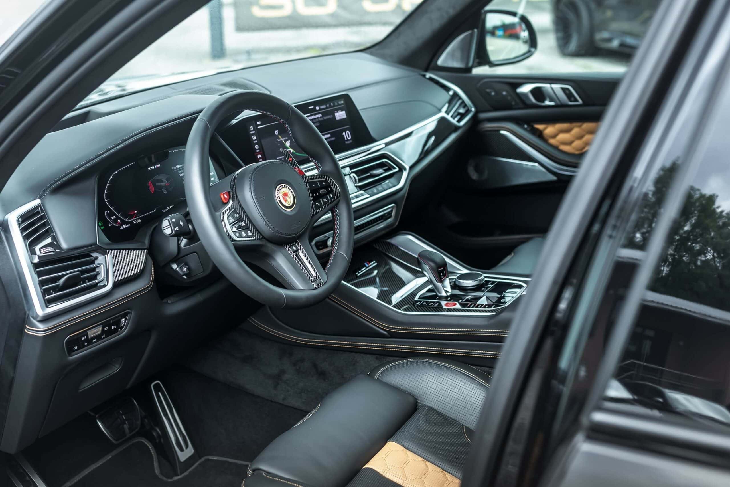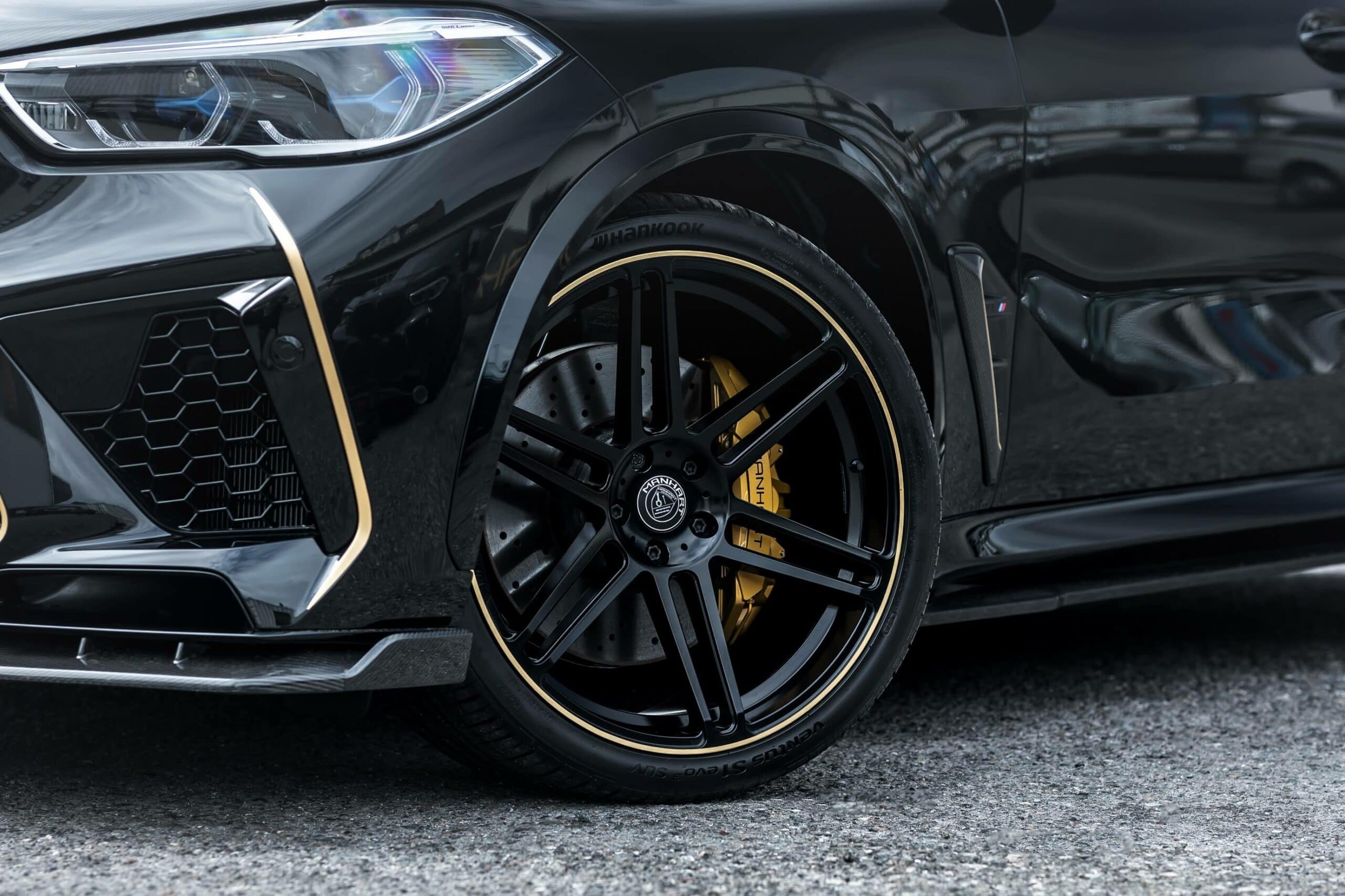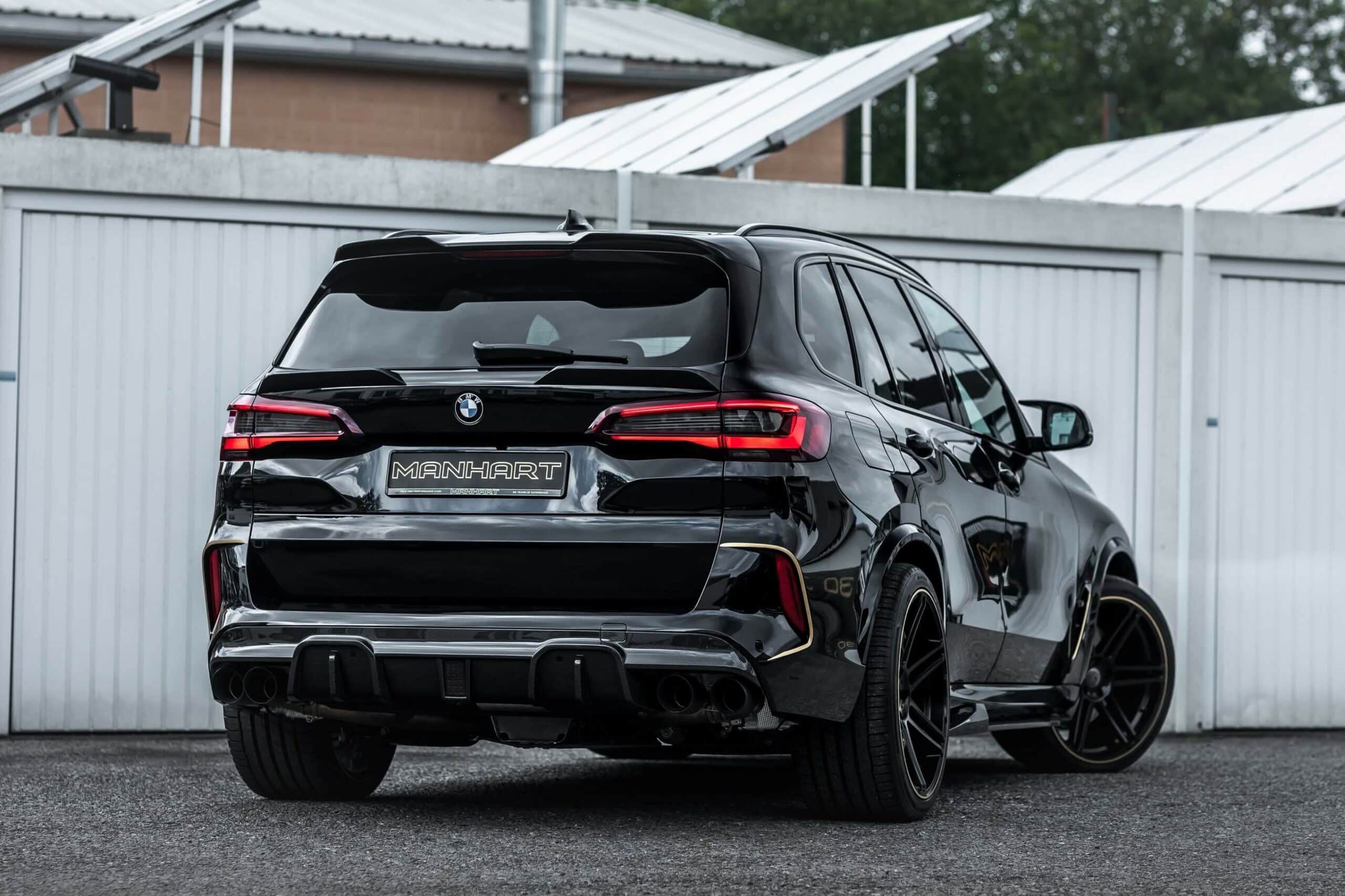 The X5 M Competition featured here by Manhart retains the original brakes, but the German tuner will be happy to upgrade them to a custom set. Also available at an additional cost, H&R suspension springs bring the speedy SUV closer to the road for a more aggressive stance. The OEM wheels have made way for a 22-inch set with a gold rim decoration. Speaking of which, contrasting accents are also noticeable at the front and rear fascias.