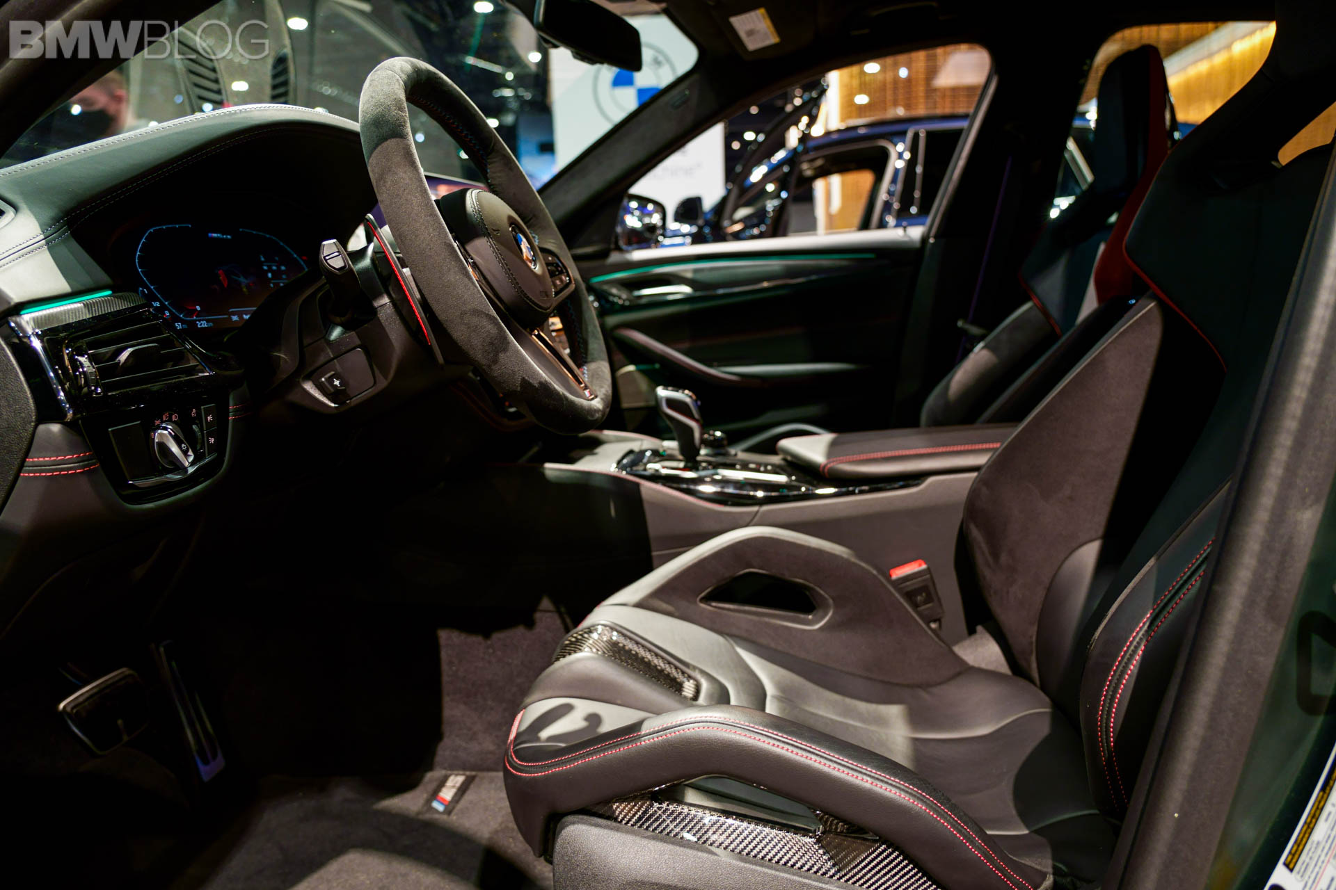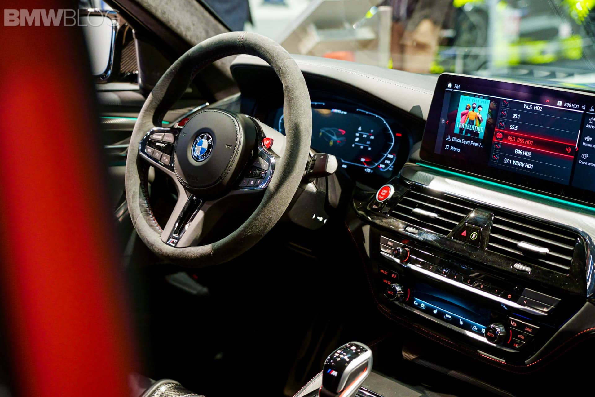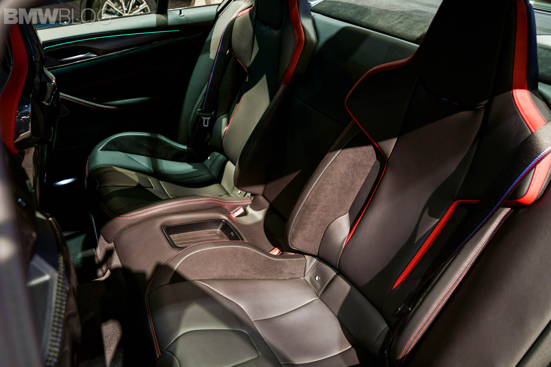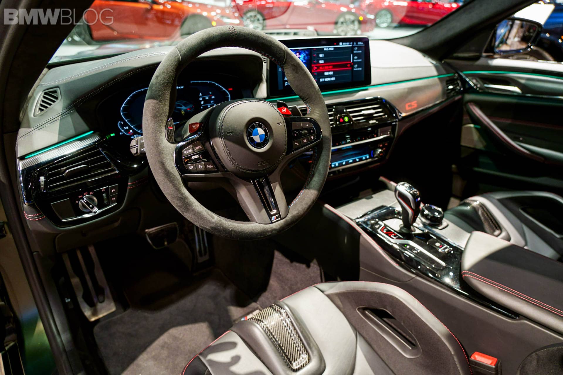 Next to this, there is a fixed lightweight cover on the center console, which replaces the usual armrest with opening lid. Its black Merino leather is complemented by red double stitching. The color red is used again for the “CS” badging on the instrument panel. On the dashboard displays in front of you, you will notice the Gold Bronze details on the animated M5 CS model.