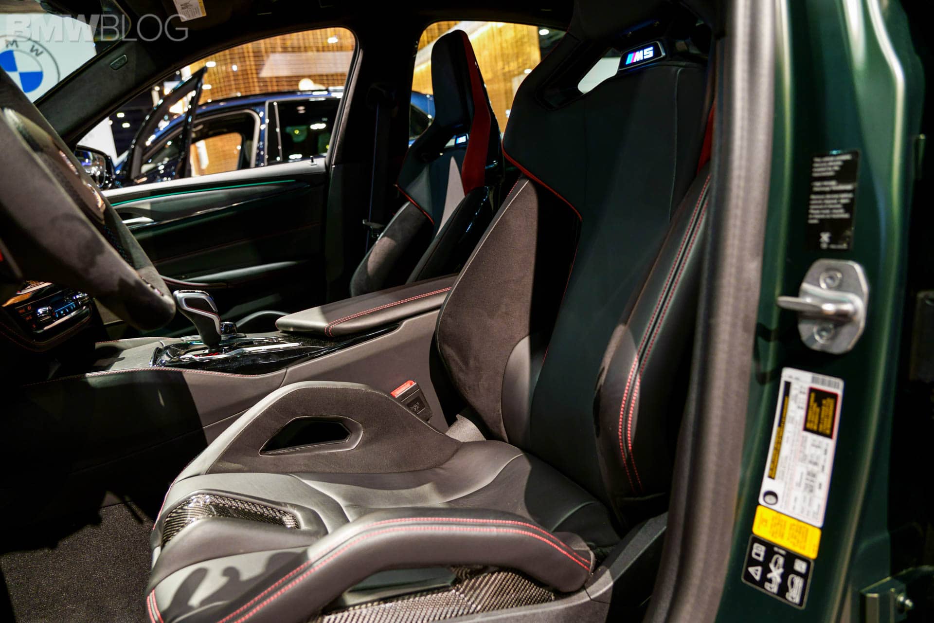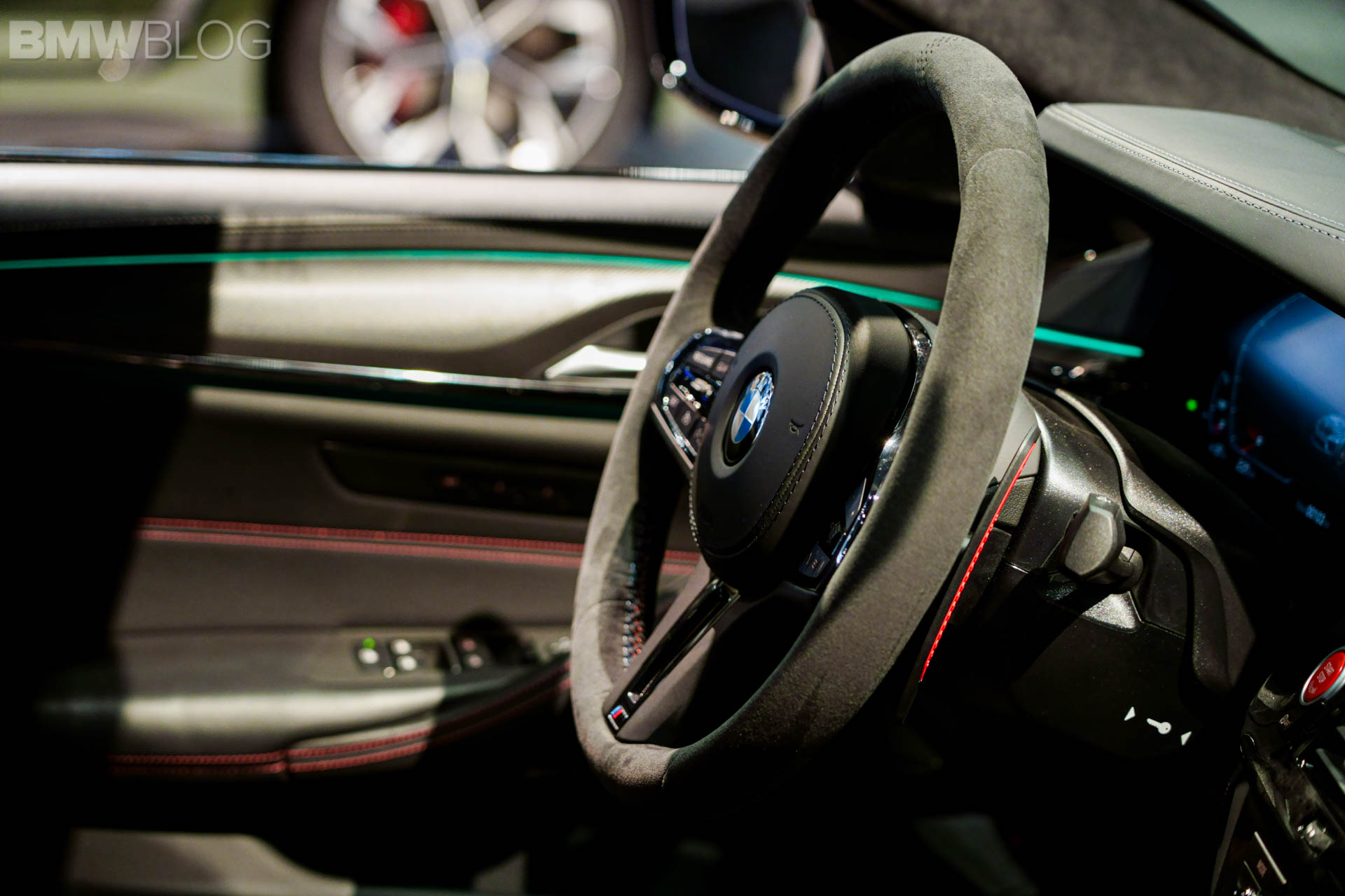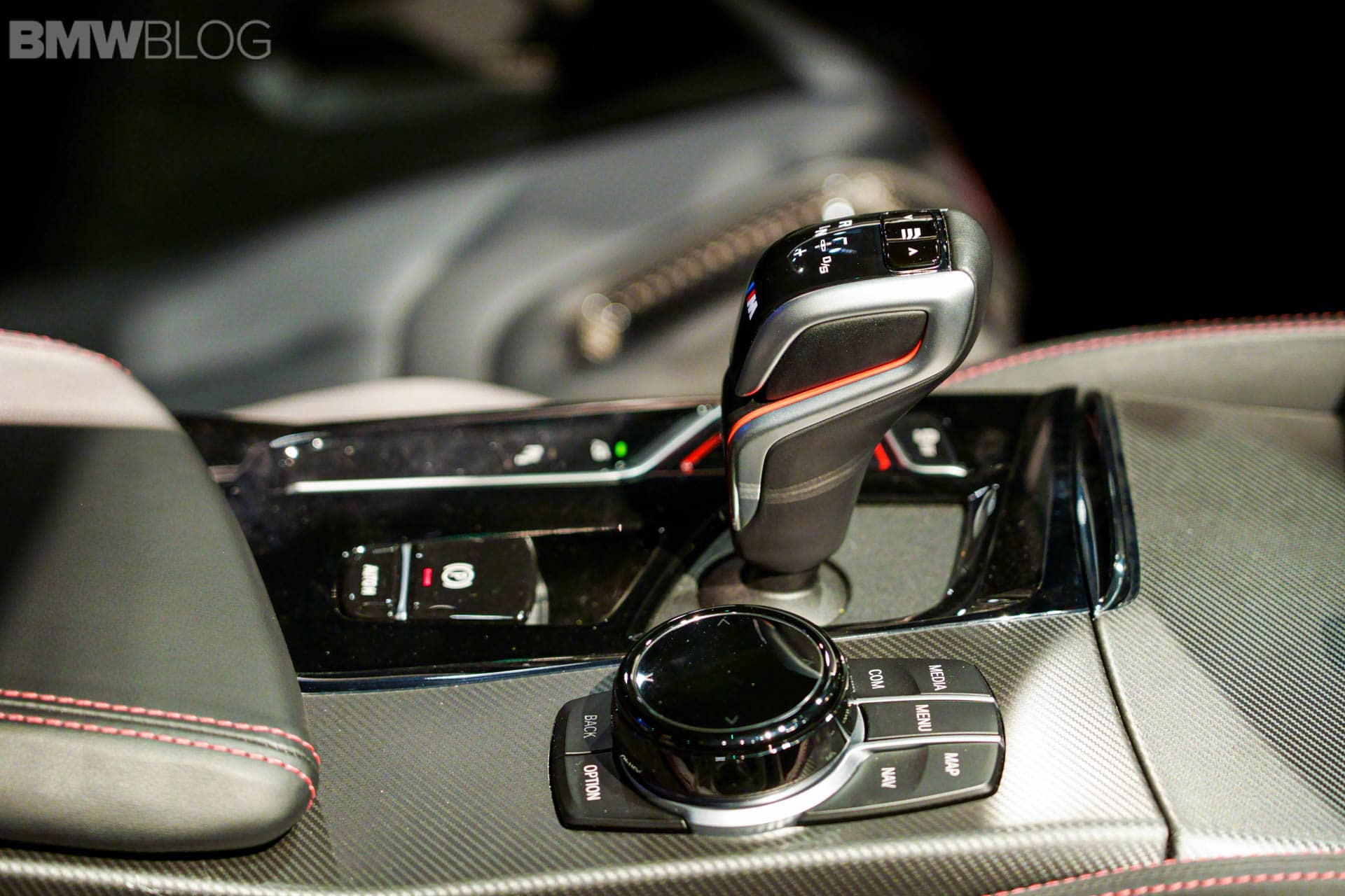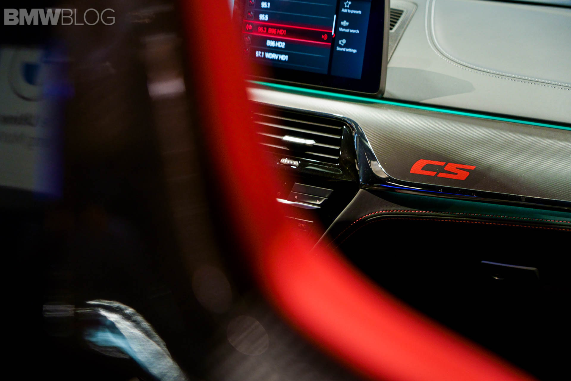 Next to this, there is a fixed lightweight cover on the center console, which replaces the usual armrest with opening lid. Its black Merino leather is complemented by red double stitching. The color red is used again for the “CS” badging on the instrument panel. On the dashboard displays in front of you, you will notice the Gold Bronze details on the animated M5 CS model.