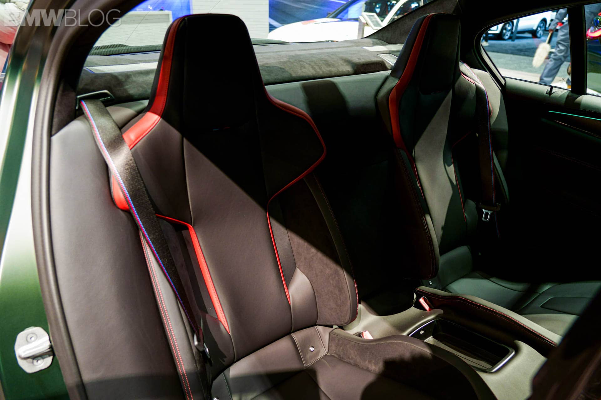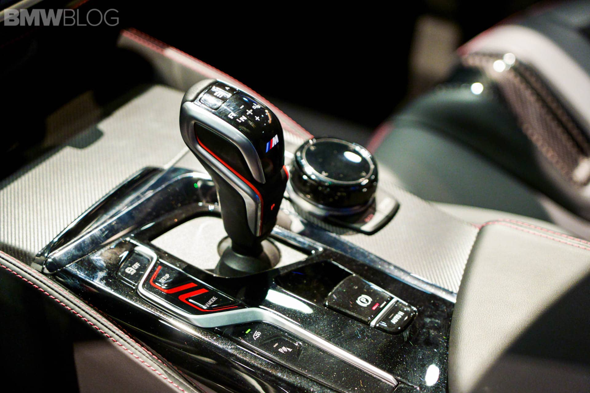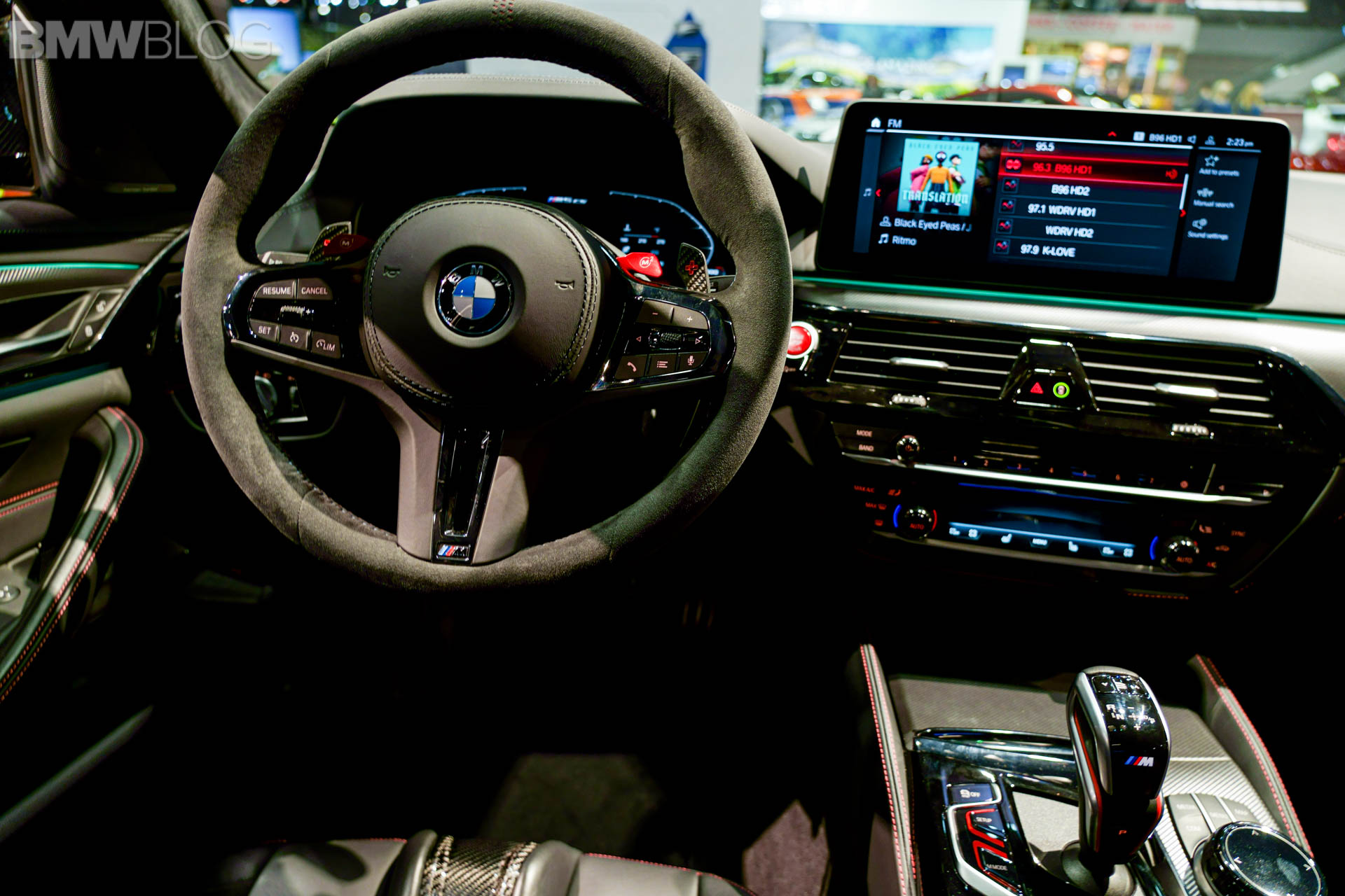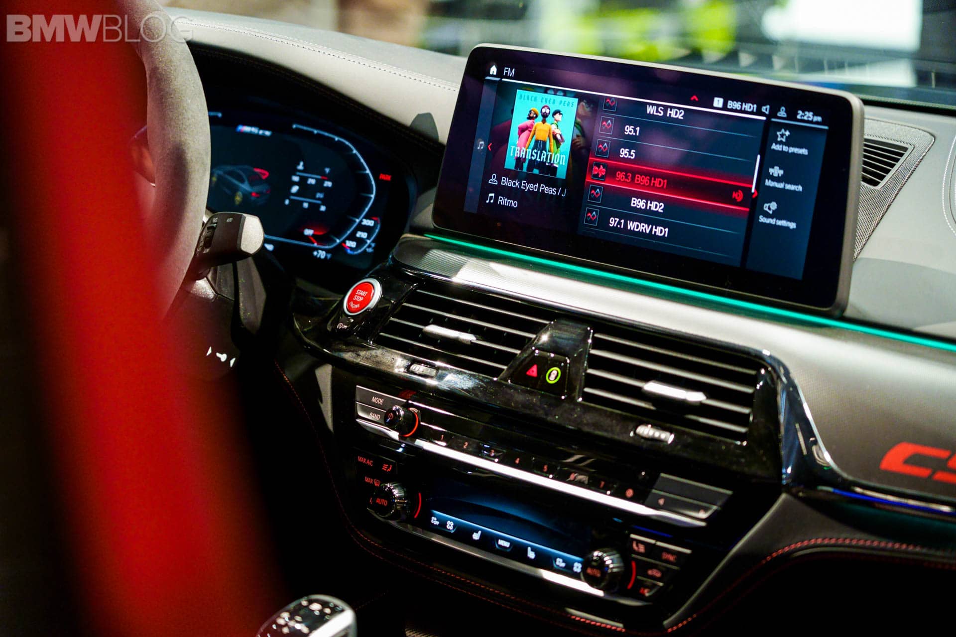 Next to this, there is a fixed lightweight cover on the center console, which replaces the usual armrest with opening lid. Its black Merino leather is complemented by red double stitching. The color red is used again for the “CS” badging on the instrument panel. On the dashboard displays in front of you, you will notice the Gold Bronze details on the animated M5 CS model.