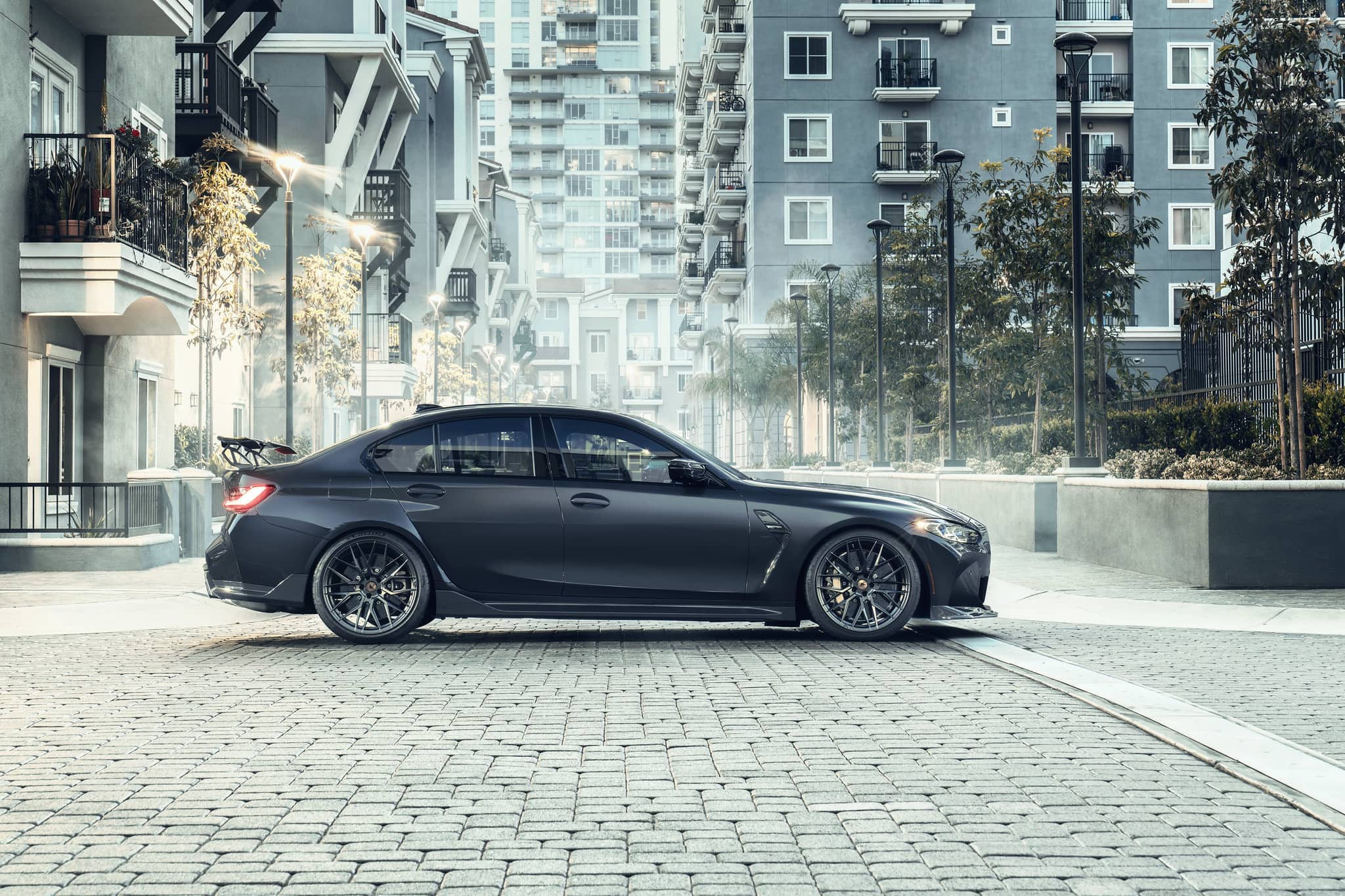 For starters, this BMW M3 G80 stands out with the new VRS Carbon Fiber Front Spoiler which not only gives the car a meaner look, but it also helps with downforce and aerodynamics. Next we have the VRV GTS Carbon Wing Blade with Aluminum Uprights sitting on top of the trunk giving the car a racing-inspired look. That massive wing will help tremendously with downforce on the track.