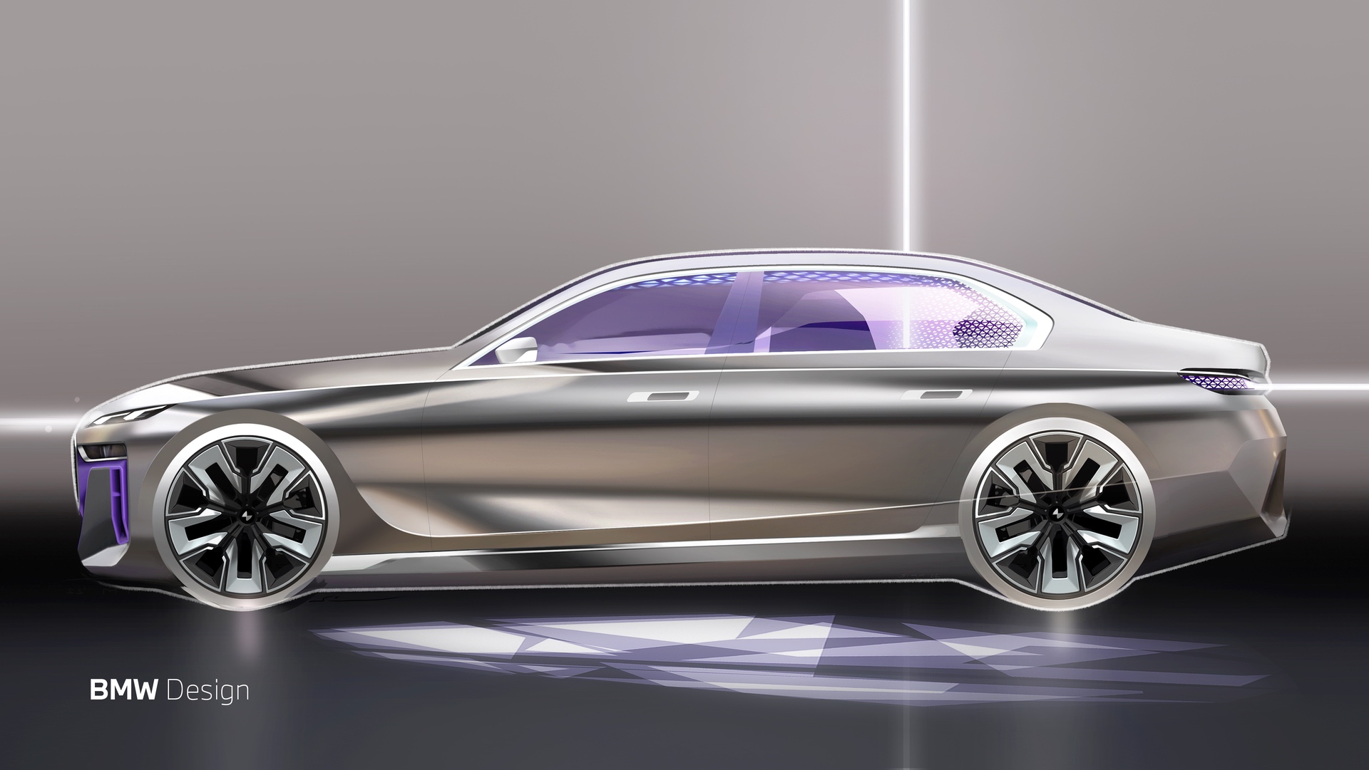 High-end versions of the BMW 7 Series G70 will have fancy Iconic Glow headlights incorporating Swarovski crystals arranged in an “L” shape. Serving as the daytime running lights and the sidelights, these will be illuminated by 14 LED units. The lights do a little “dance” when you approach the car, accompanied by the light-up contour of the kidney grille. In addition, the lights built into the door sills project graphics onto the ground to greet the driver.