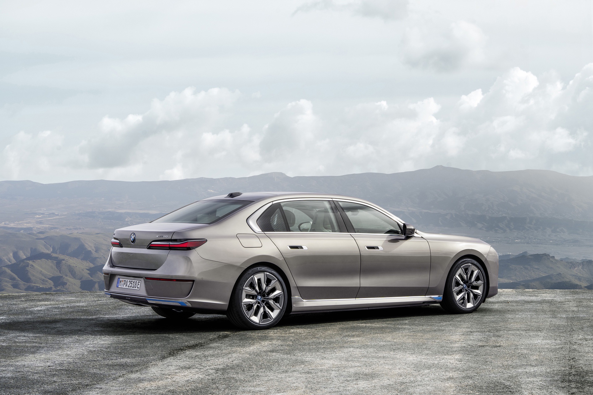 Down the sides of the car, flush door handles, aerodynamic wheels, and honest-to-goodness Hofmeister Kinks flank the BMW i7. It also gets fancy Rolls-Royce-like automatic doors, which open and close at the push of a buttons. Those aerodynamic wheels are big, too, sitting at 19″ as-standard, with 20″ and 21″ wheel options, including M Performance wheels.