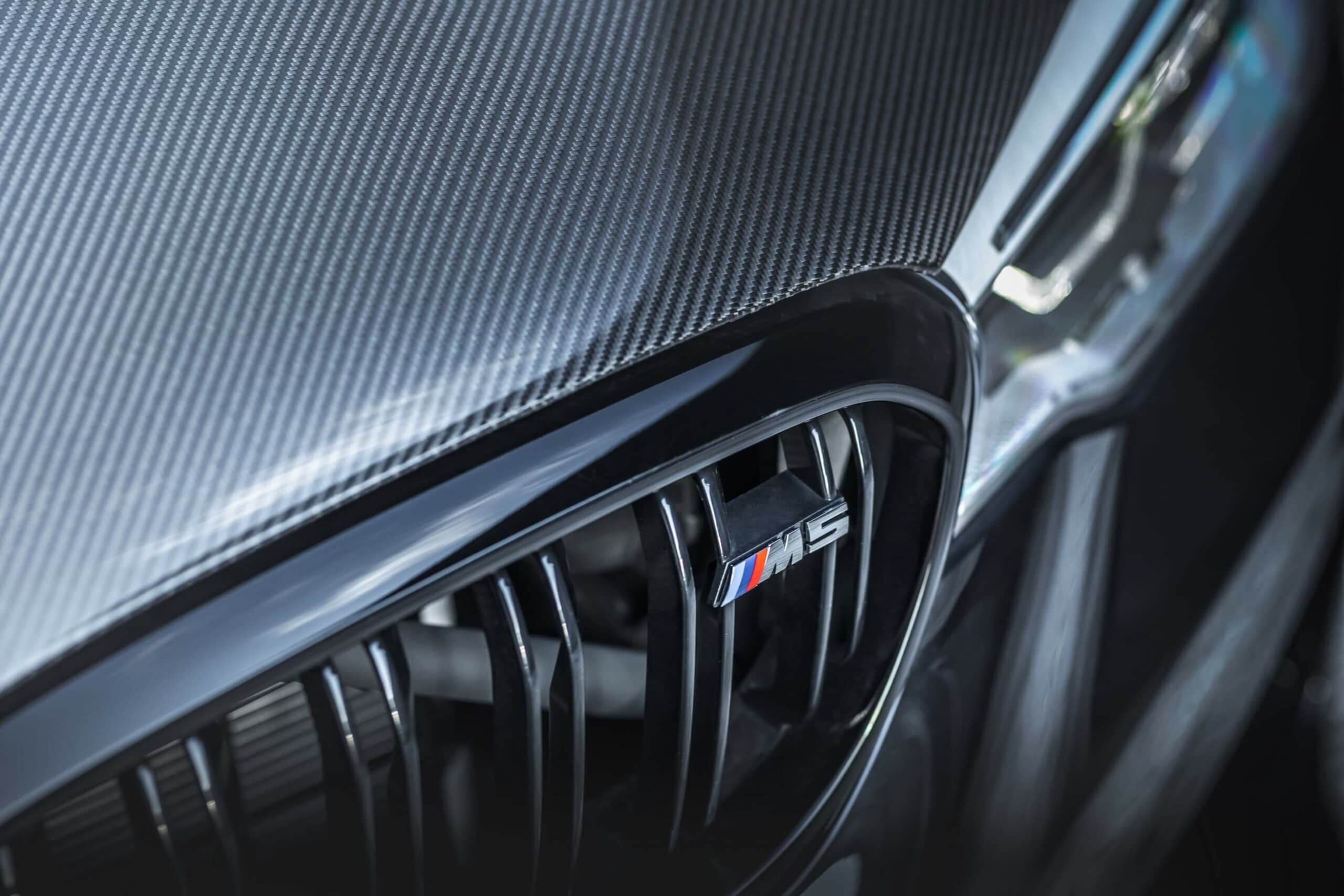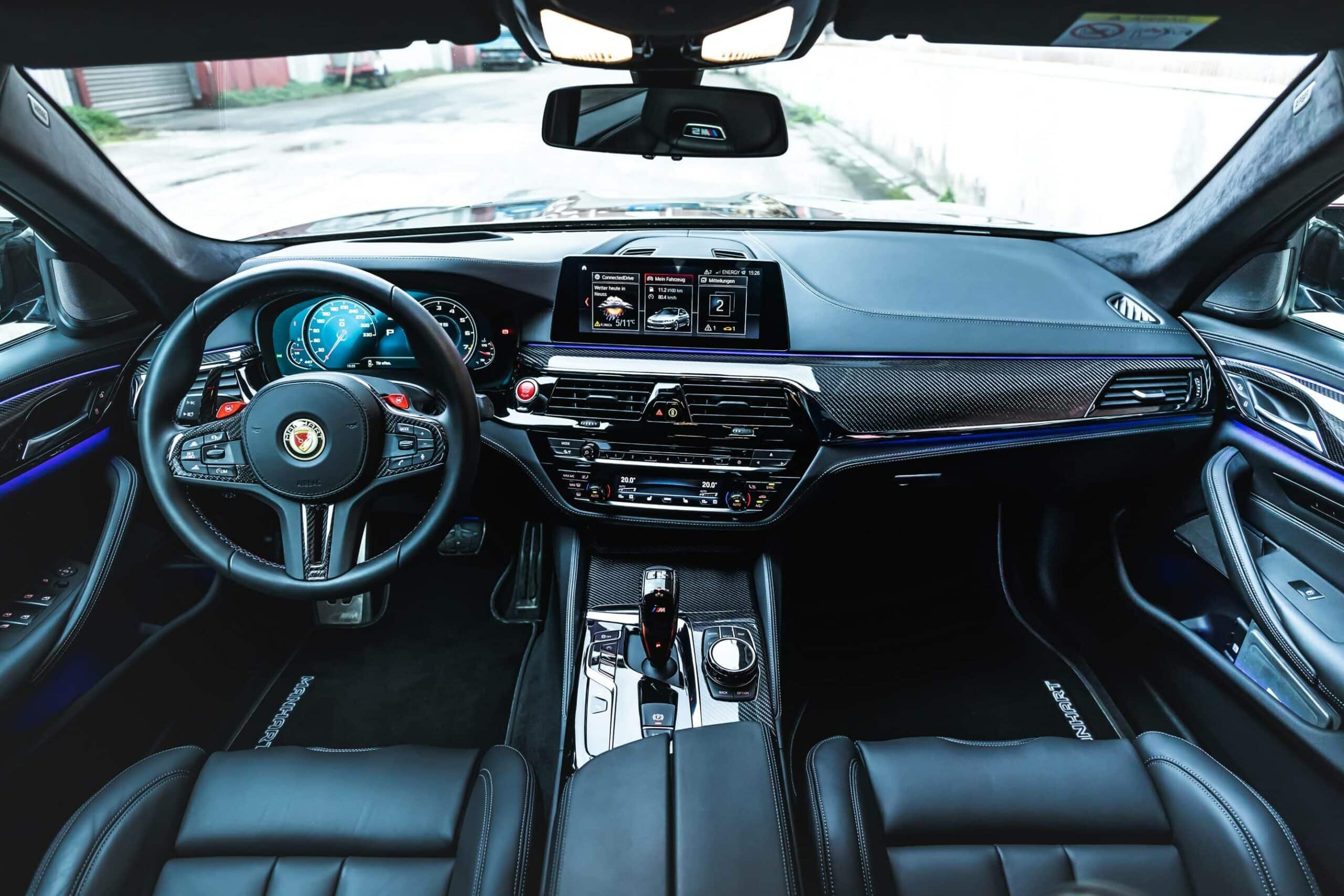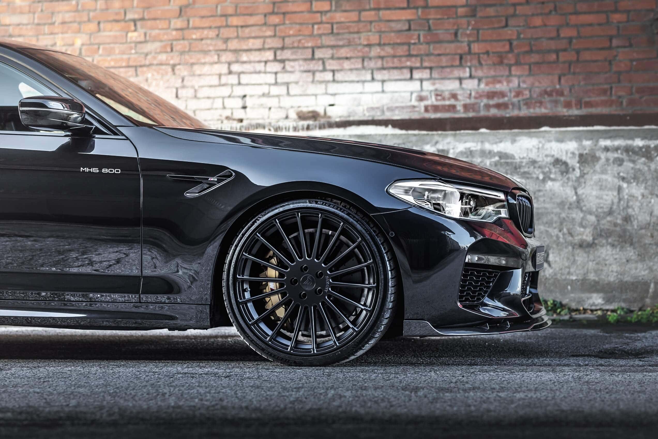 The M5 Black Edition has received a dual-vented carbon hood as well as a prominent front spoiler lip. It now rides on Hamann 21-inch wheels with an elegant multi-spoke design looking like something ALPINA would make. The new shoes are complemented by H&R suspension lowering springs to give the four-door supercar a meaner stance.