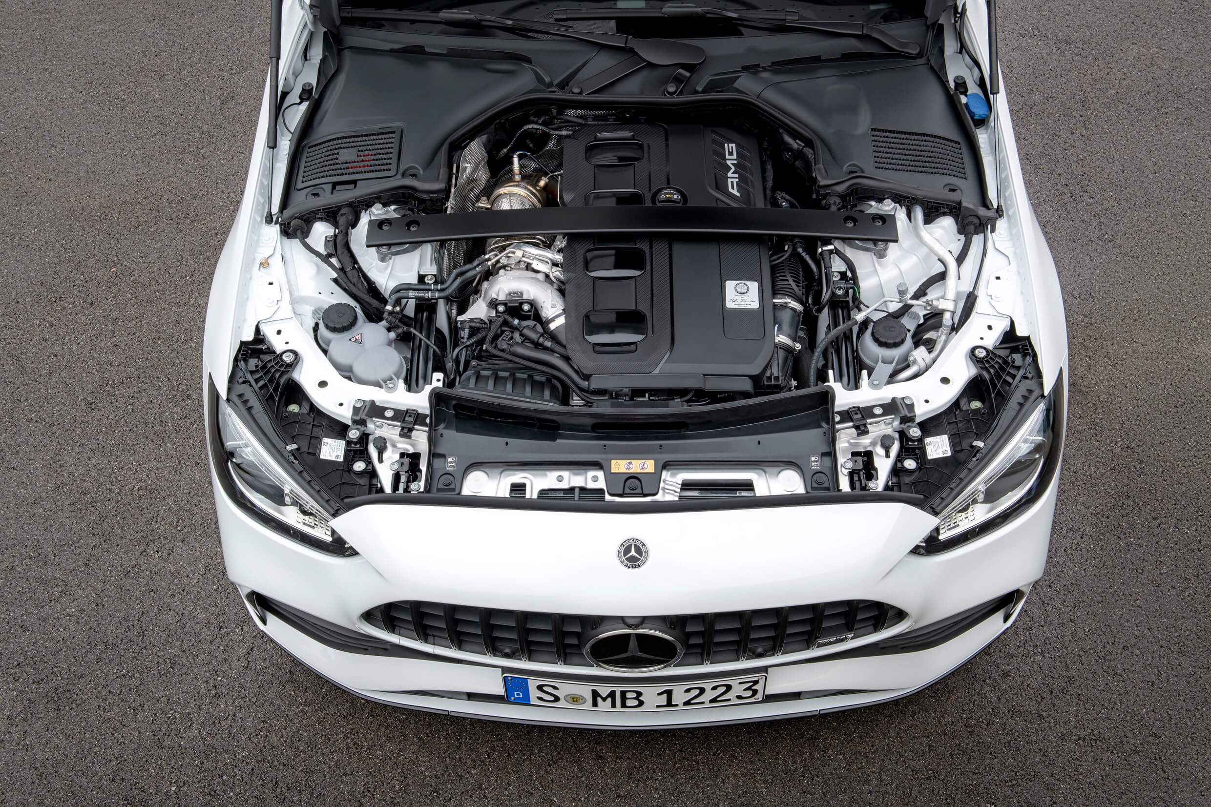 The powertrain represents a significant departure compared to the old AMG C43 as the 3.0-liter V6 engine has been deleted. Despite downsizing to a four-cylinder, 2.0-liter mill, it comes with a boost in power of 17 hp to 402 hp. On the flip side, it’s down on torque by 15 lb-ft (20 Nm) as it generates 369 lb-ft (500 Nm). It uses the same engine found in the smaller “45” cars but is mounted longitudinally. For this reason, the letter “l” has been added at the end of its “M139” codename.