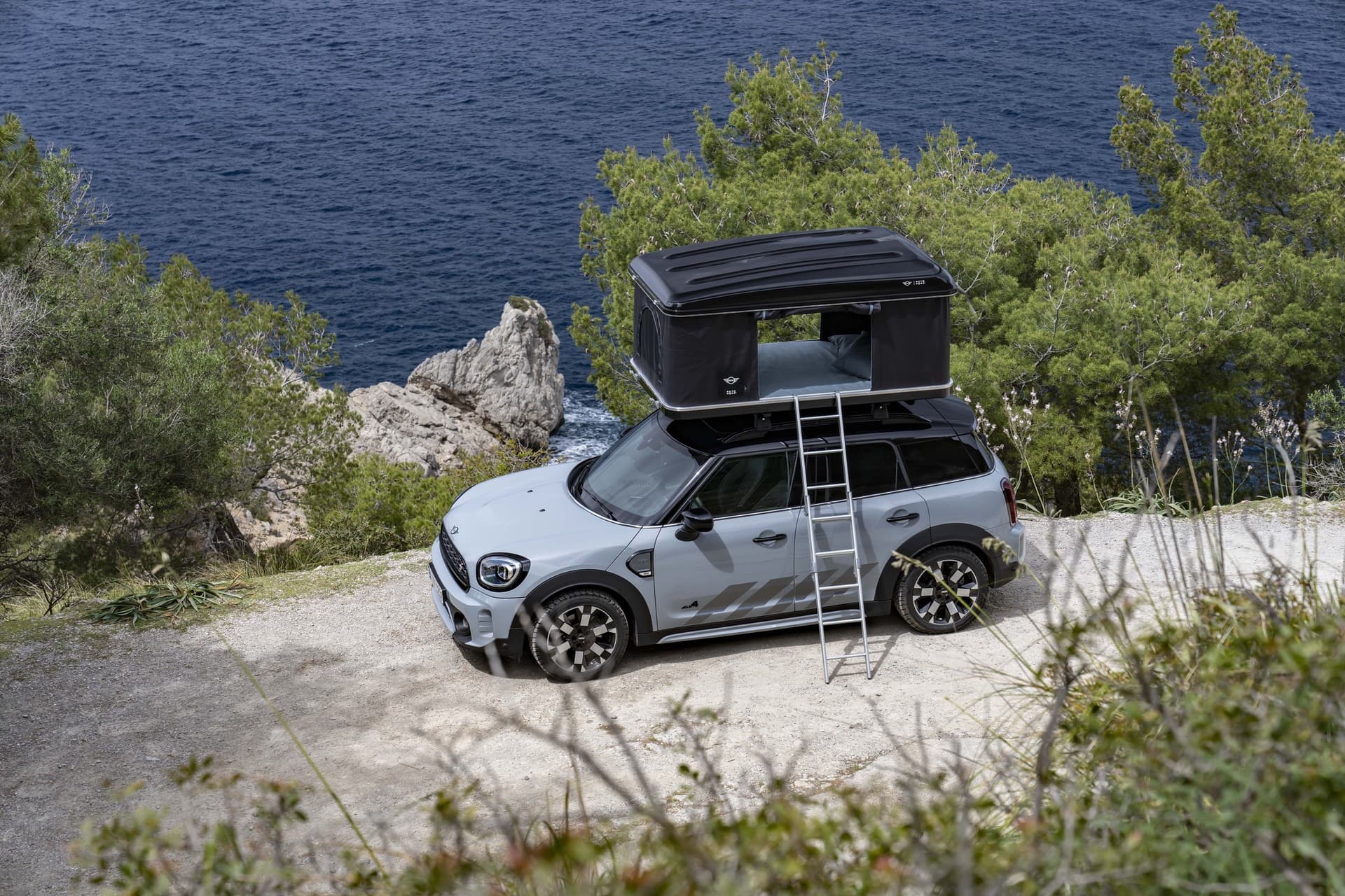 The accessories list continues with the AUTOHOME roof tent which offers the perfect place to sleep. The black box weighs 58 kilograms (128 lbs) and measures 210 by 130 centimeters (83 x 51 in). With the tent unfolded, the MINI becomes 2.05 meters high. The interior height of the mobile accommodation is 94 centimeters (37 in). The tent is easy to install: Unlock the box at the front and back, gas pressure springs open the flap. The tent is boarded via an aluminum folding ladder. Mesh pockets hold the nightly and indispensable small items, an LED light provides an illuminating view.