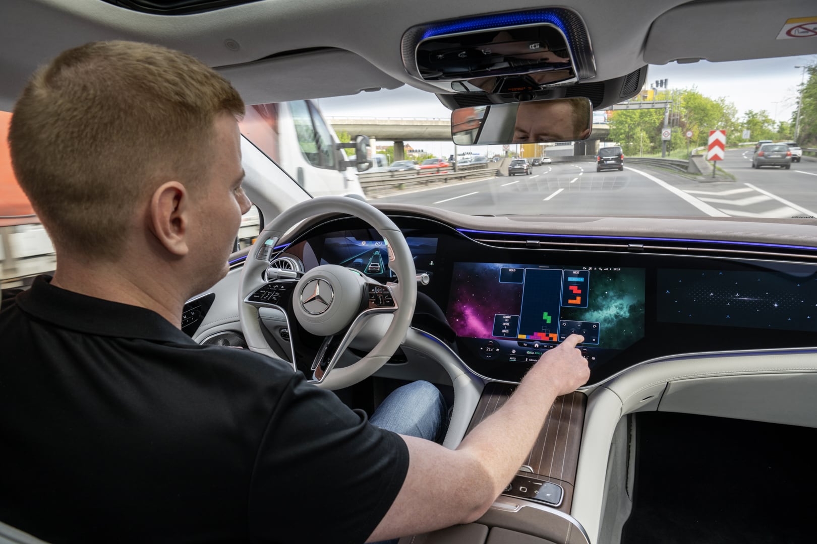 Mercedes-Benz’s Drive Pilot works almost the same way as BMW’s own system. It also uses a long-range Lidar system, combined with radar sensors and cameras, to create a 3D digital image of the car’s surroundings. Just like BMW’s system, Mercedes’ Drive Pilot only works on highways, under 37 mph, with clearly marked lines, and under 40 degrees Fahrenheit (the latter of which is to ensure it’s not in use on icy roads). However, when it’s engaged, the driver is allowed true hands-off driving, without ever having to manually interact with the system, so long as the car remains in those aforementioned parameters. Mercedes-Benz even offers some games to be played with the main infotainment system, such as a pong-like game.