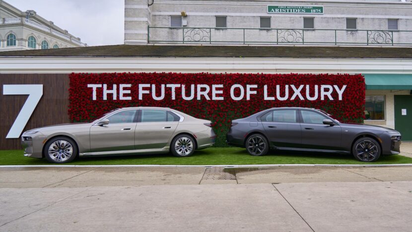 The first public showcase of the new BMW 7 Series and i7 sedans took place last weekend at the Churchill Downs Racetrack in Louisville, Kentucky. BMW of North America was the first luxury automotive partner of the Kentucky Derby, so they brought out a couple of 7 Series models to celebrate that. One of them was the BMW 760i painted in Frozen Deep Grey, while the other was an Oxide Grey BMW i7 electric sedan. The luxury sedans were showcased against a live flower wall with over 7,000 roses and lilies.