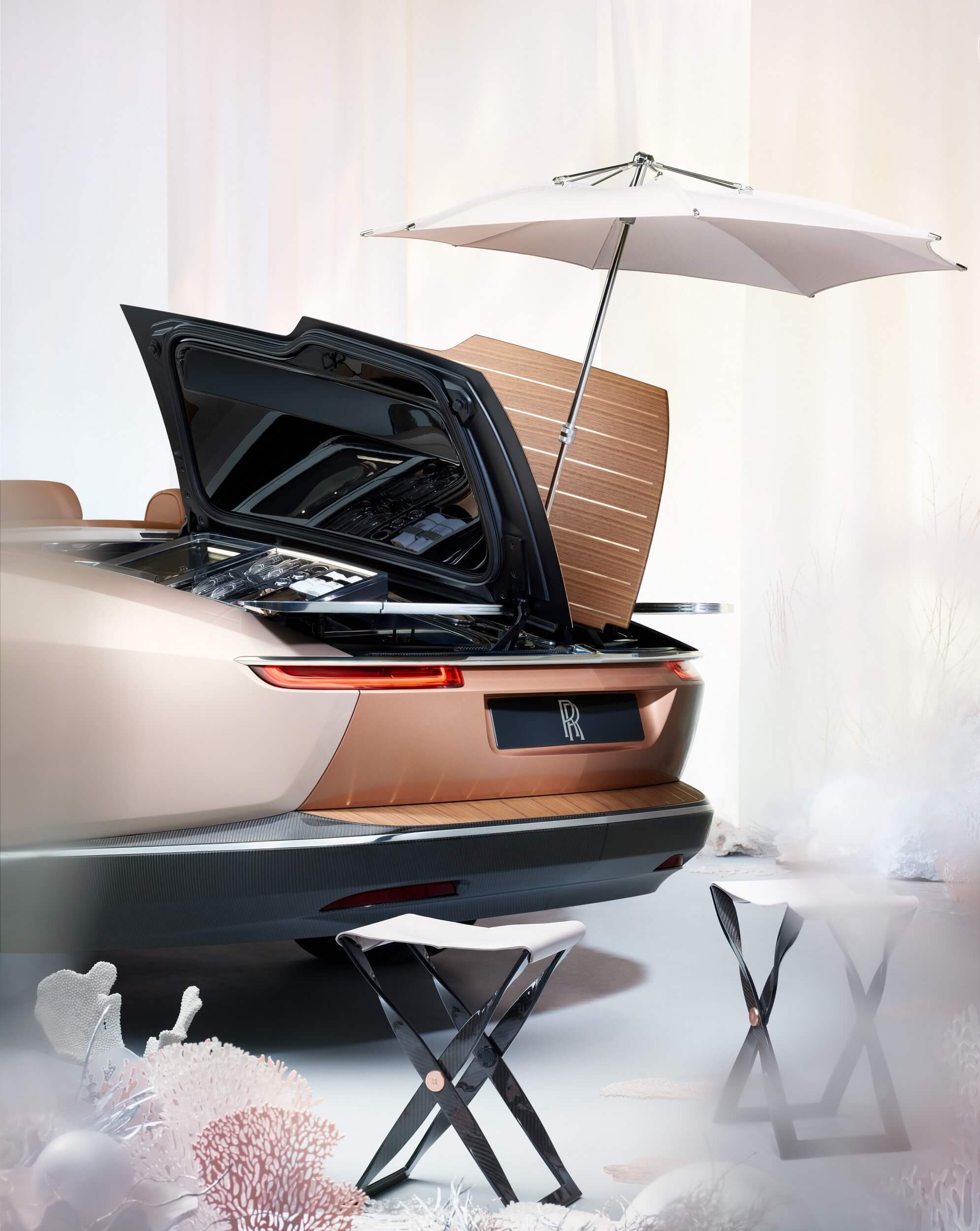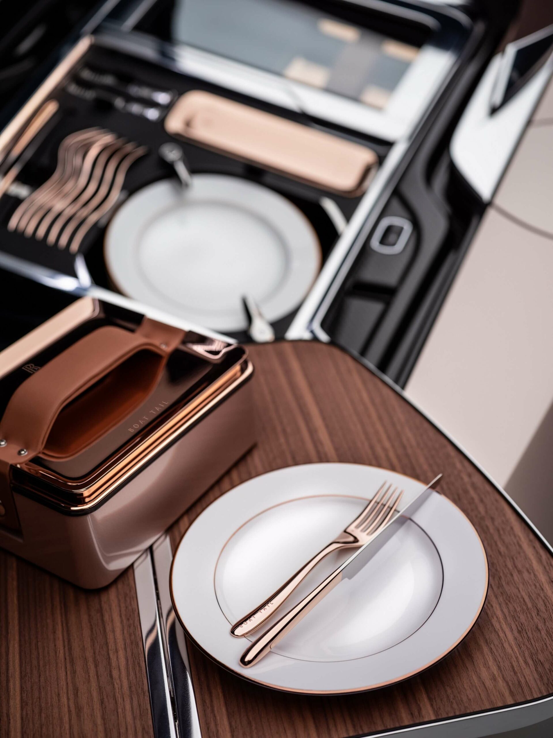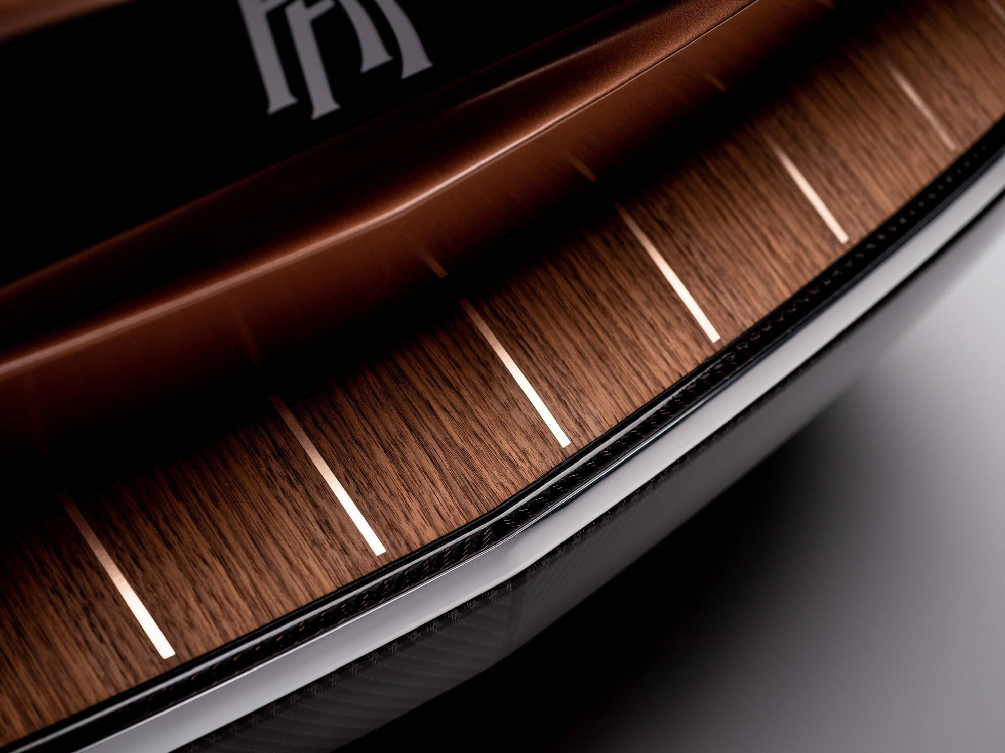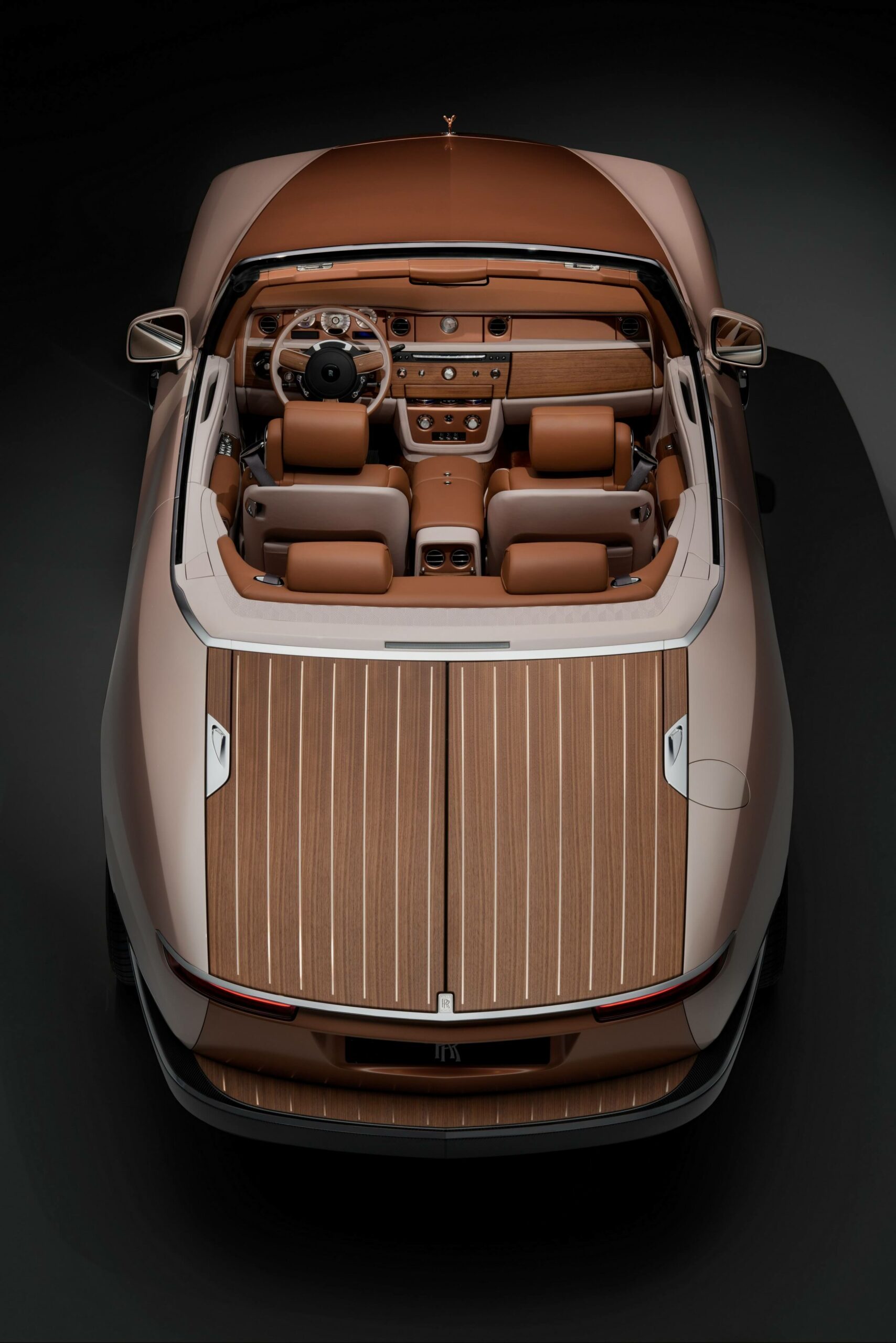 At the back, the “butterfly” opening of the compartment has been retained and bathed in walnut veneer, complete with rose gold-plated pinstripes with a satin-brushed finish. Rolls-Royce explains the customer specifically commissioned the car with the Royal Walnut since it will change its properties over time, meaning that as it matures, the cognac will look different.