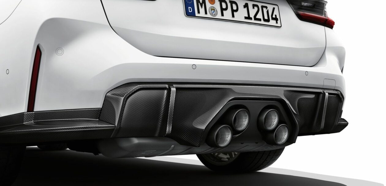 Here are the really juicy bits, though. If you want your BMW M3 Touring to genuinely look, sound, and feel special, these three upgrades will make a real difference. For starters, there will be an upgraded exhaust system. The M Performance exhaust comes with the semi-stacked, central design and a new rear bumper to accommodate it. The new exhaust system and silencer are made from titanium, so it not only improves the sound but it shaves seven kg (15 lbs).