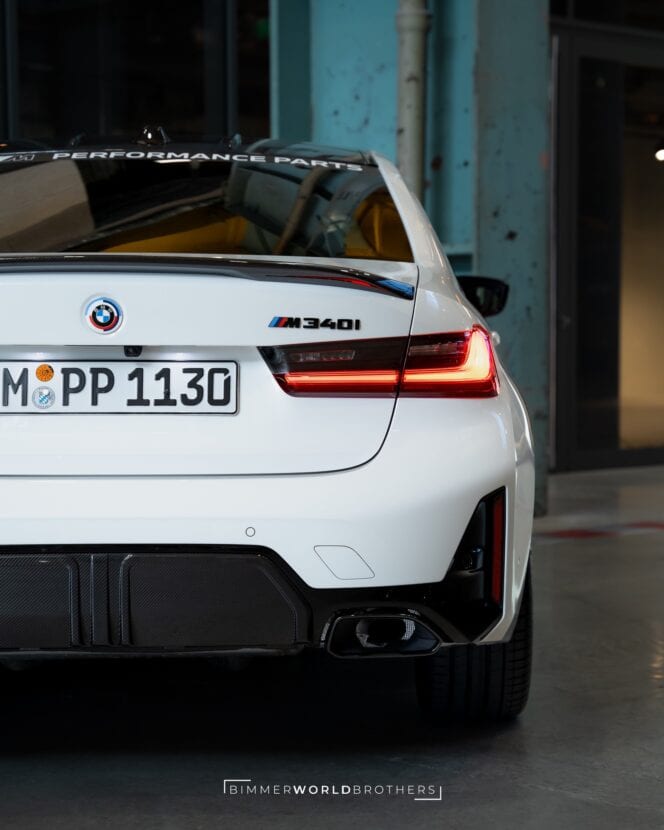 These new M Performance parts are pretty much the same as the pre-LCI car, only with a few changes. You can get carbon fiber grille trim, some snazzy new decals, larger wheels, a new rear “diffuser,” a rear lip spoiler, and even a red tow strap on the front, like a track car. That seems a bit overly ambitious for an M340i but to each their own.