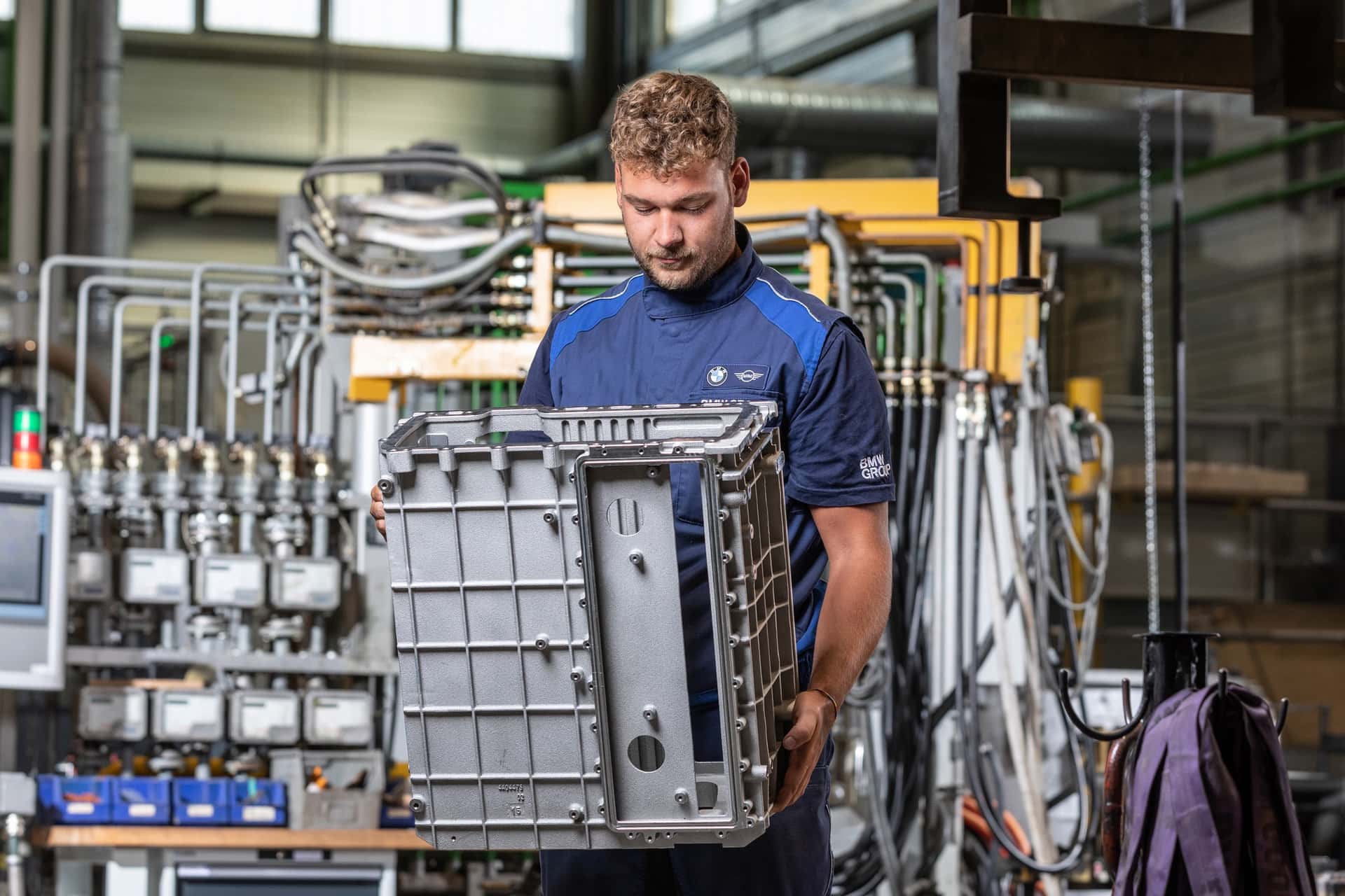 Stacking of the fuel cells is a fully automated process. Once the individual components have been inspected for any damage, the stack is compressed by machine with a force of five tonnes and placed in a housing. The stack housing is manufactured in the light metal foundry at BMW Group Plant Landshut using a sand casting technique. For this, molten aluminium is poured into a mould made from compacted sand mixed with resin in a process specially designed for this small-series vehicle. The pressure plate, which delivers hydrogen and oxygen to the fuel cell stack, is made from cast plastic parts and light-alloy castings, also from the Landshut plant. The pressure plate forms a gas-tight and water-tight seal around the stack housing.