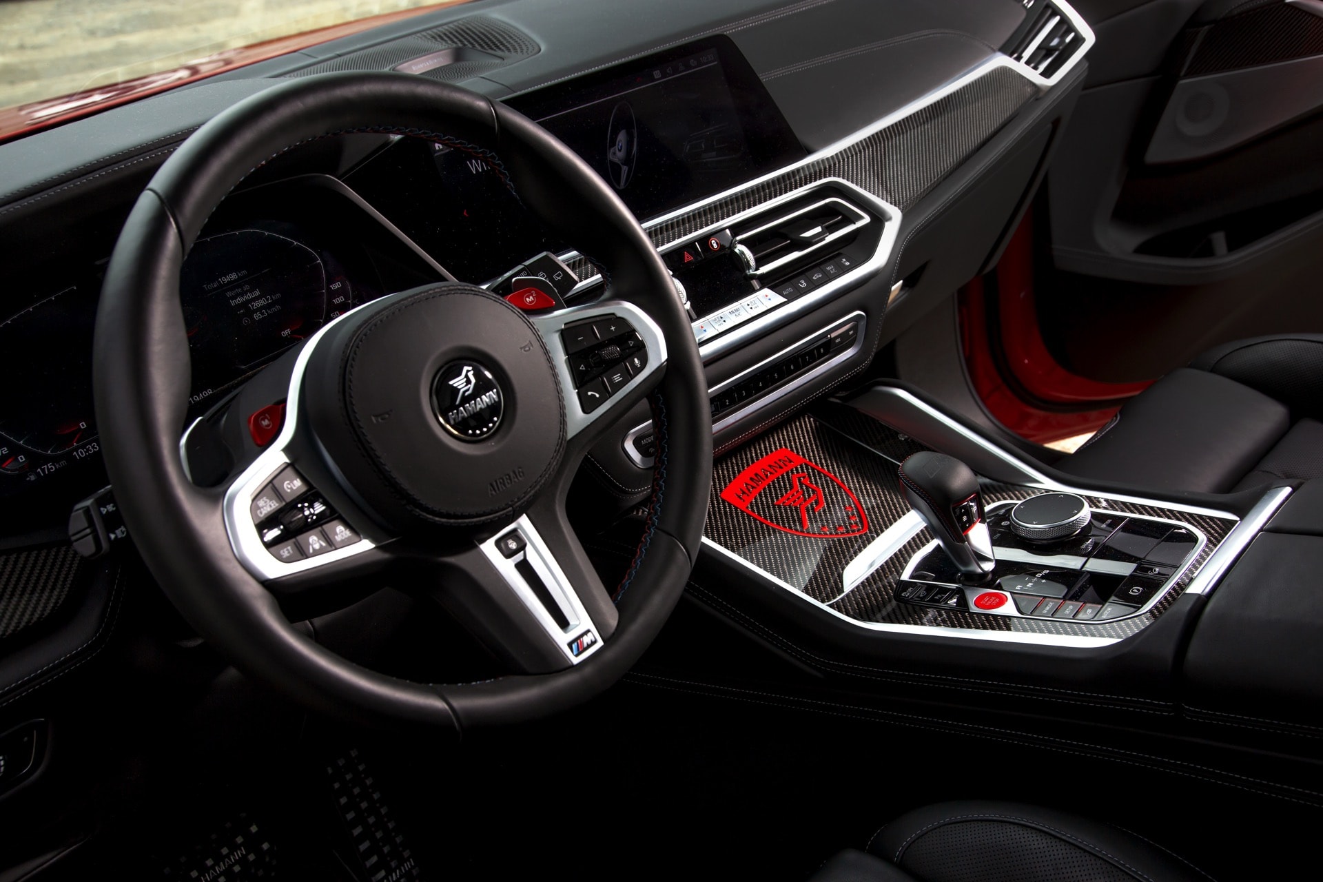Inside, you will find the red Hamann logo on the cover in front of the gear lever and the BMW roundel on the steering wheel has also been replaced by a Hamann emblem. The individuality is further underlined by exclusive pedals, footrests and floor mats. When you exit the car, the LED door projectors with the HAMANN logo are a real eye-catcher. The trunk is also protected by custom Hamann floor mats.