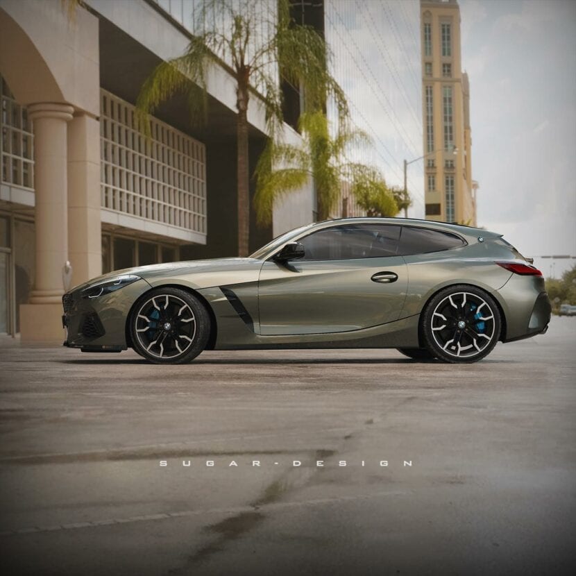 This rendering shows a futuristic BMW Z4 M40i Shooting Brake with an extremely sleek side and rear view. Aside from the gorgeous roofline and the nicely designed boot, this Z4 M40 Shooting Brake also stands out with the BMW logos on the rear side panels. The rear end also gets some massive fenders which match perfectly the aggressive rear bumper.