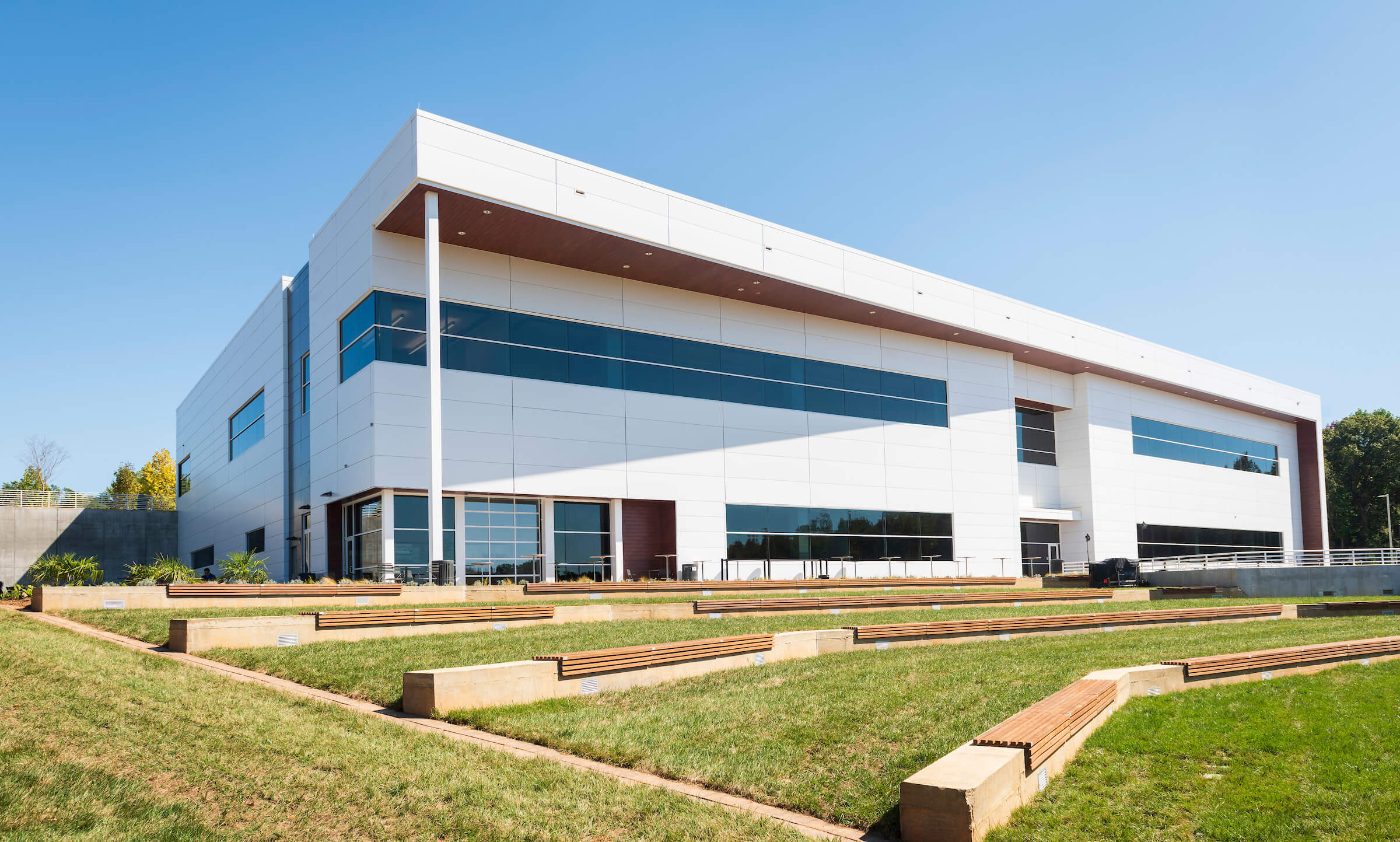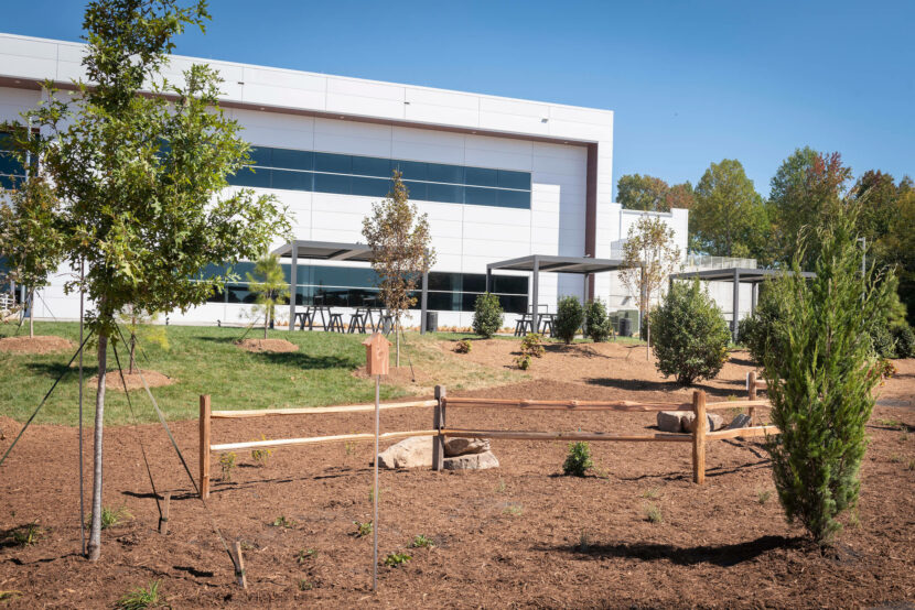 Behind the new building, 106 trees from eight native species have been planted in collaboration with TreesUpstate to mark 106 years of the BMW Group. Some of the furniture used inside the building uses wood sourced from the trees that had to be cut down to prepare the surface.