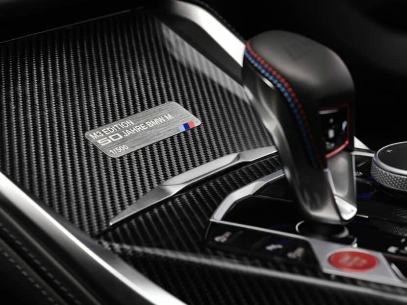 Being a 2023 model year, the anniversary M3 has BMW’s new iDrive 8 with the 12.3-inch digital instrument cluster sitting next to the 14.9-inch touchscreen housed within a single piece of curved glass. To set it apart from the regular M3, there’s “Edition 50 Jahre BMW M” lettering on the door sill trims. It’s repeated on the aluminum plaque positioned below the dashboard where it also says “1/500” to denote it’s a limited production car.