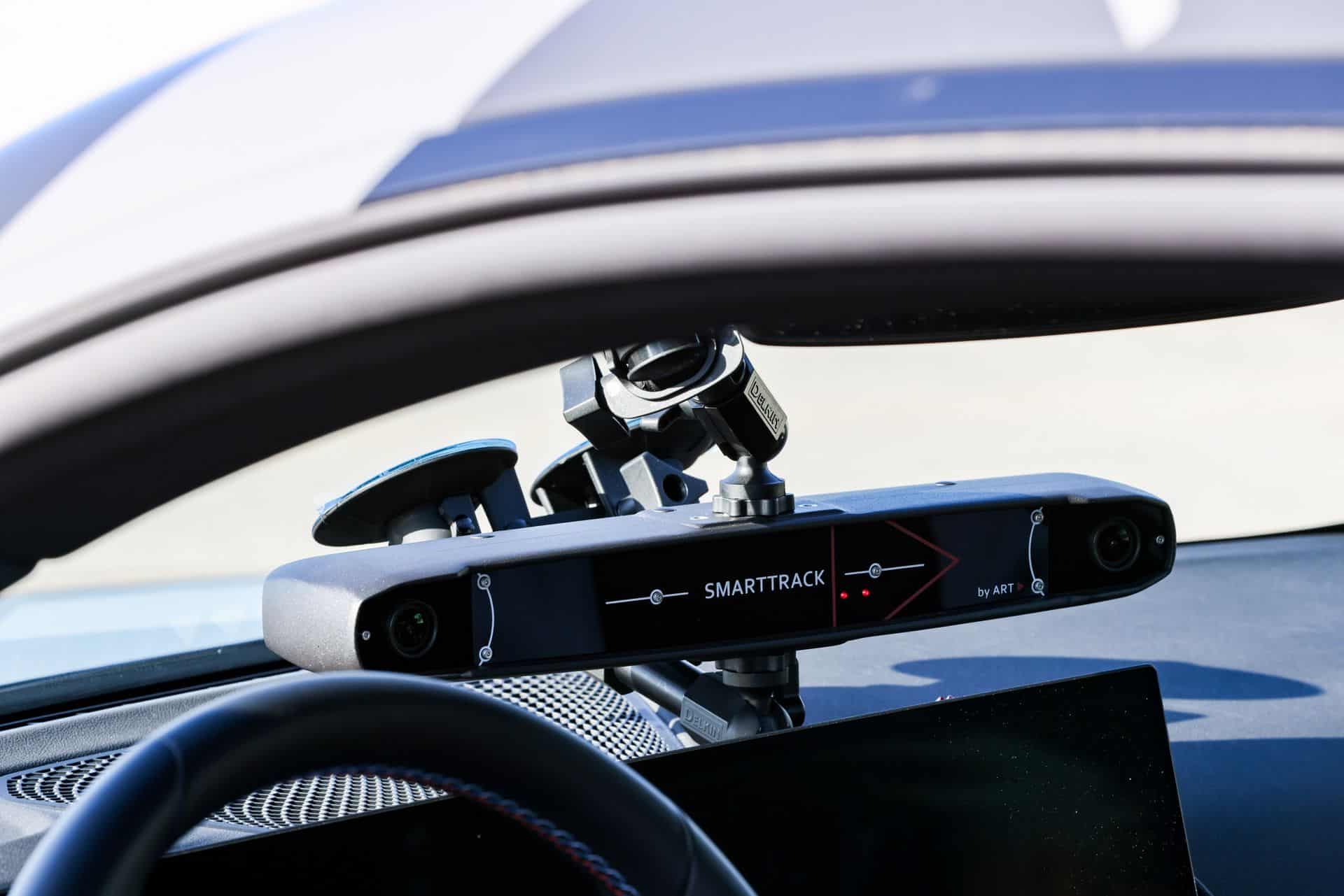 Varjo is the company that makes the headset but Art is the company that makes the tracking bar, which tracks the driver’s head movements. There are countless sensors and GPS tracking, so the system knows exactly what the car is doing, where it’s going, and where it is, so it can safely allow you to drive through a track that’s both digital and physical.