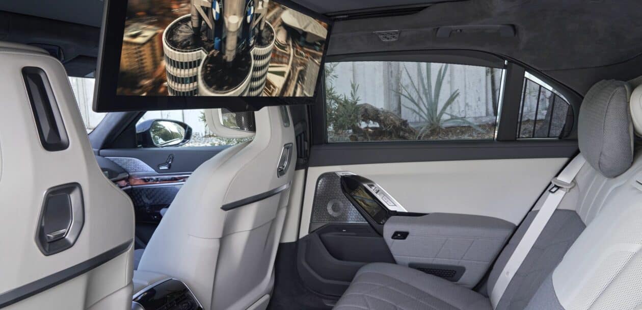 All of the 7 Series’ we had on test were equipped with the now-famous rear theater package. That provides a massive 31-inch, 8k touchscreen that drops down from the ceiling to give rear passengers a theater screen. If you use the door screens to select Theater Mode, all the car’s sunshades close as the theater screen drops down, create a moody, theater like environment. It’s awesome.