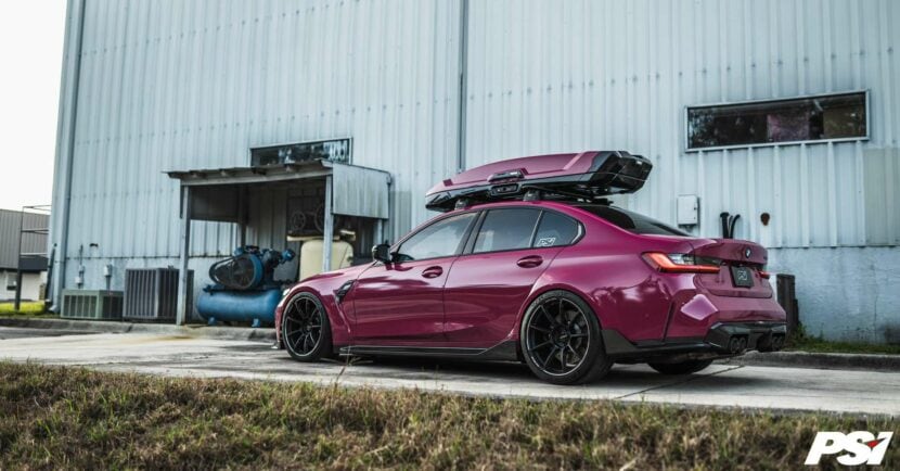 PSI wrapped the G80 M3 in Porsche’s Ruby Star color. Interestingly, PSI tried to get BMW to paint the M3 Competition in Ruby Star from the factory, through the Individual program. However, that didn’t work out. So they decided to take matter in their own hands by wrapping the car. Of course, Ruby Star color is quite eye-catching and the color-matched Thule roof box is a nice touch. The vibrant reddish/pinkish color works well with the carbon fiber accents and black Rays wheels.