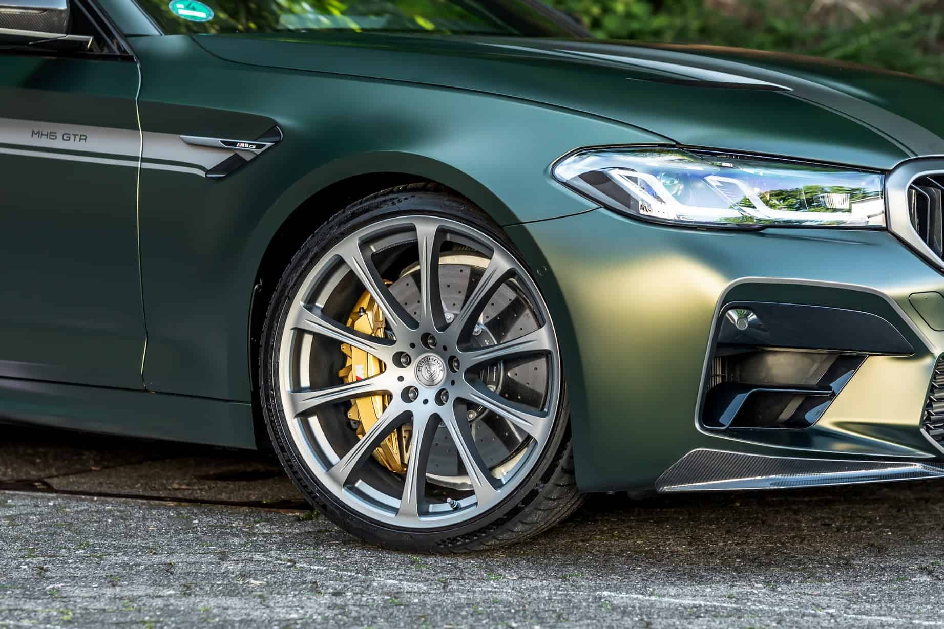The MH5 GTR package tailored to the high-performance saloon is further modified with a KW coilover suspension and custom 21-inch wheels wrapped in 265/30 ZR21 front and 305/25 ZR21 rear Michelin tires. The alloys come painted in silver grey with a matte finish as seen here, but Manhart will apply a different color should the customer demand it. White body decals and new floor mats round off the tweaks.