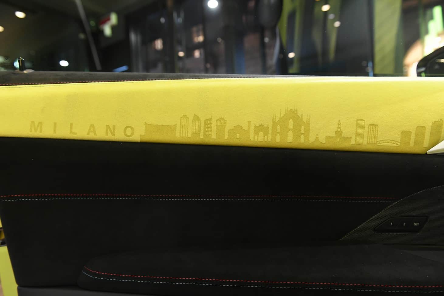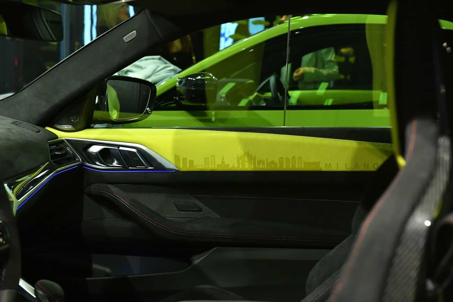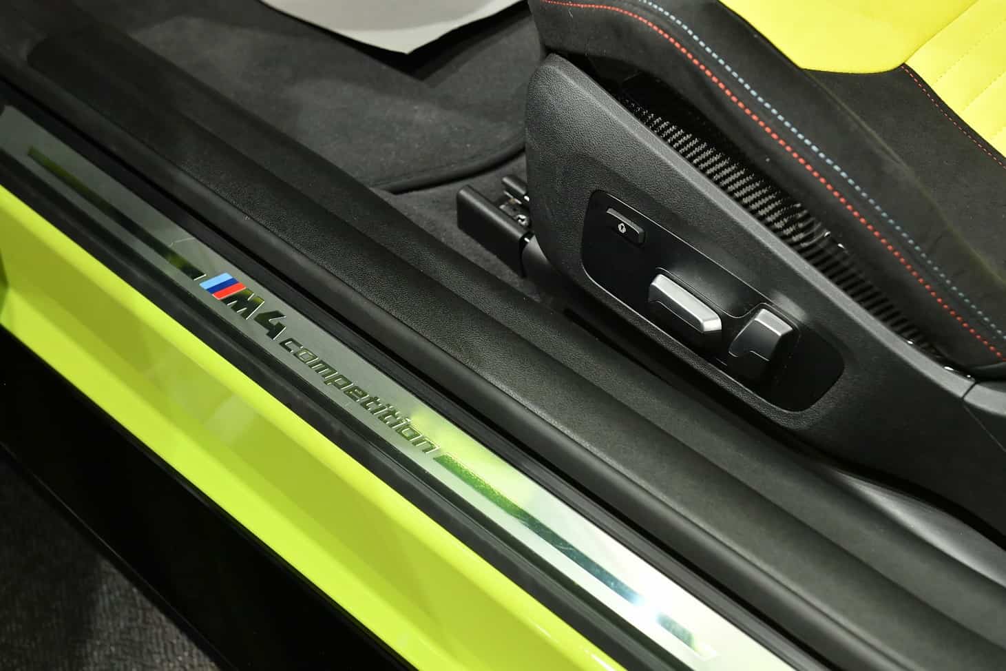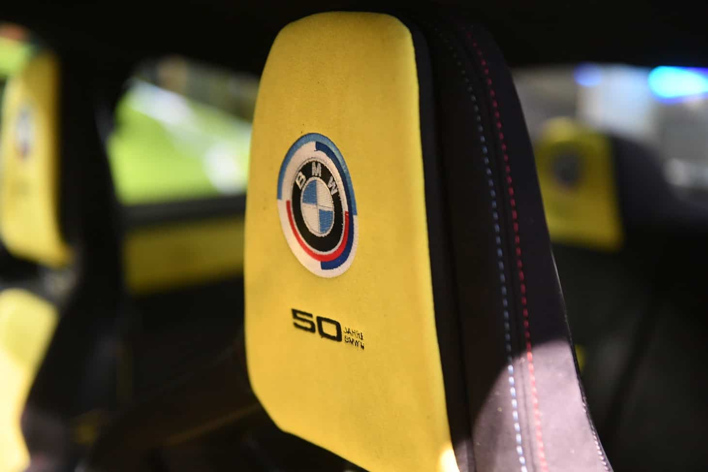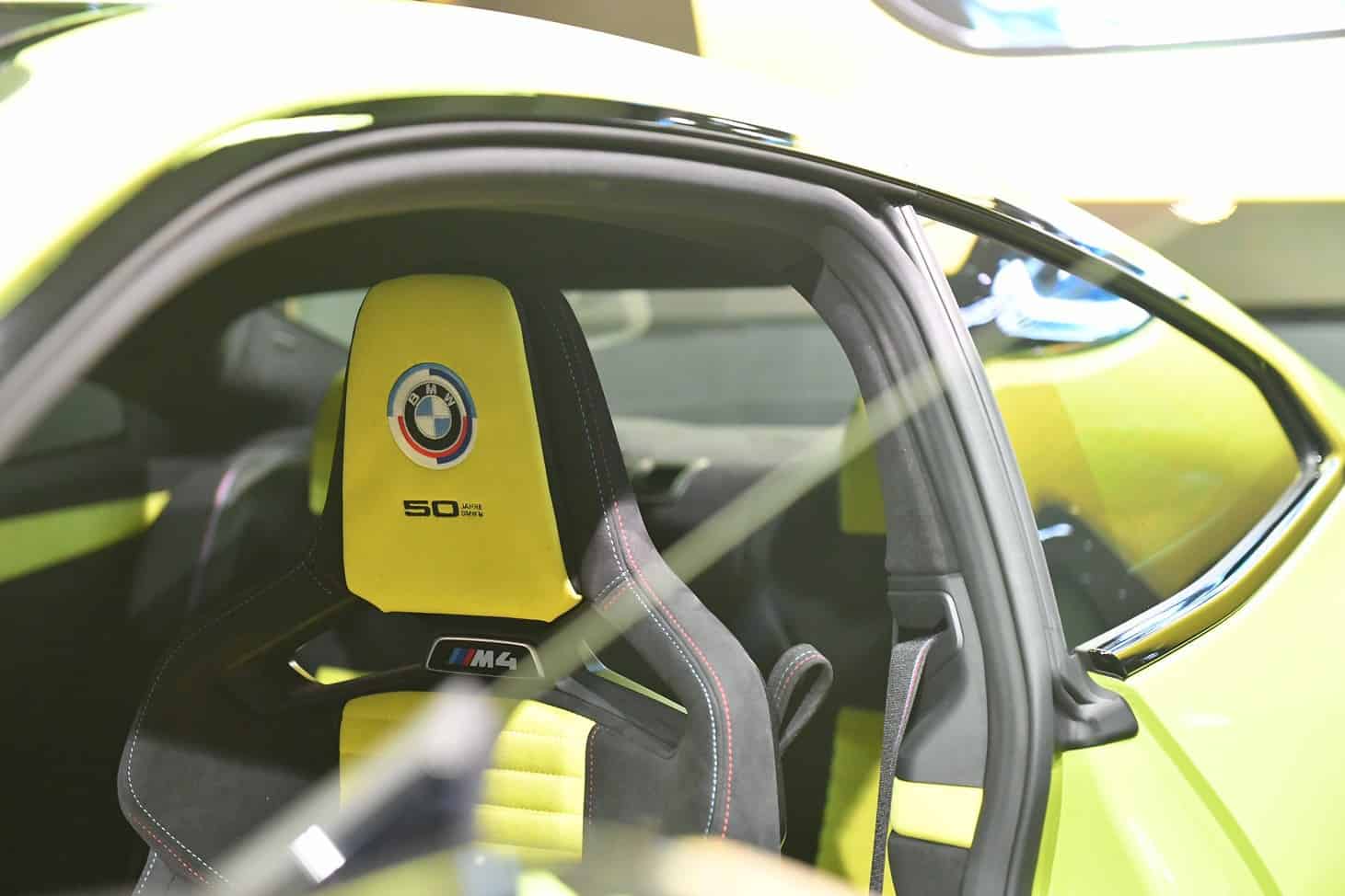 The door card has a lovely laser-engraved reproduction of the Milan skyline, where both BMW Italy and Alcantara have their headquarters. You’ll also notice the embroidered classic Motorsport logo on the headrests. The optional carbon bucket seats with their illuminated “M4” badge are further adorned by the “50 Jahre BMW M” lettering. Even the steering wheel column appears to have been covered with the fancy material.