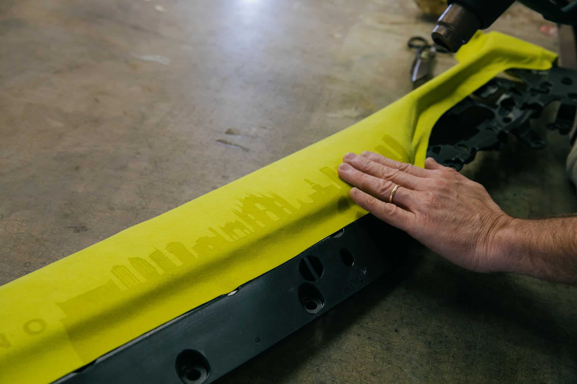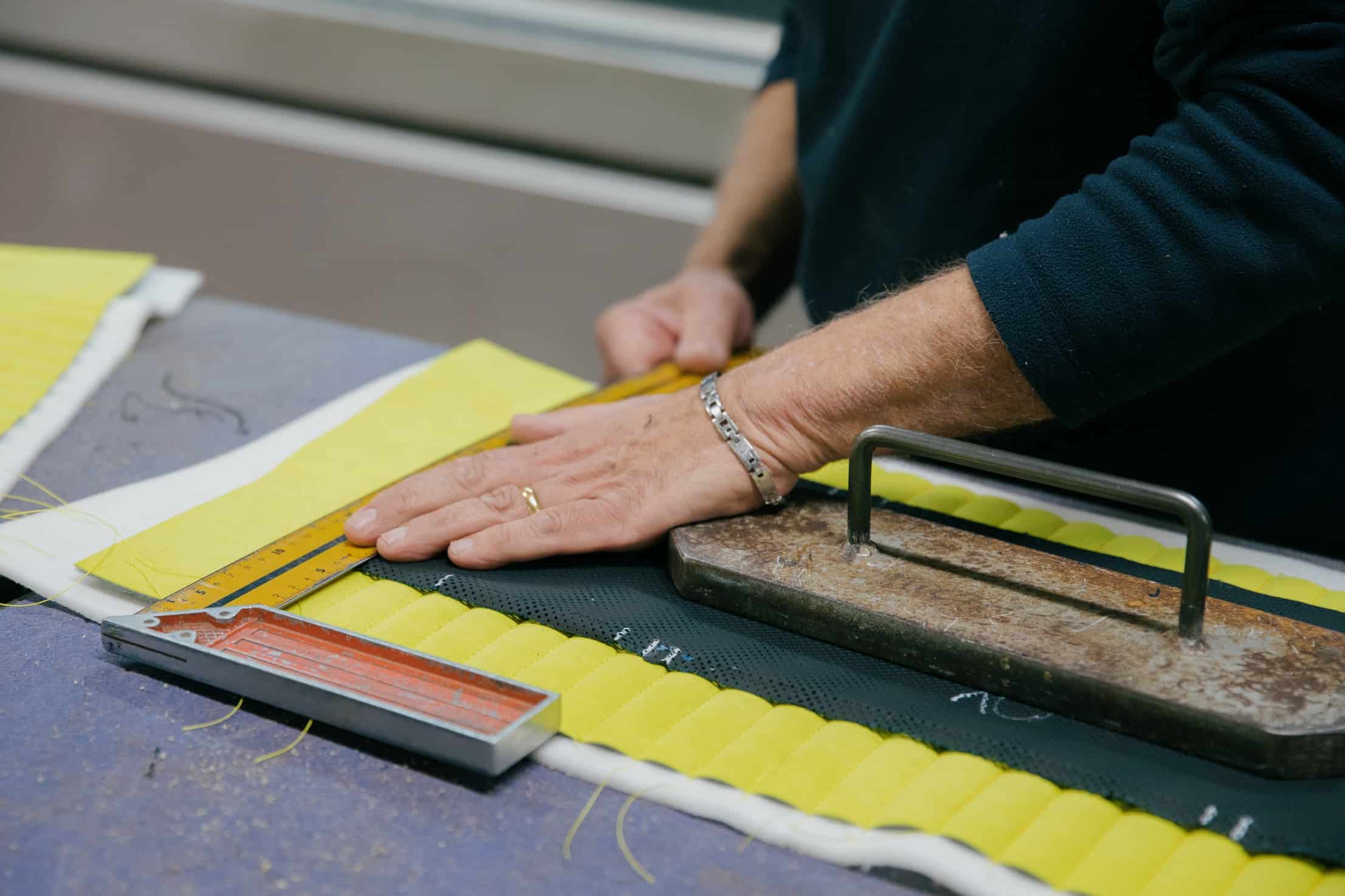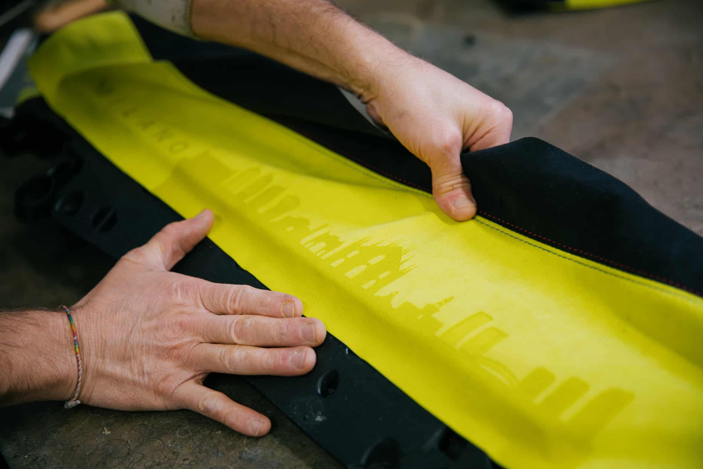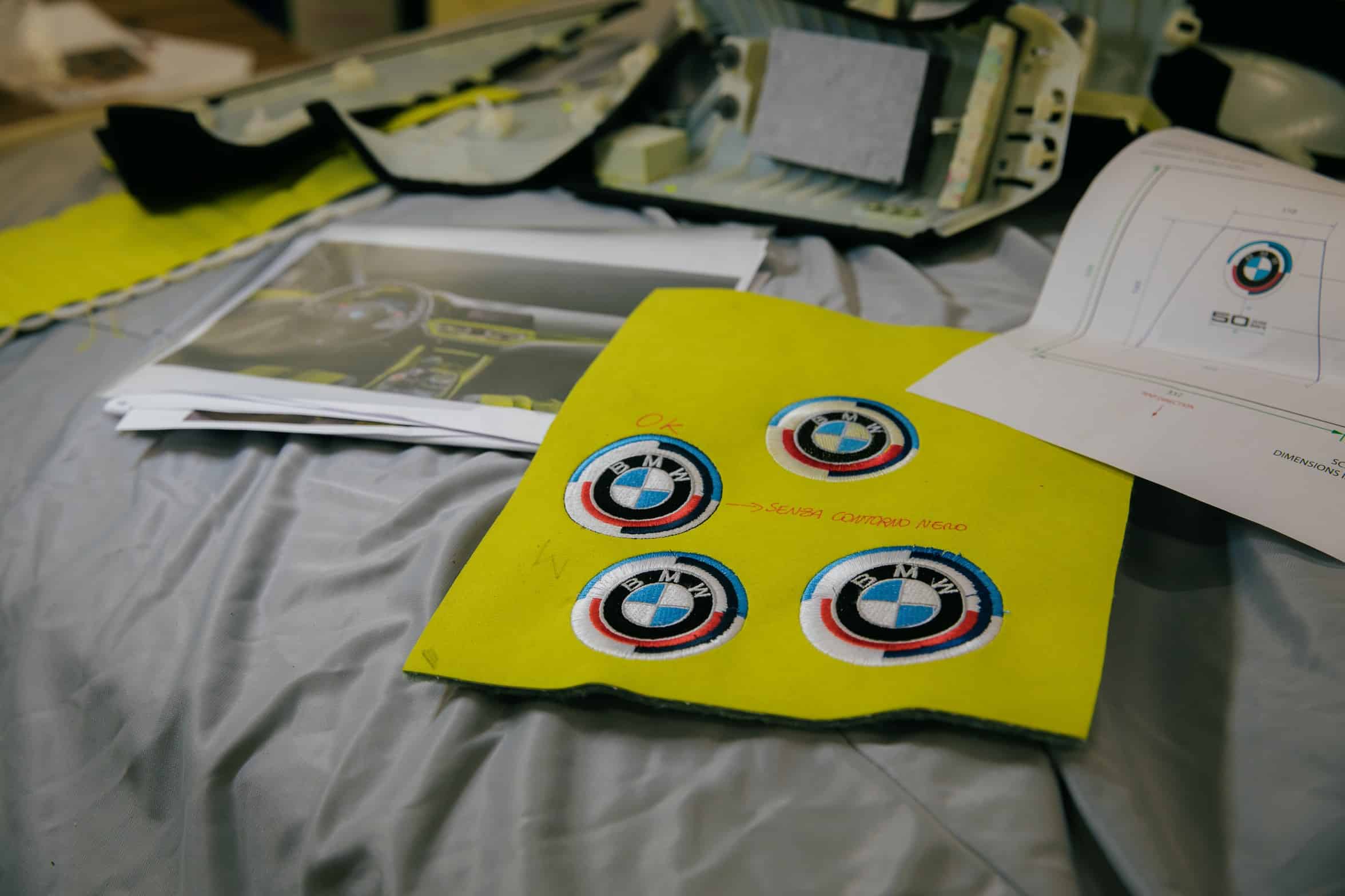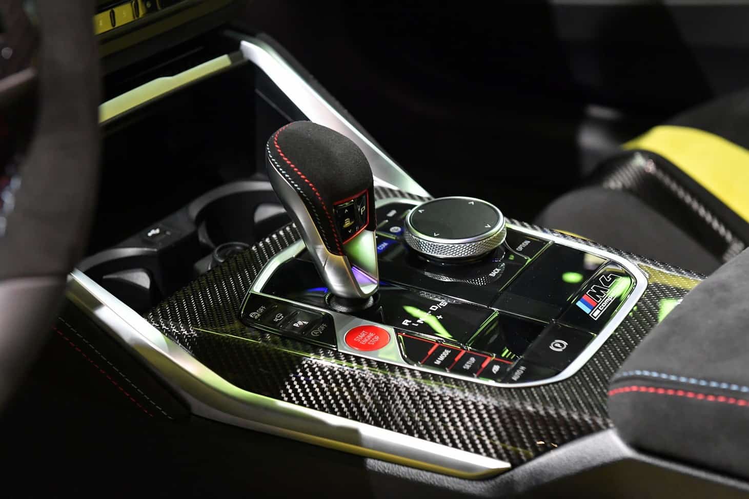 The door card has a lovely laser-engraved reproduction of the Milan skyline, where both BMW Italy and Alcantara have their headquarters. You’ll also notice the embroidered classic Motorsport logo on the headrests. The optional carbon bucket seats with their illuminated “M4” badge are further adorned by the “50 Jahre BMW M” lettering. Even the steering wheel column appears to have been covered with the fancy material.