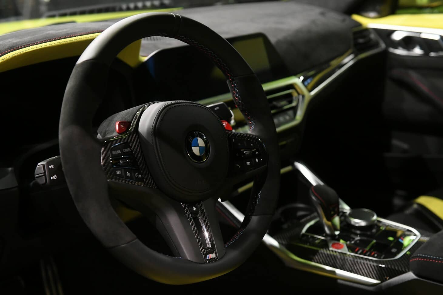 Made from 68% polyester and 32% polyurethane, the material has been applied just about everywhere you look. The seats, headliner, and pillars have all been wrapped in Alcantara, much like the black door panels with a body-colored upper panel and the typical M stitching for a contrasting effect. Since we mentioned the 2023 3.0 CSL earlier, the caned effect central seat and the weave on the door panel are inspired by the original Coupe Sport Lightweight from 1972.