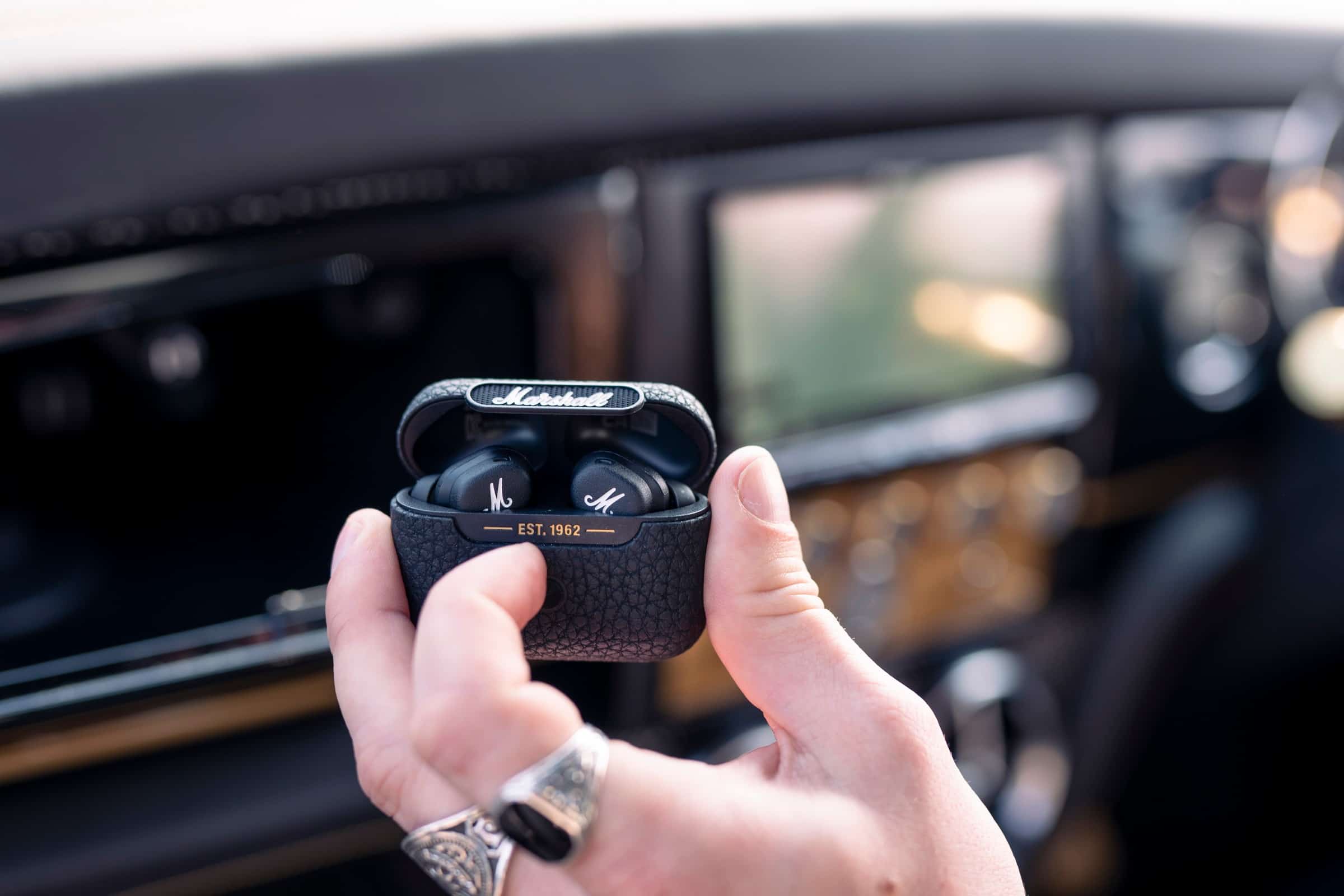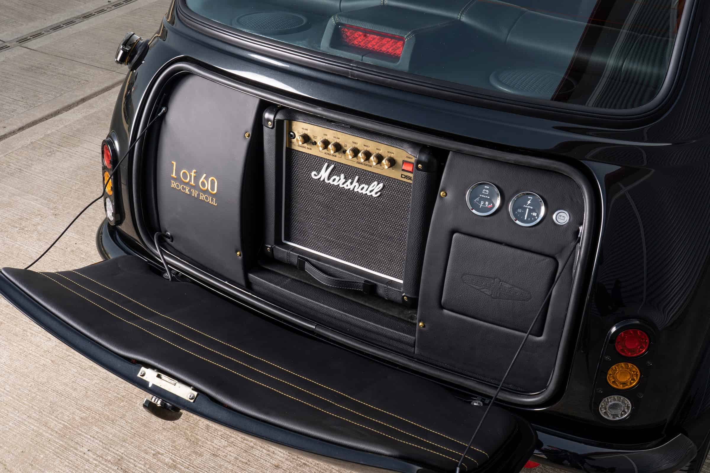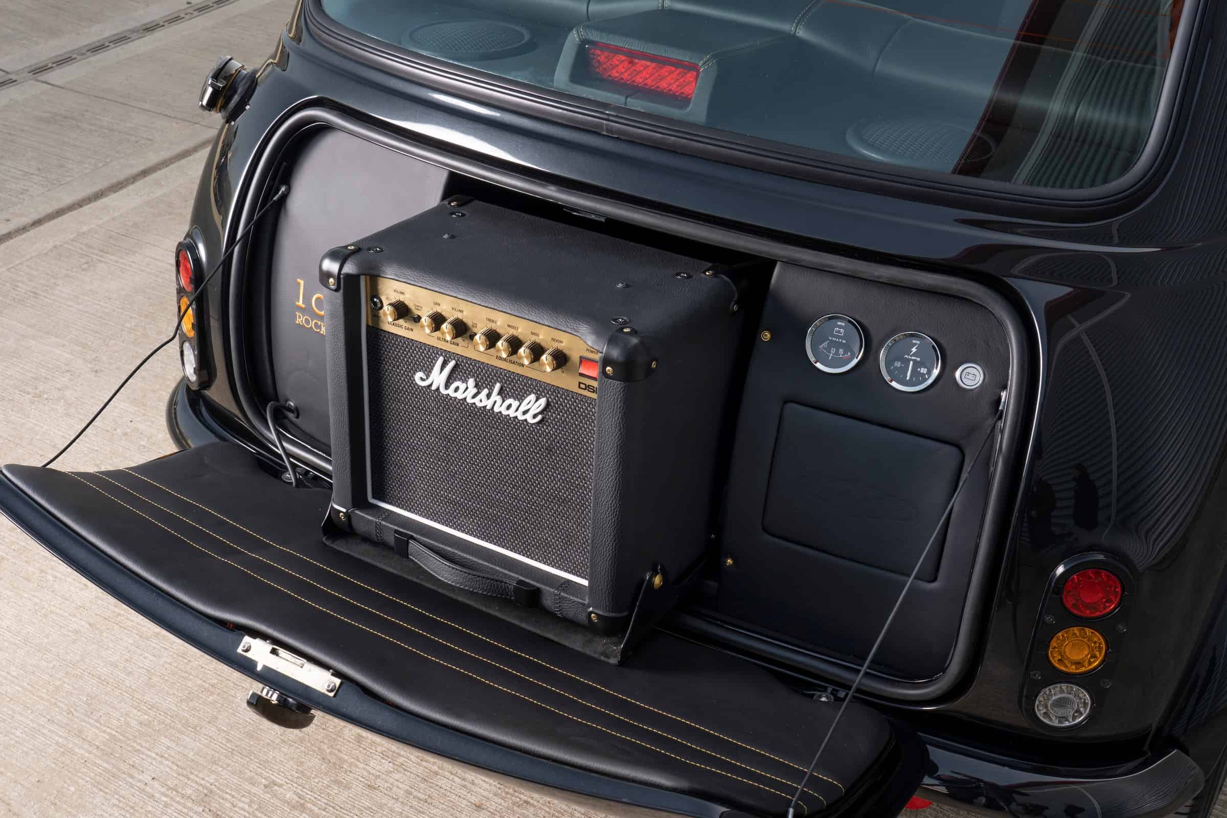 To earn its lengthy name, the classic Mini has a tailor-made Marshall sound system with dashtop-mounted tweeters, extra speakers in the doors, and custom hardware mounted on the rear parcel. Open the glovebox and you’ll find an inductive charging pad to juice up Marshall’s wireless headphones. The leather-lined cargo compartment hosts a slide-out amplifier (with a separate power supply) and a portable Bluetooth speaker.