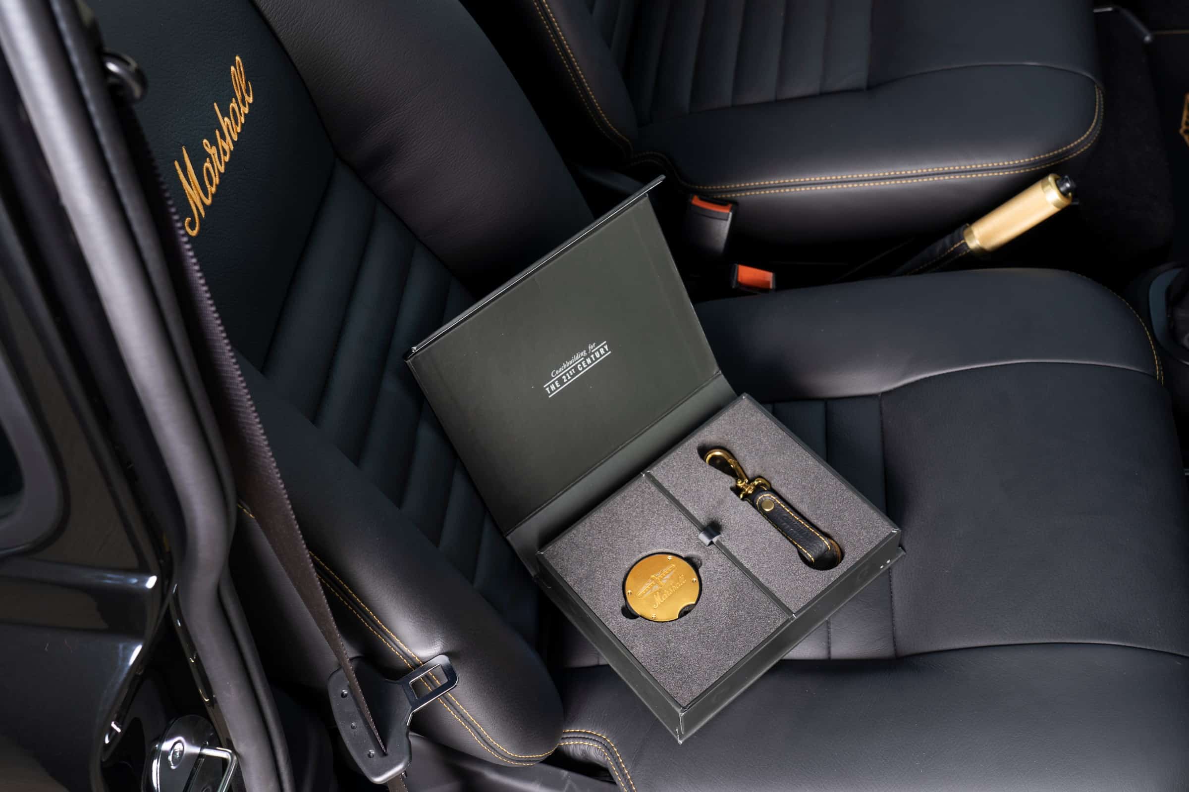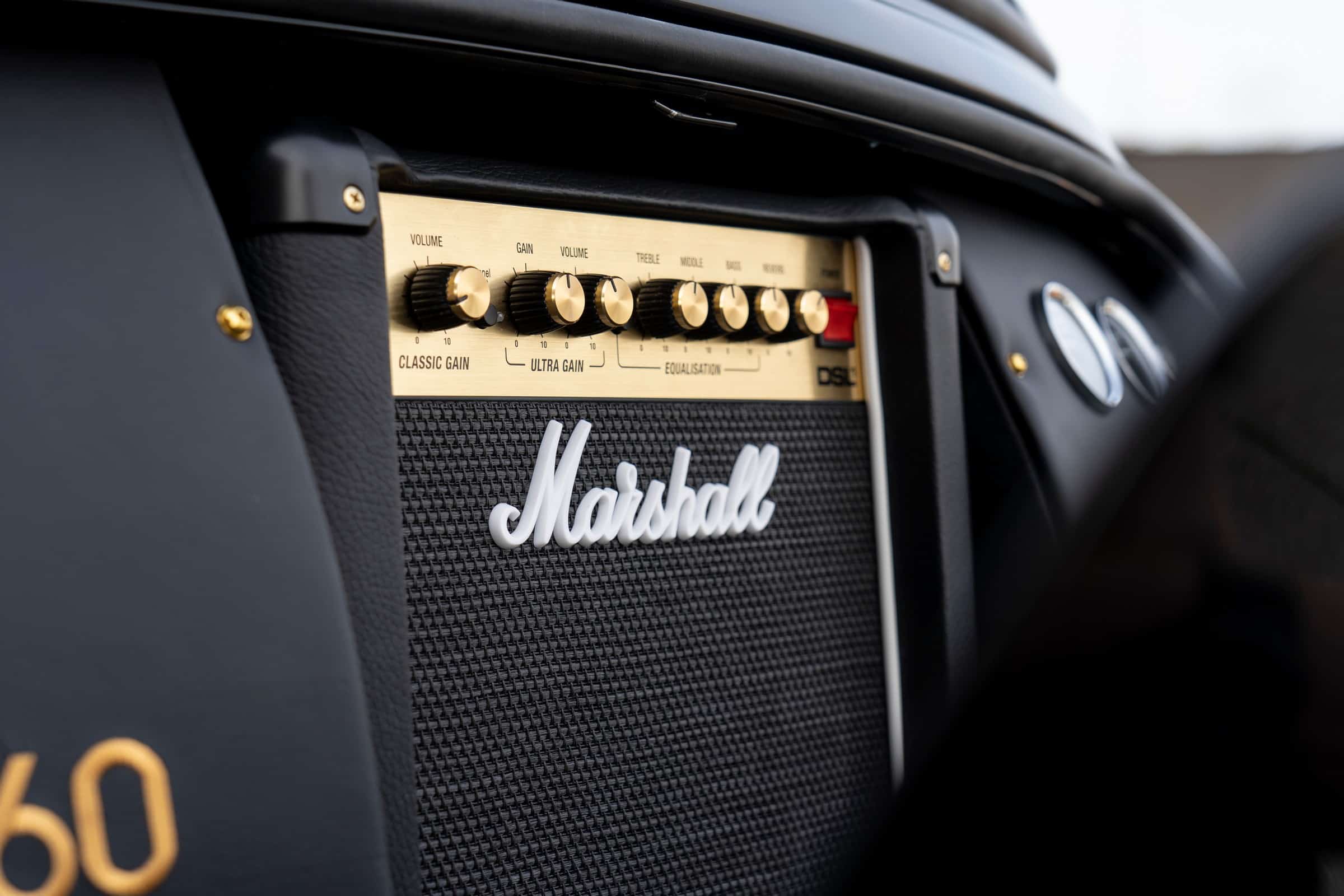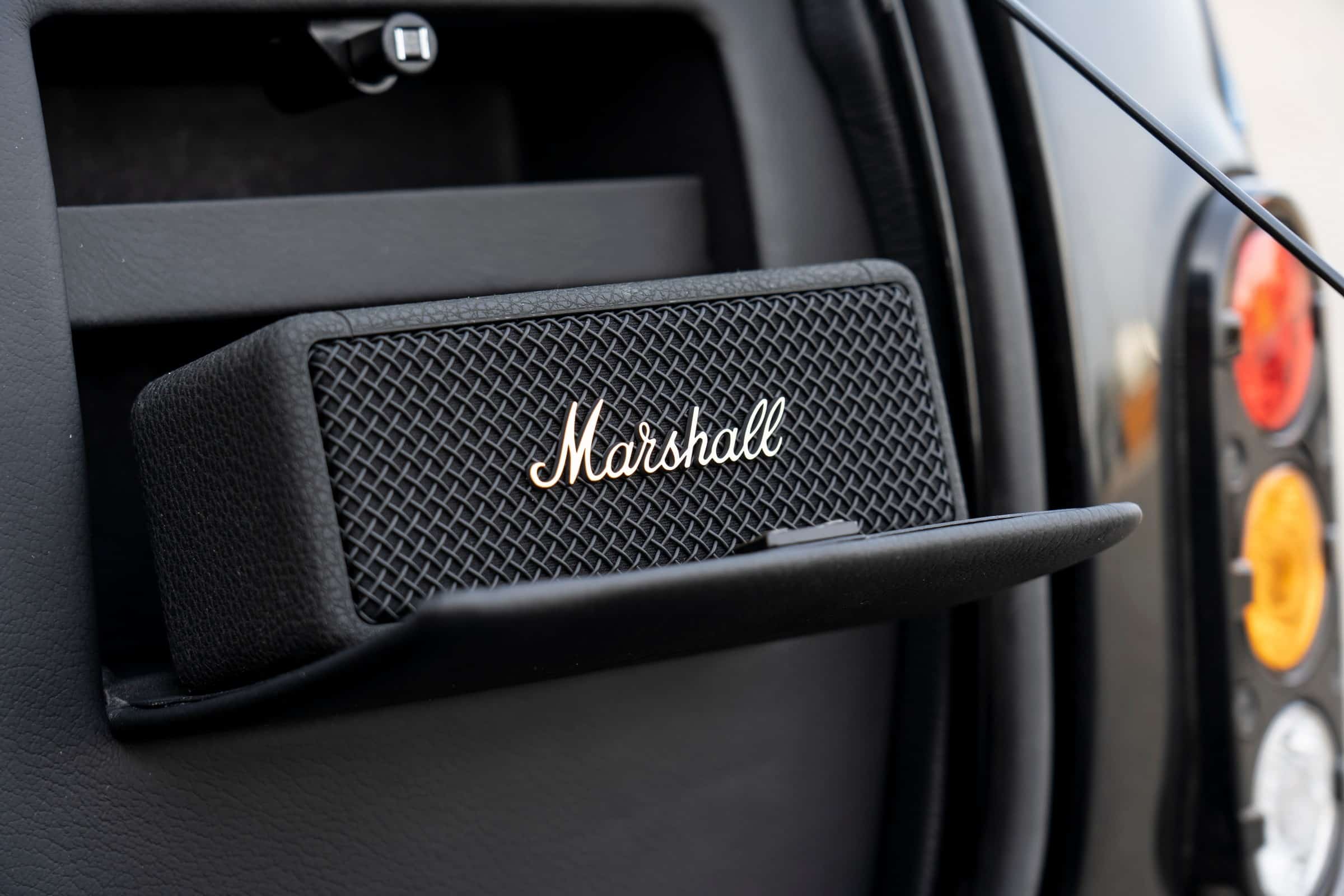 Stepping inside, there’s more of that gold for the revamped cabin as the striking color adorns the switchgear, center console, handbrake lever, door handles, and even the pedals where you’ll notice the skip track, pause, and play icons. As for the door cards, they’re covered in a special fabric serving as a visual nod to Marshall’s amplifiers. The seats are hand-trimmed in black leather with gold contrast stitching and “Marshall” logos embroidered on the backrests.