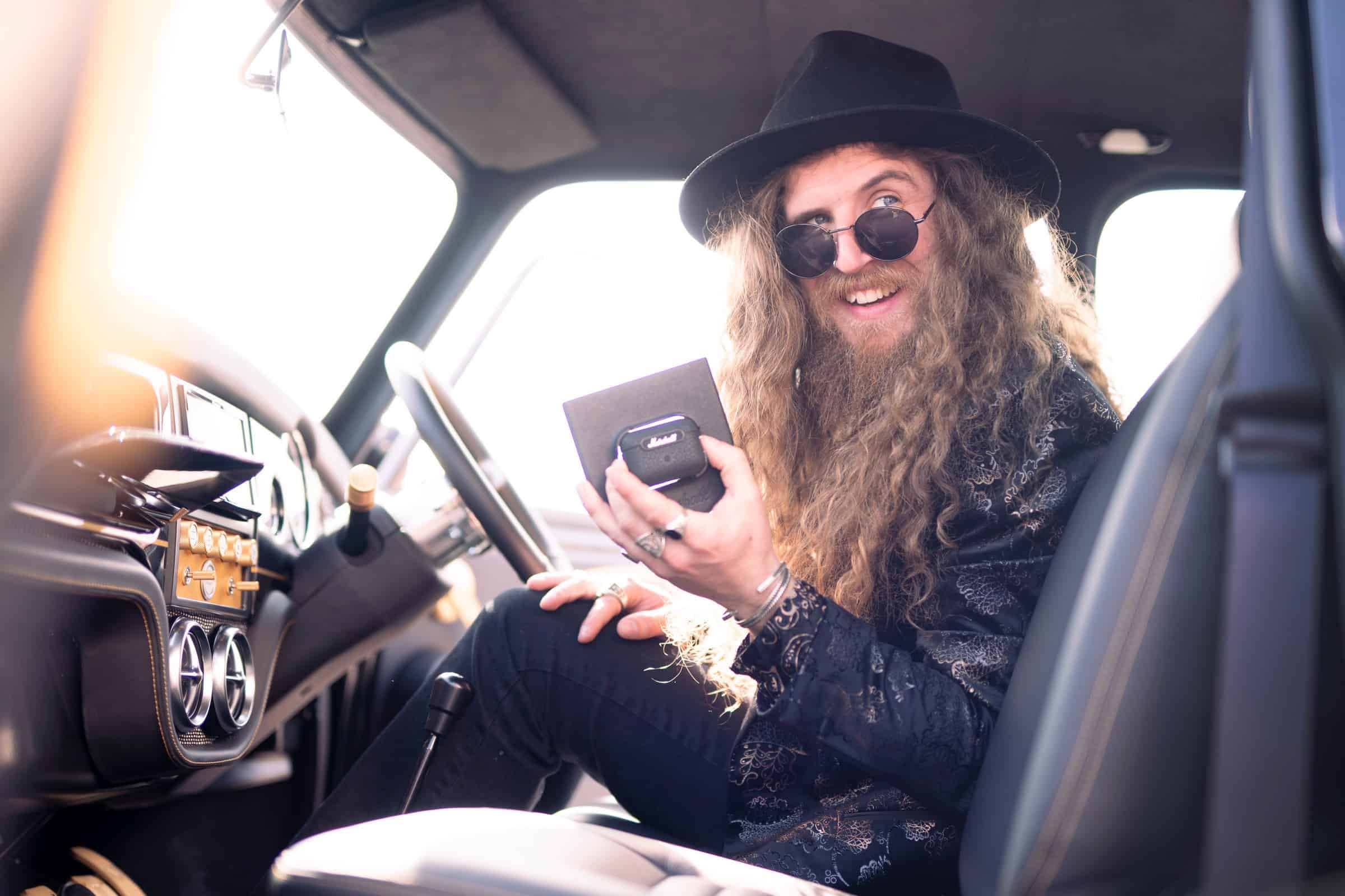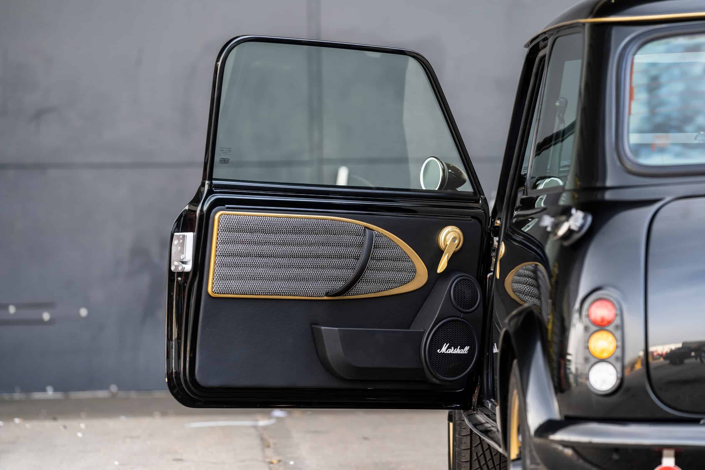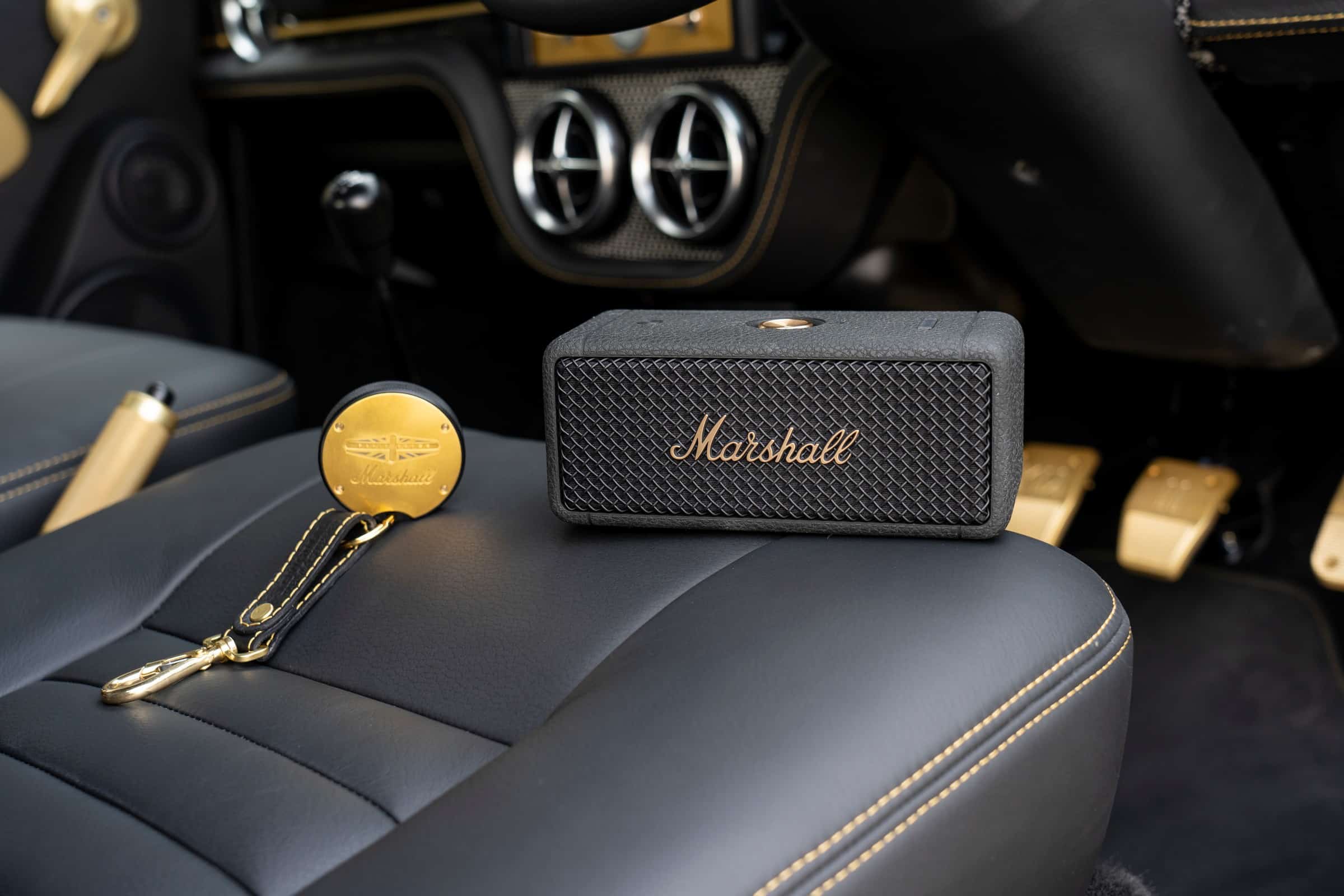 Stepping inside, there’s more of that gold for the revamped cabin as the striking color adorns the switchgear, center console, handbrake lever, door handles, and even the pedals where you’ll notice the skip track, pause, and play icons. As for the door cards, they’re covered in a special fabric serving as a visual nod to Marshall’s amplifiers. The seats are hand-trimmed in black leather with gold contrast stitching and “Marshall” logos embroidered on the backrests.