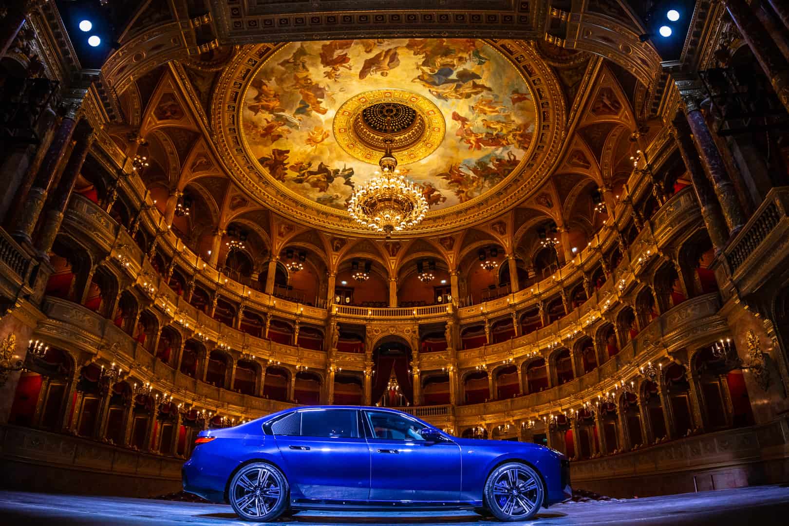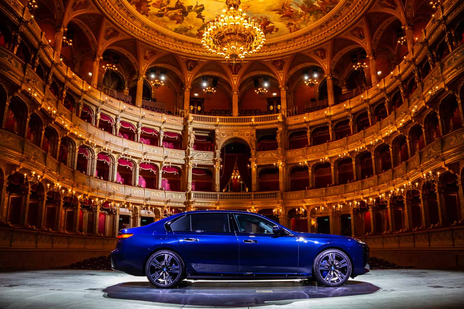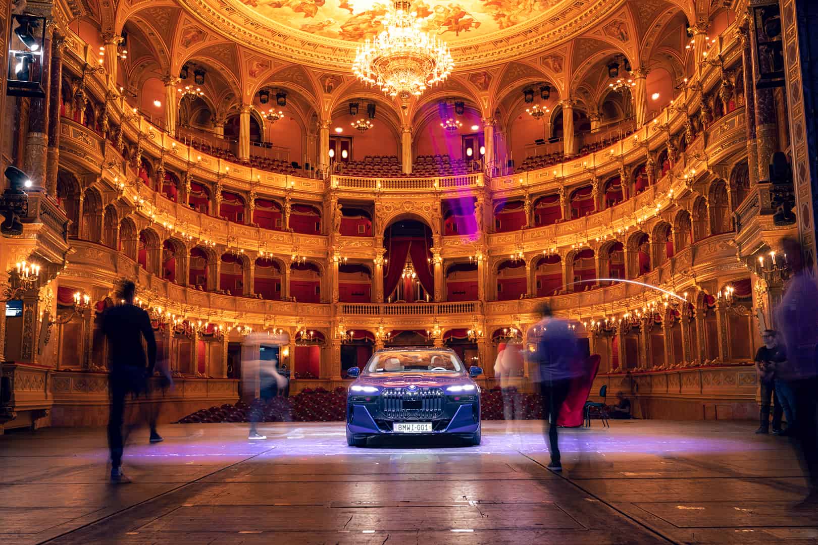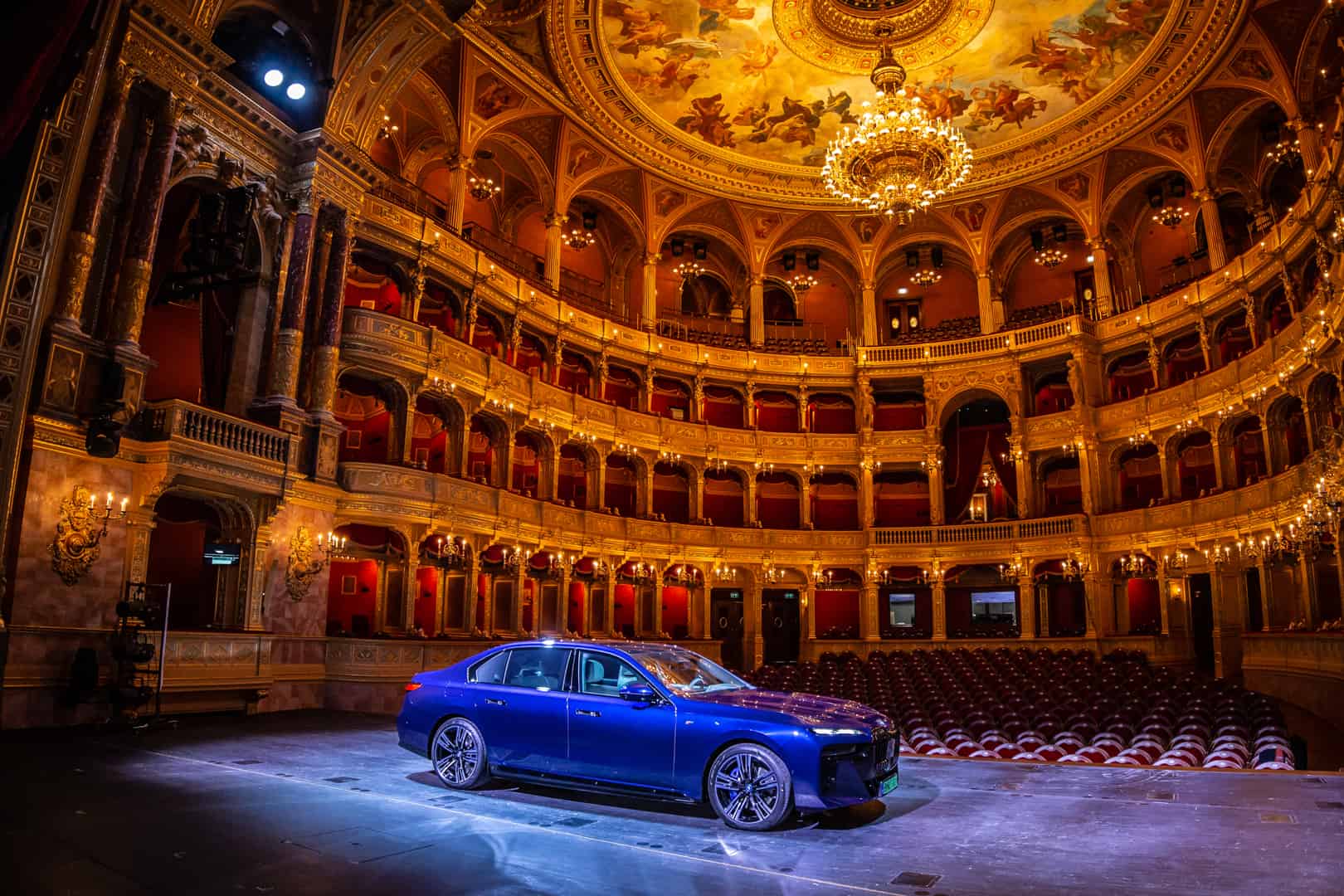 The inside of the Budapest Opera House is a breathtaking sight of 19th century architecture. The marble work, the wood work, that massive 3,050 kg (6,724 lb) chandelier, and the fresco of Greek gods all make a stunning sight. It also makes the BMW i7 delightfully incongruous. Not only is the i7’s design the furthest thing from elegant and sophisticated, with its massive grille, split headlights, and imposing size, but it’s also extremely high-tech. So it’s a drastic contrast between new and old worlds. I do hope they updated that stage since the 19th century, though, as I’m not quite sure it was originally designed to hold a nearly 6,000 lb car.
