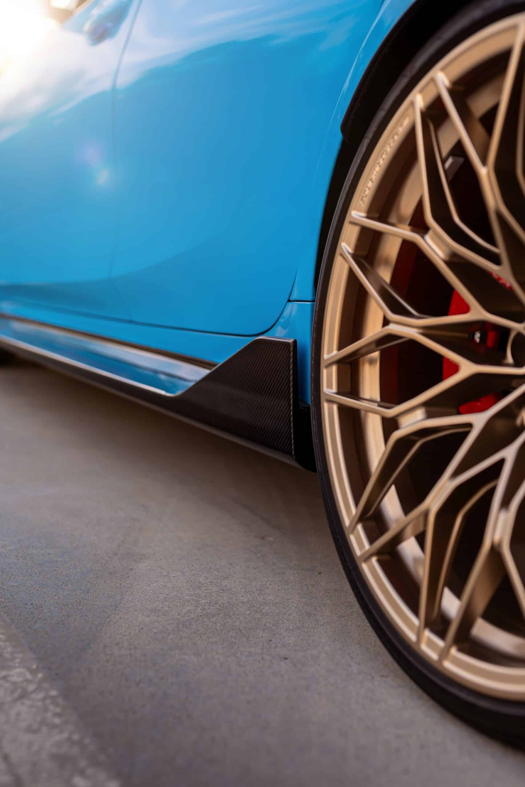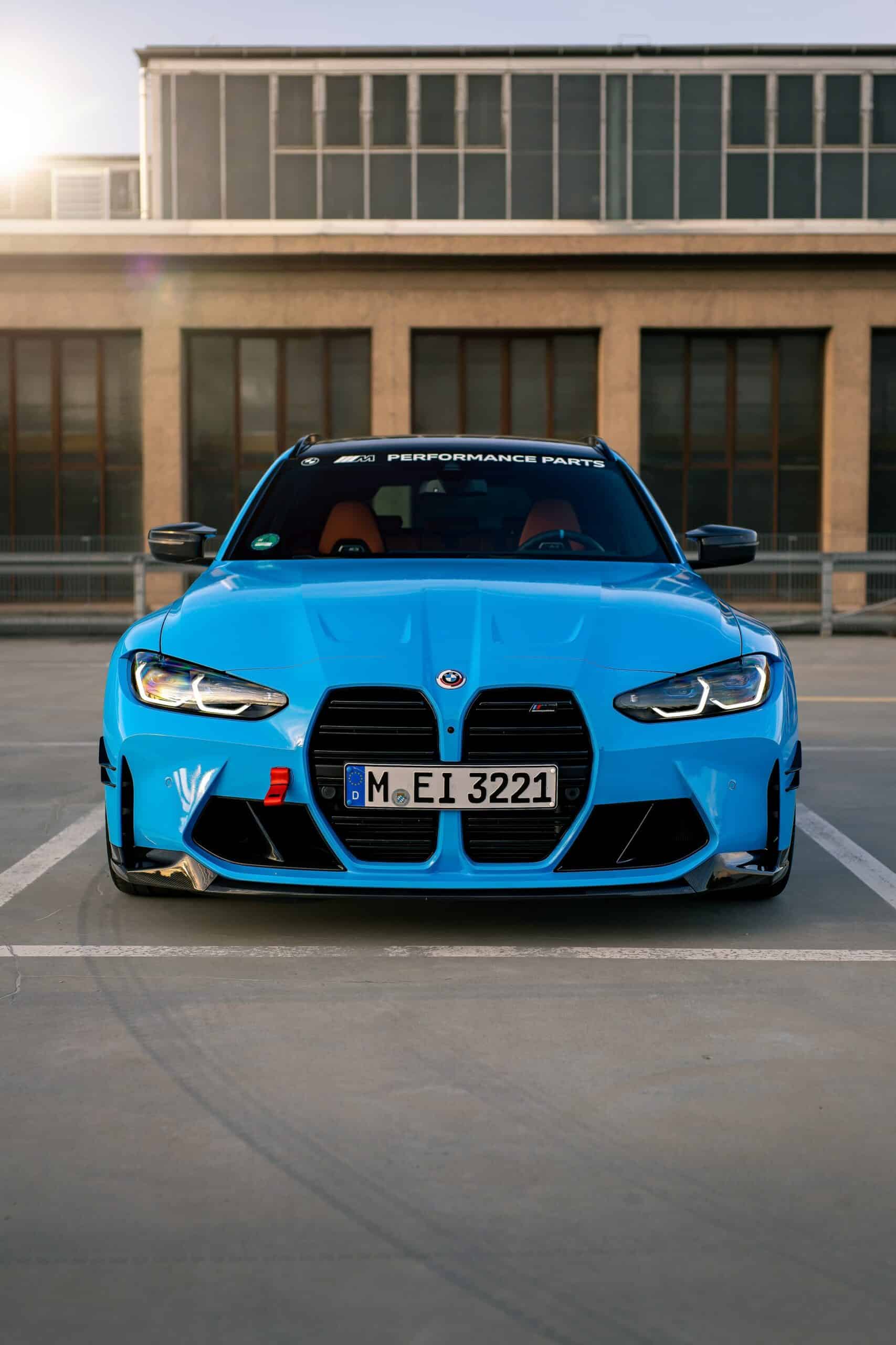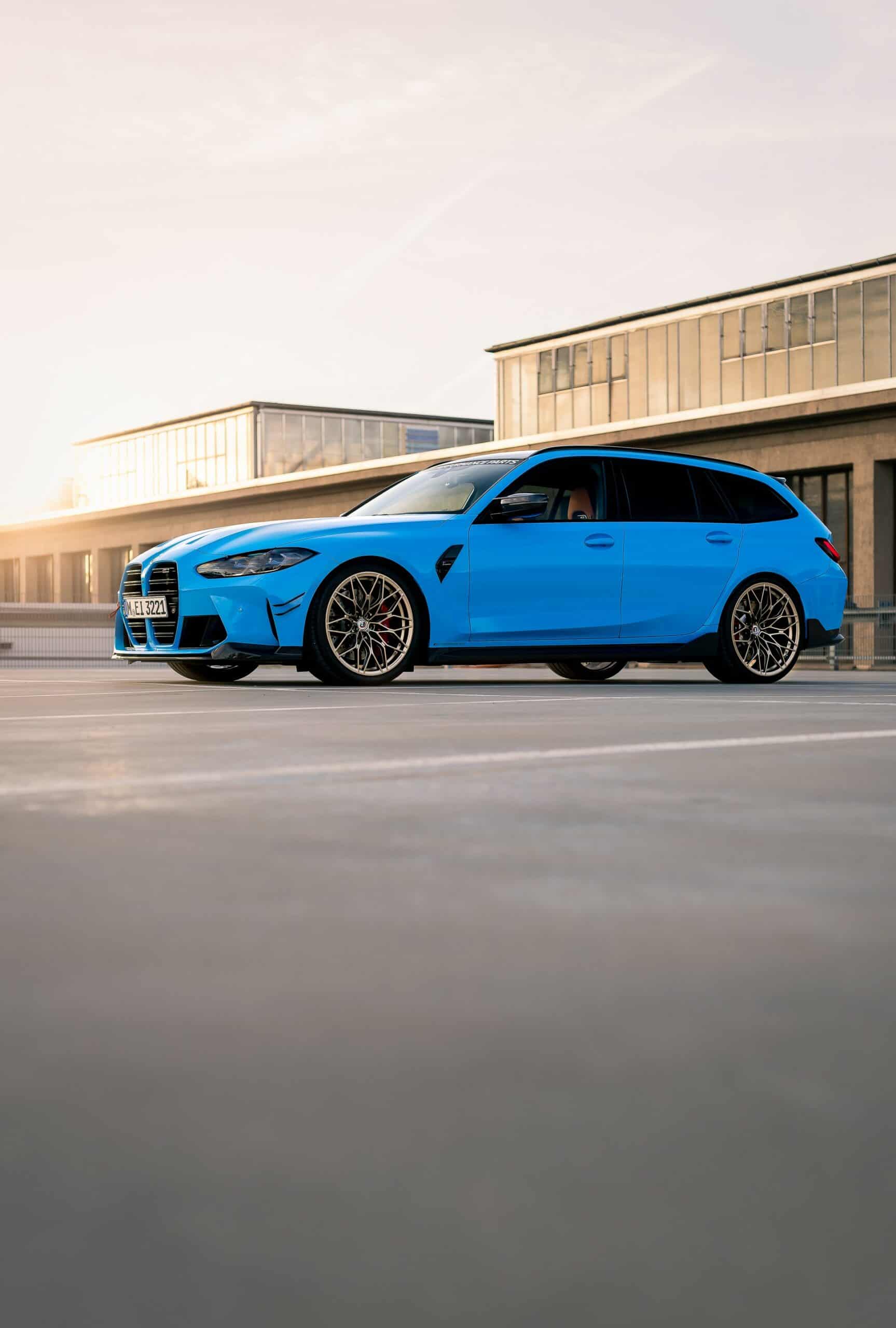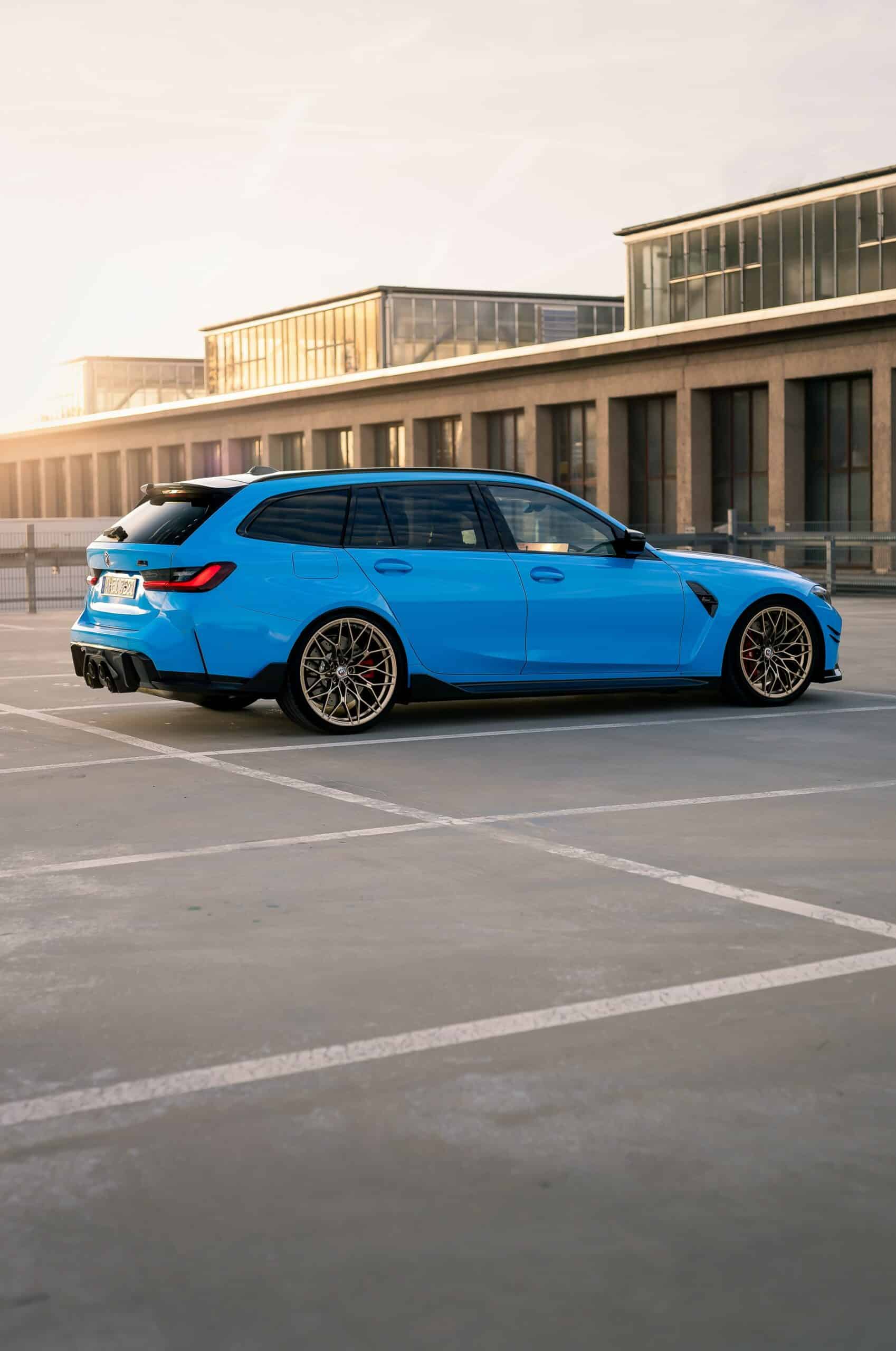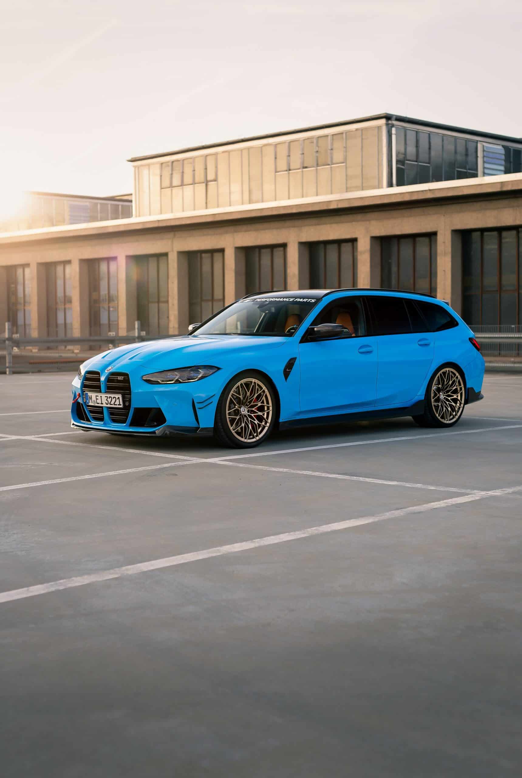 BMW is putting on quite the show at this year’s Essen by bringing a plethora of heavily upgraded M cars. We’ve already seen the new M2 decked out with M Performance Parts and now it’s time to take a closer look at the M3 Touring with numerous extras inside and out. The super wagon is dressed to impress in Riviera Blue and rides on the 1000M forged wheels with a flashy Frozen Gold Bronze finish.