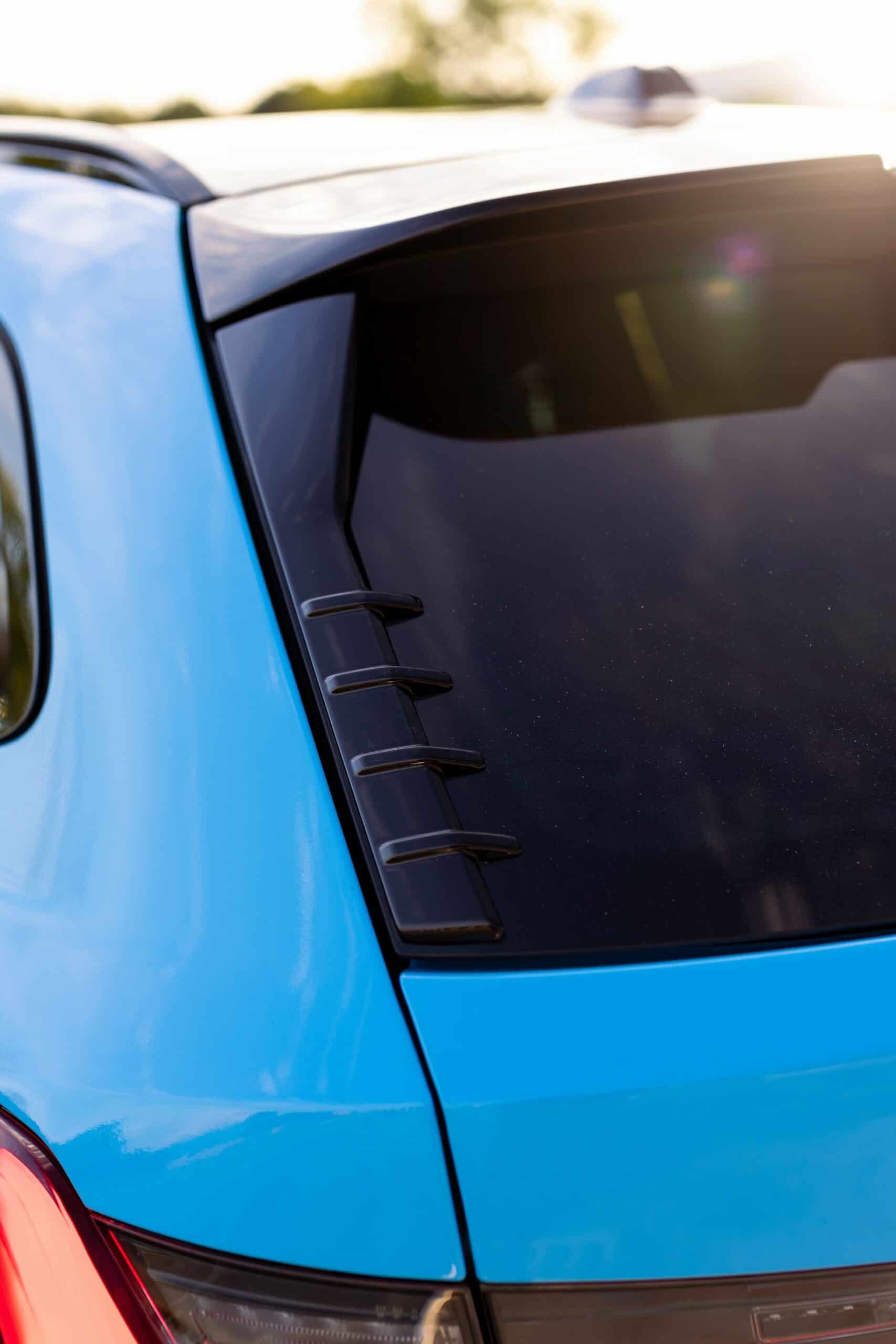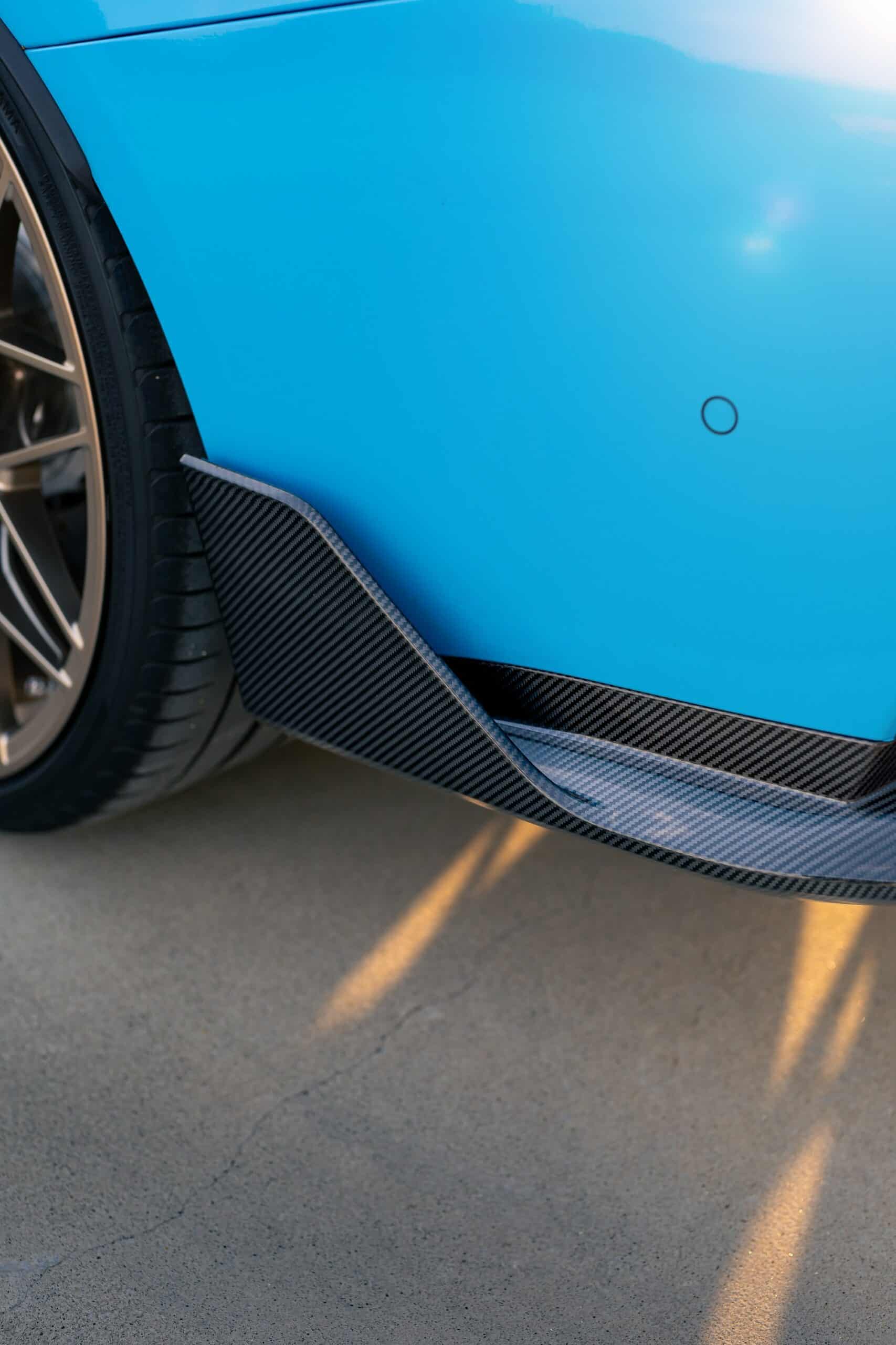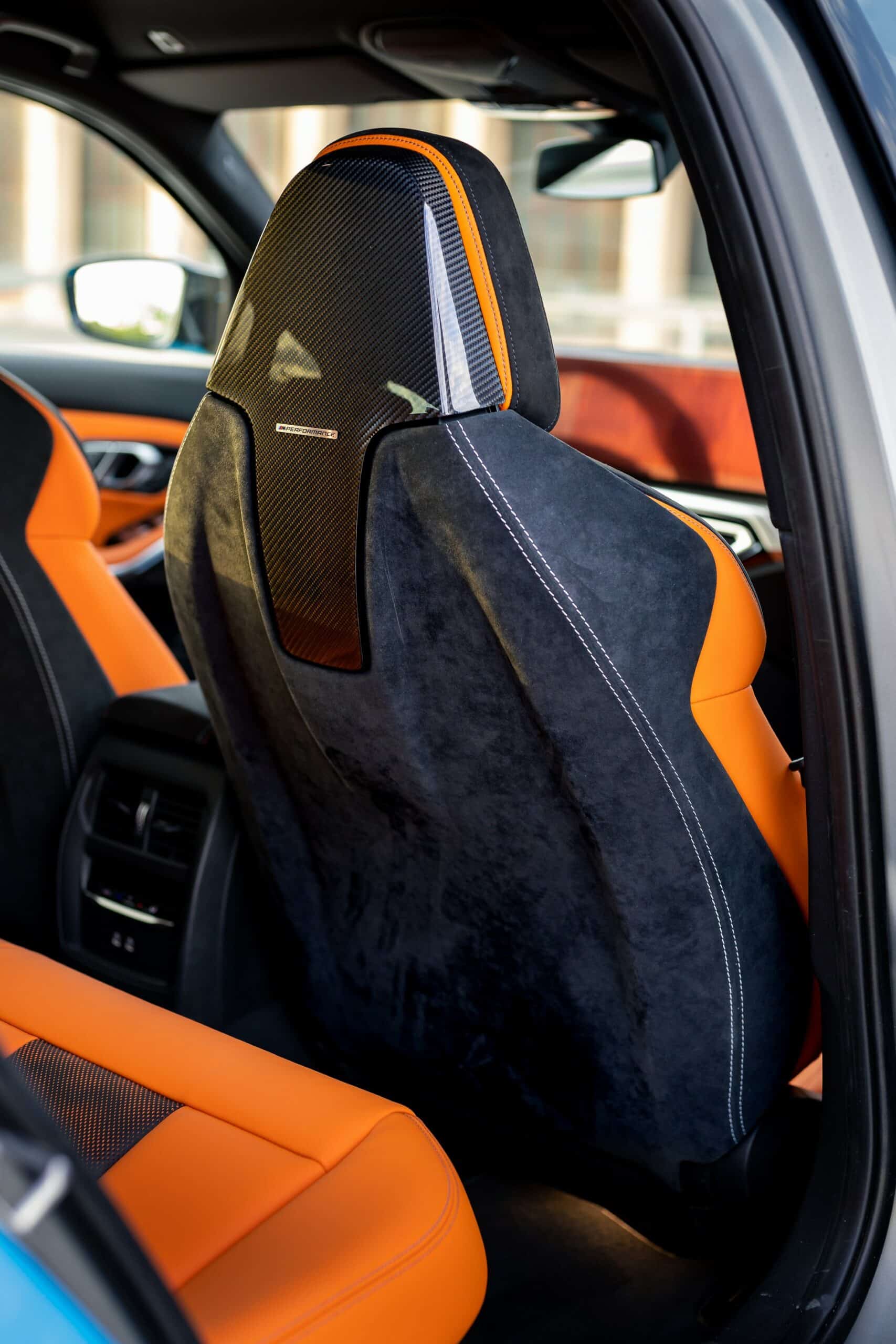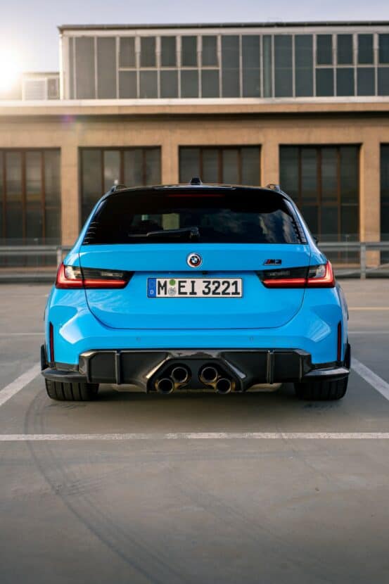 The high-performance wagon is fitted with the optional titanium M Performance exhaust borrowed from the M3 Sedan. It comes with a quad arrangement in the middle of a more aggressive diffuser with stacked tips for a layout recently introduced to the M2 G87 as well. The exhaust has a different silencer that reduces weight by approximately 30% compared to the standard part. Since we’re at the back, the window is flanked by carbon fiber winglets lending the M3 Touring a sportier vibe.