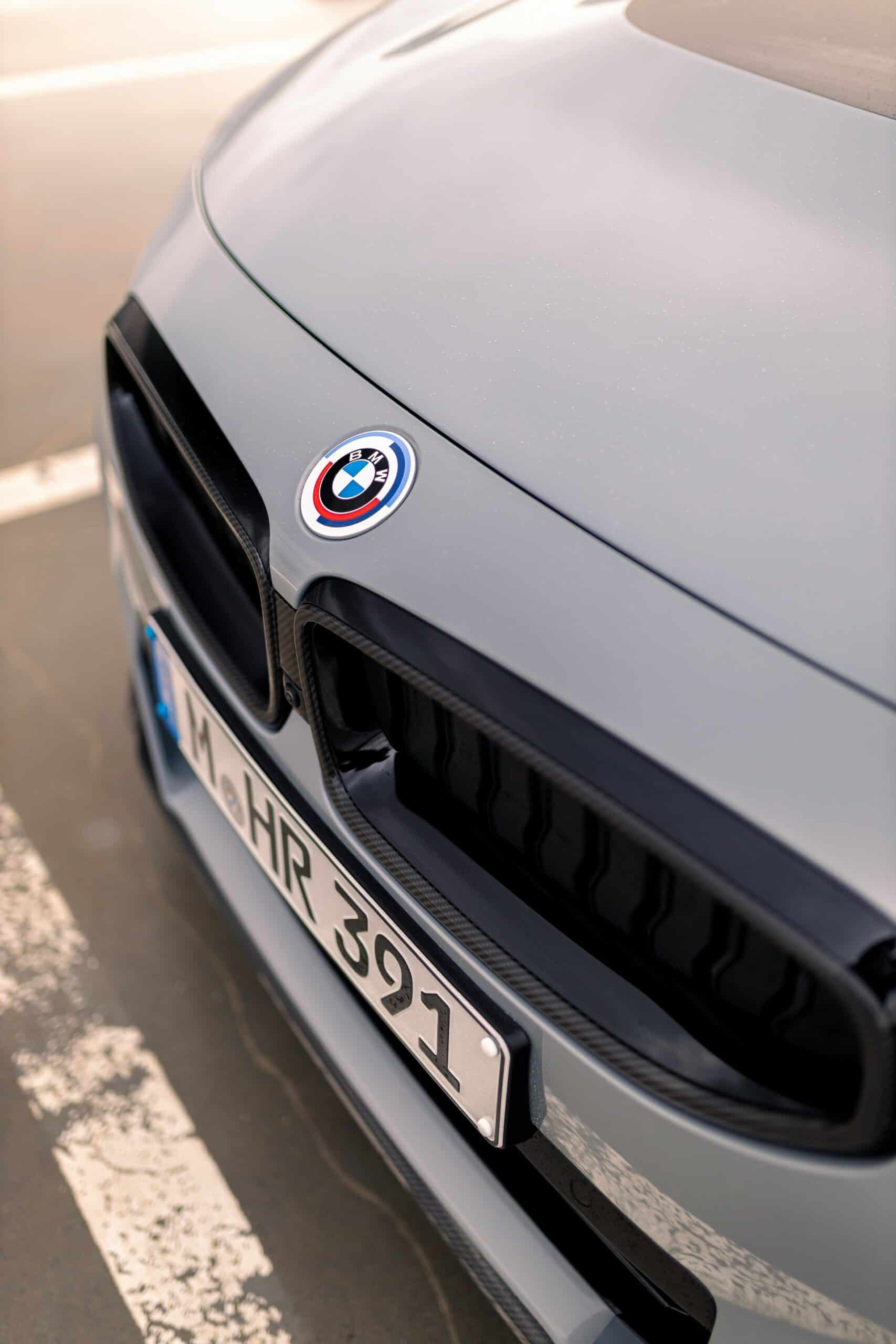 Surprisingly, BMW decided to go with a 2022 version rather than the latest model since the car is fitted with the previous-generation iDrive. Infotainment system aside, the M240i wears numerous carbon fiber add-ons and anniversary emblems celebrating half a century of the M division. It rides on 20-inch black M Performance wheels (795 M style) with M branding on the valve stem caps and the blue calipers part of the upgraded braking system.