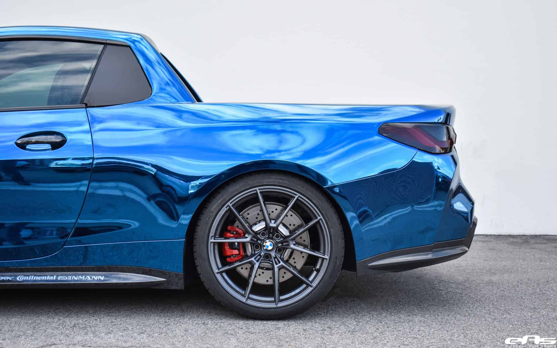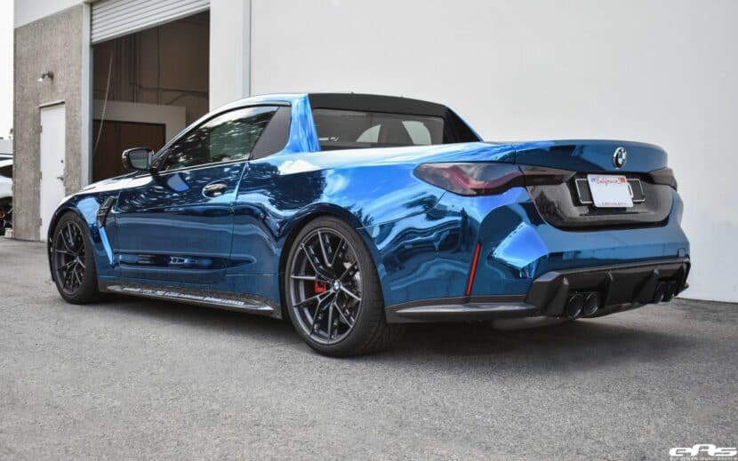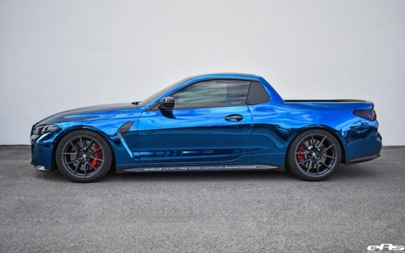 Someone had the idea to take a brand-new G82 BMW M4 and turn it into a sports ute, similar to the performance utes of Australia. The job only took around three weeks, to make sure it was done in time for SEMA, and it’s surprisingly impressive, hilarious, and fantastic. The build was done by Dinmann, who did it to show off their carbon fiber line of parts and very few things catch eyeballs like a reflective blue BMW M4 ute.