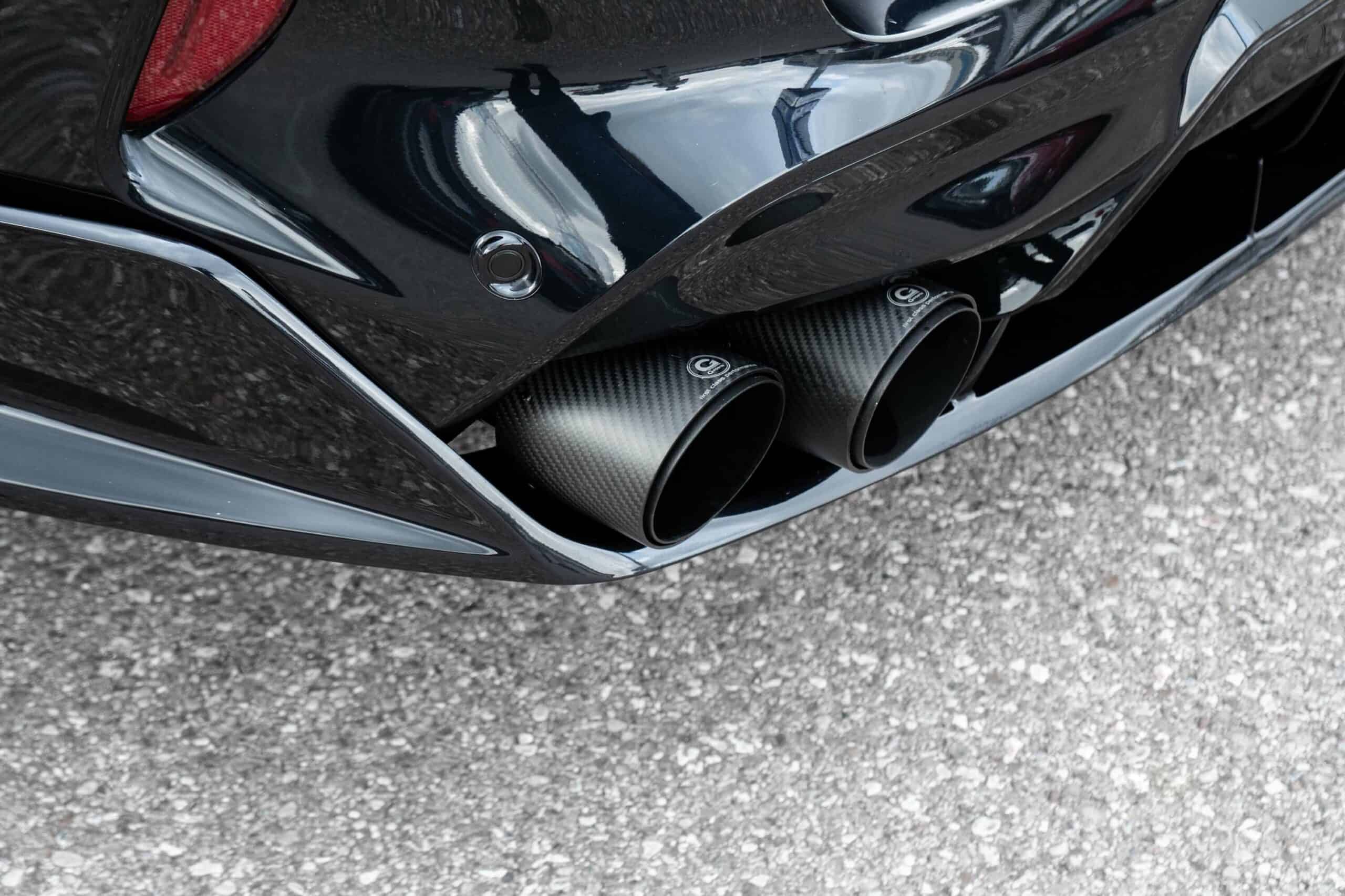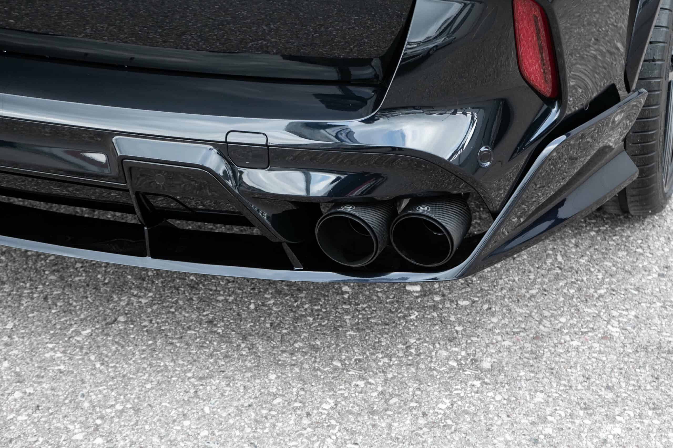 To achieve the massive power increase, the tuner installed bigger turbos working at a higher boost pressure. The exhaust back pressure was reduced and those quad tips we mentioned earlier come from a stainless steel exhaust with custom downpipes and valve control to adjust the soundtrack on the fly.