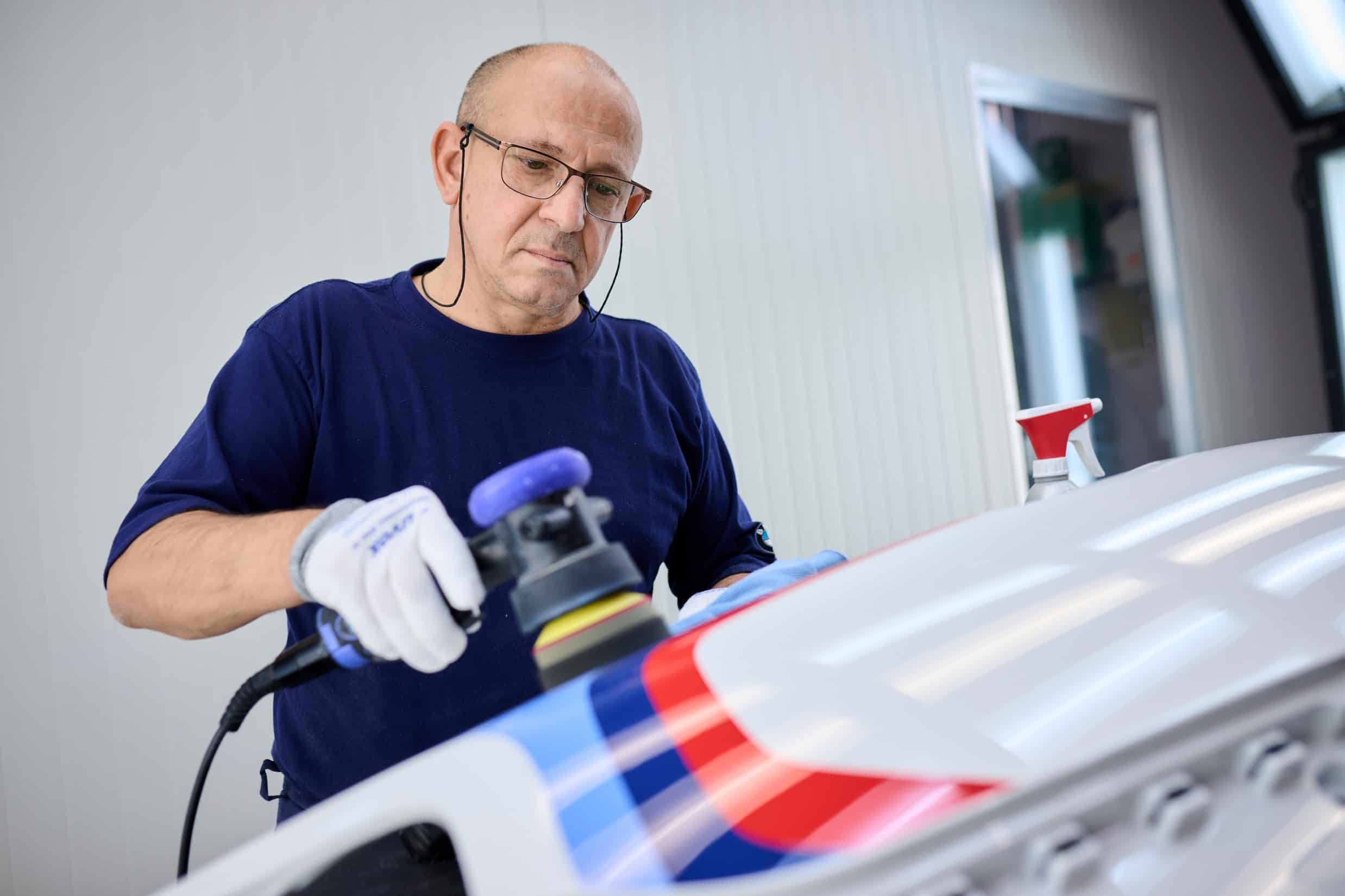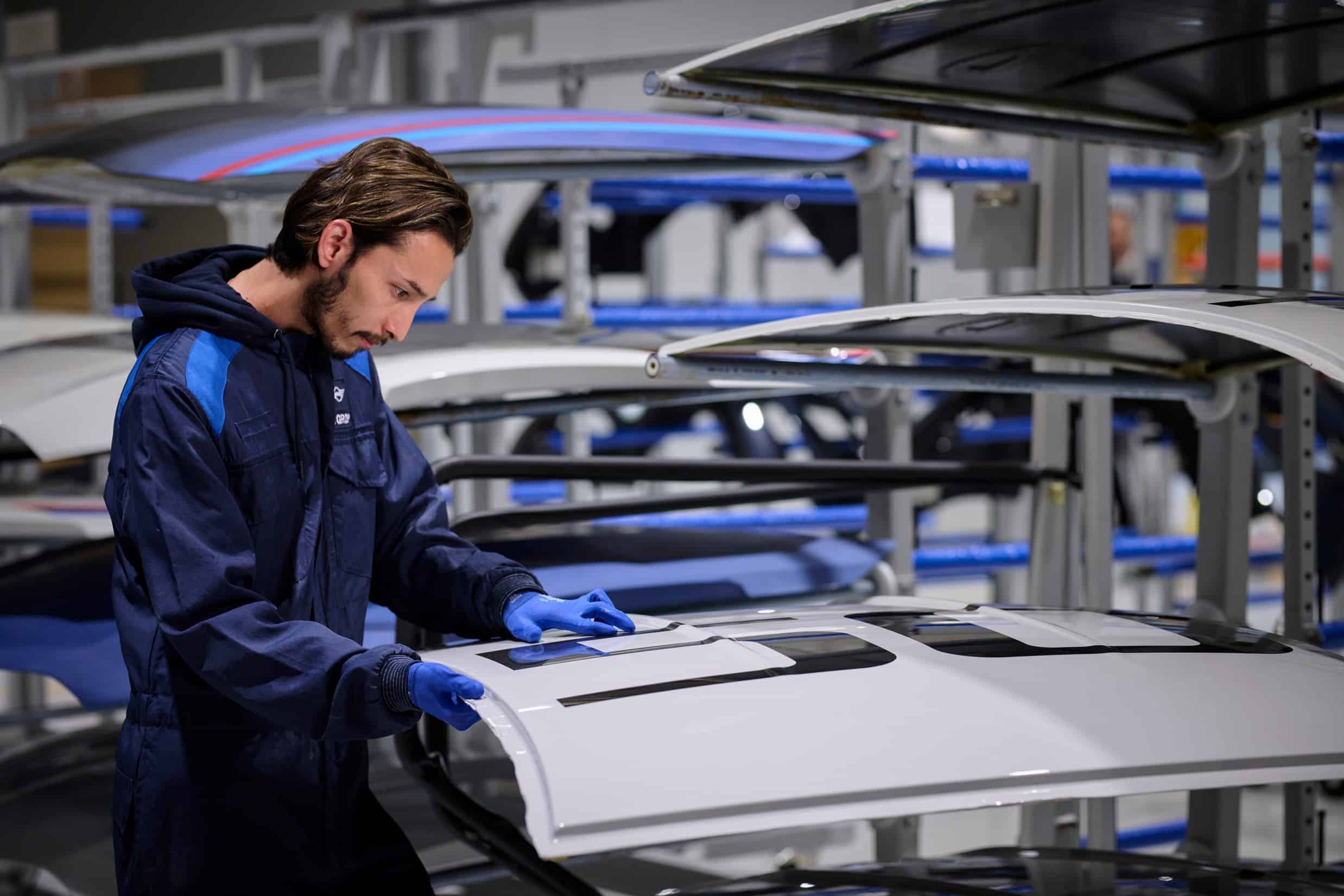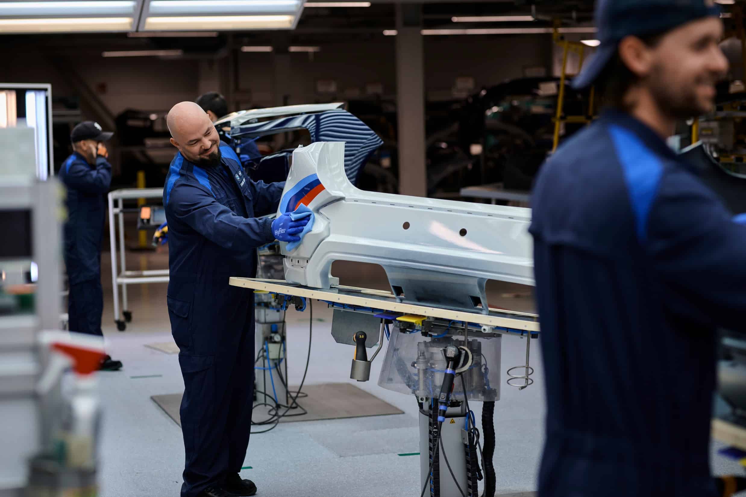 After that, the livery in the three famous colors is applied by hand. No fewer than 22 individual parts are manually painted and each vehicle goes through a whopping 134 paint processes. In total, 6,700 manual work sequences in the paint shop are necessary for the small series. It takes a team of 30 experts to assemble the bespoke car, which required making changes to the factory to accommodate those centerlock wheels.