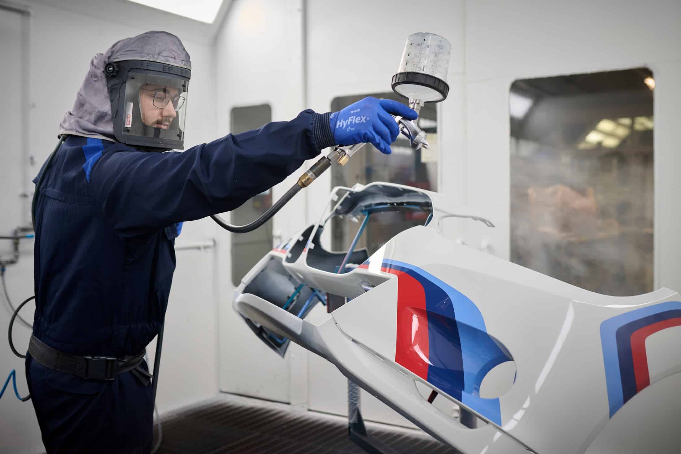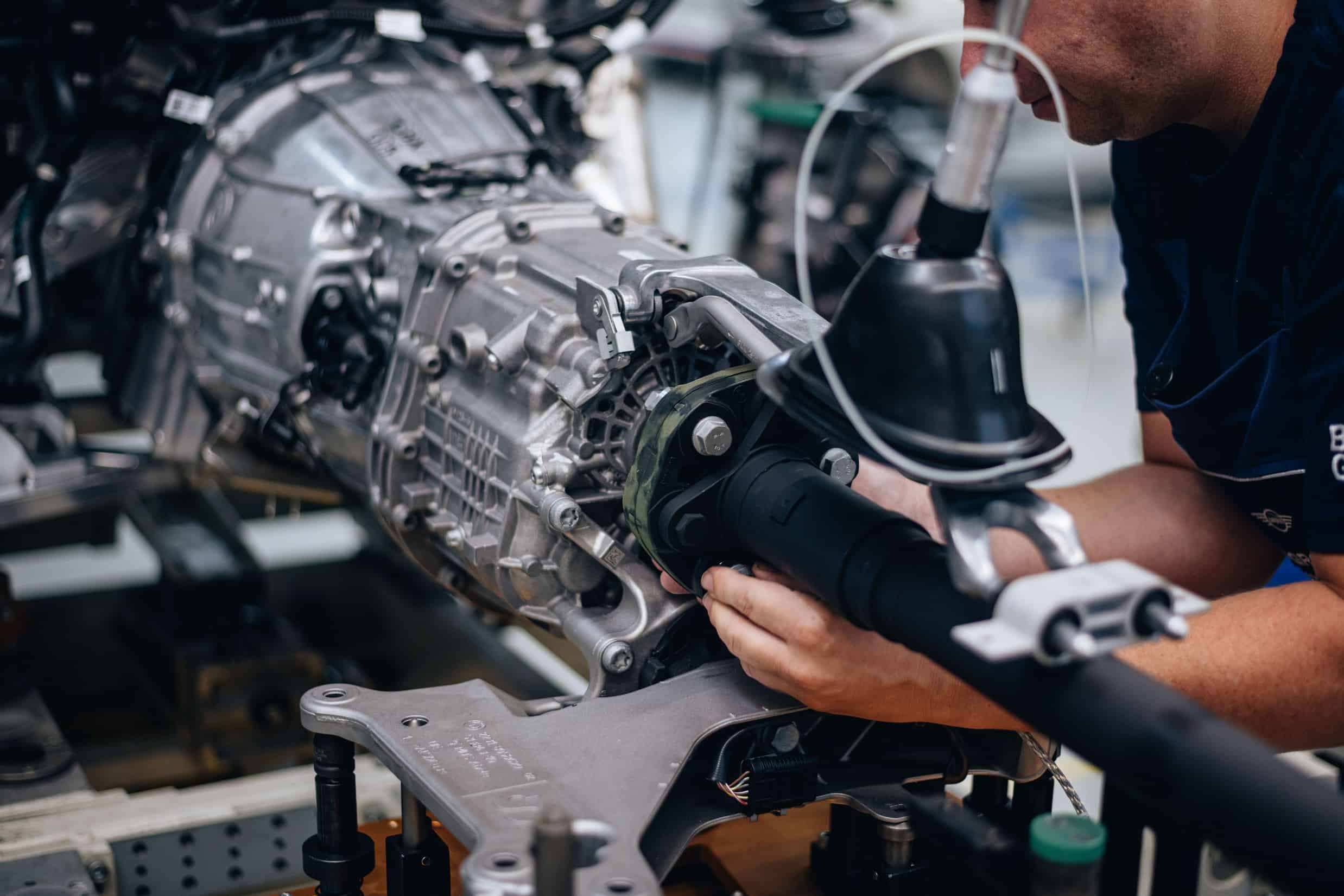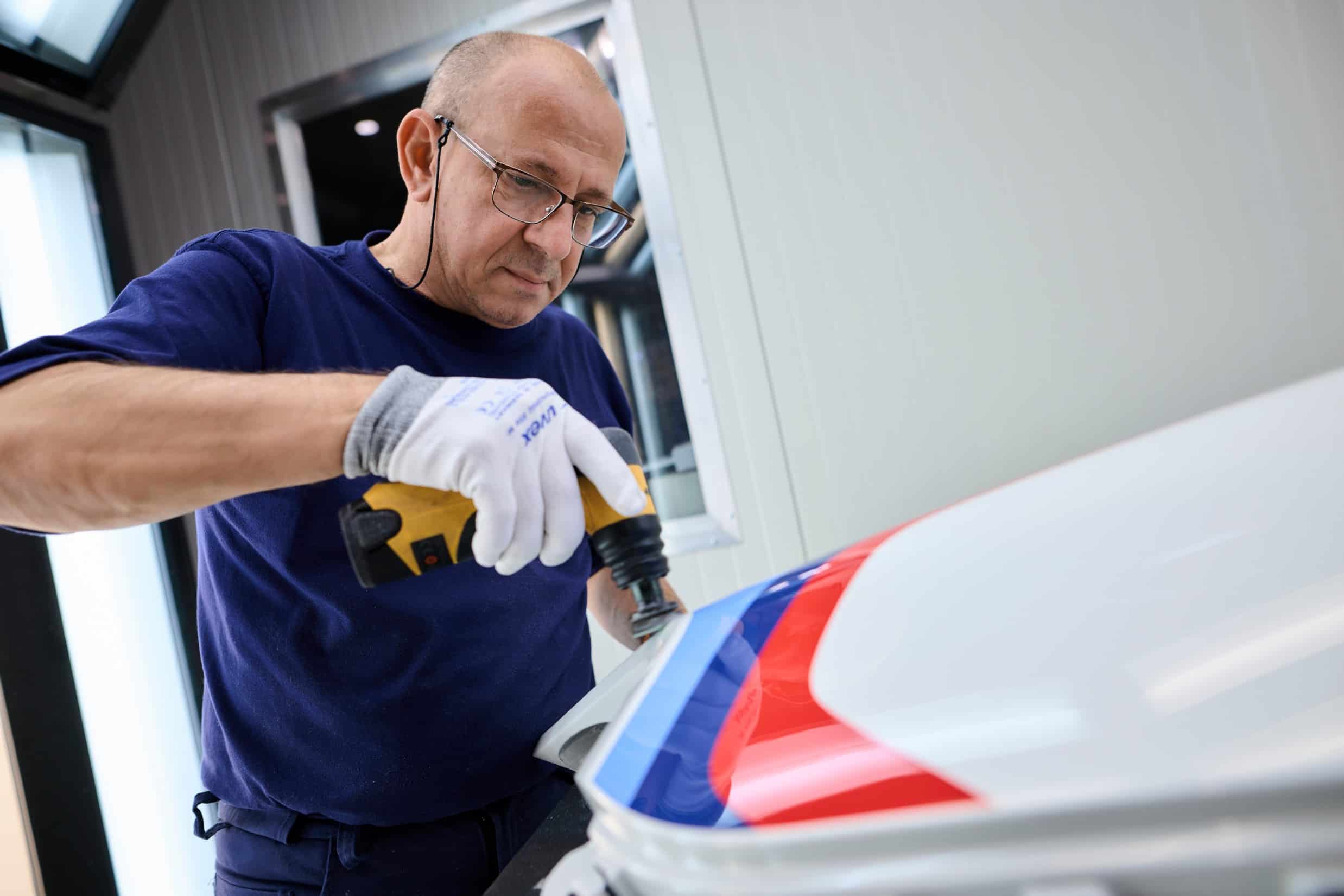 After that, the livery in the three famous colors is applied by hand. No fewer than 22 individual parts are manually painted and each vehicle goes through a whopping 134 paint processes. In total, 6,700 manual work sequences in the paint shop are necessary for the small series. It takes a team of 30 experts to assemble the bespoke car, which required making changes to the factory to accommodate those centerlock wheels.