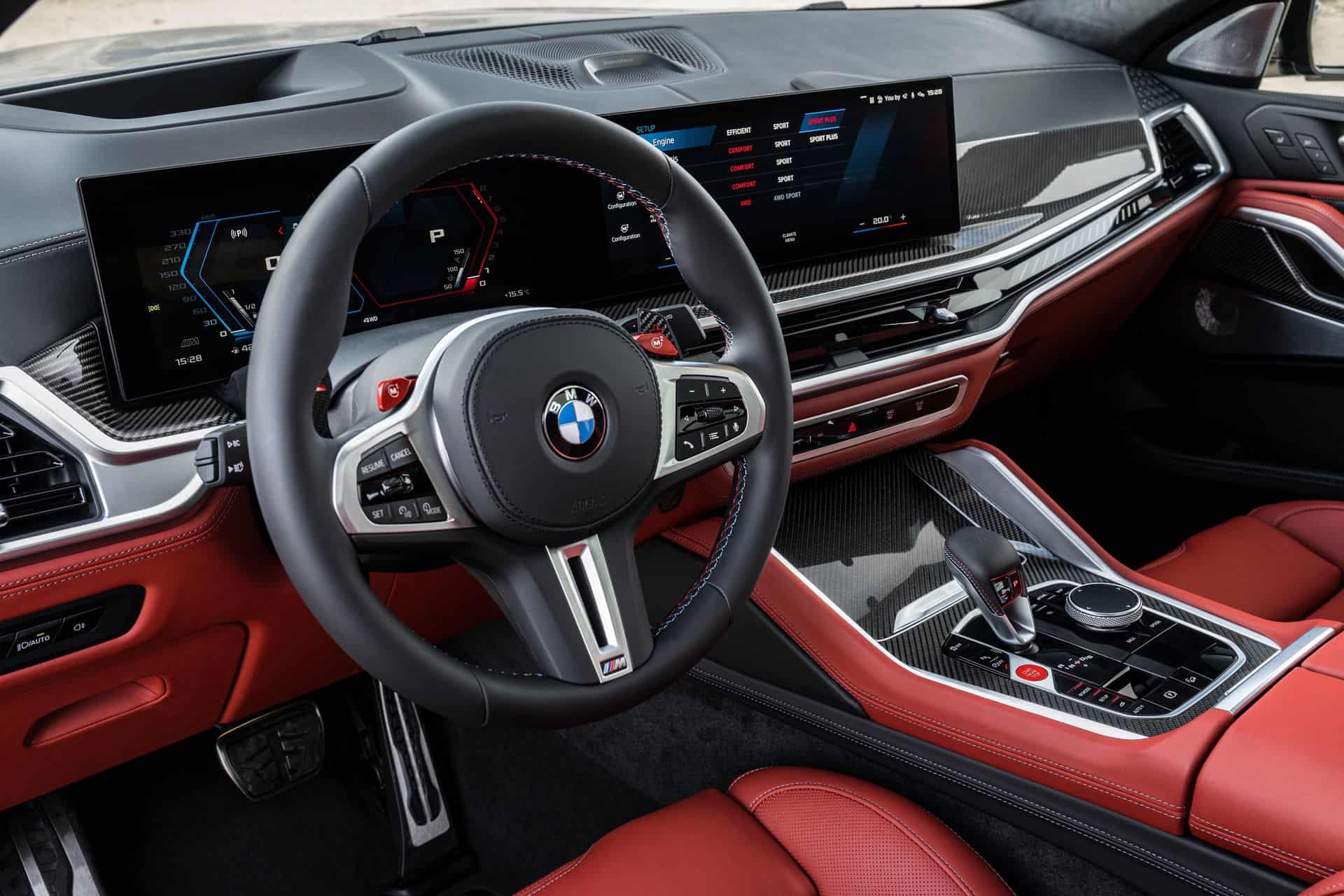 As expected, BMW is giving the 2024 X6 M its latest iDrive technology with a 12.3-inch digital instrument cluster and a 14.9-inch touchscreen housed in a Curved Display. The Operating System 8 has simplified the center console by moving most controls into the large center display. With the facelift, the central air vents are slimmer and the passenger side of the dashboard now hosts an ambient light bar with a prominent M logo.