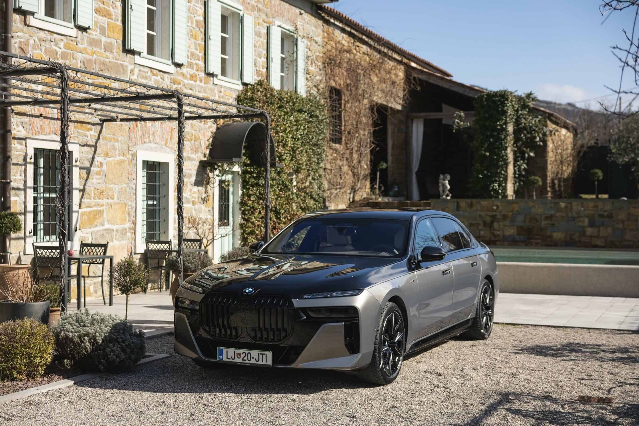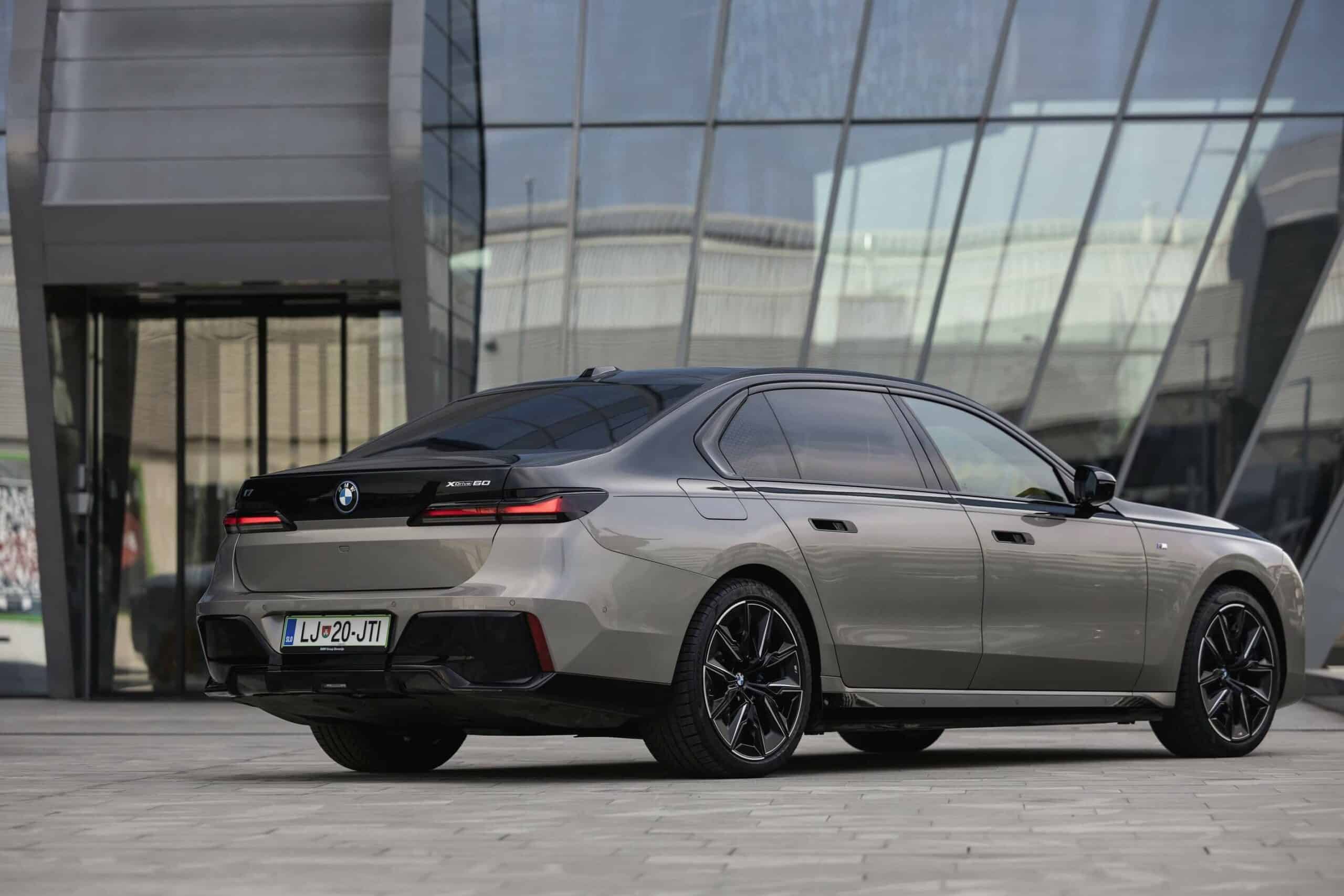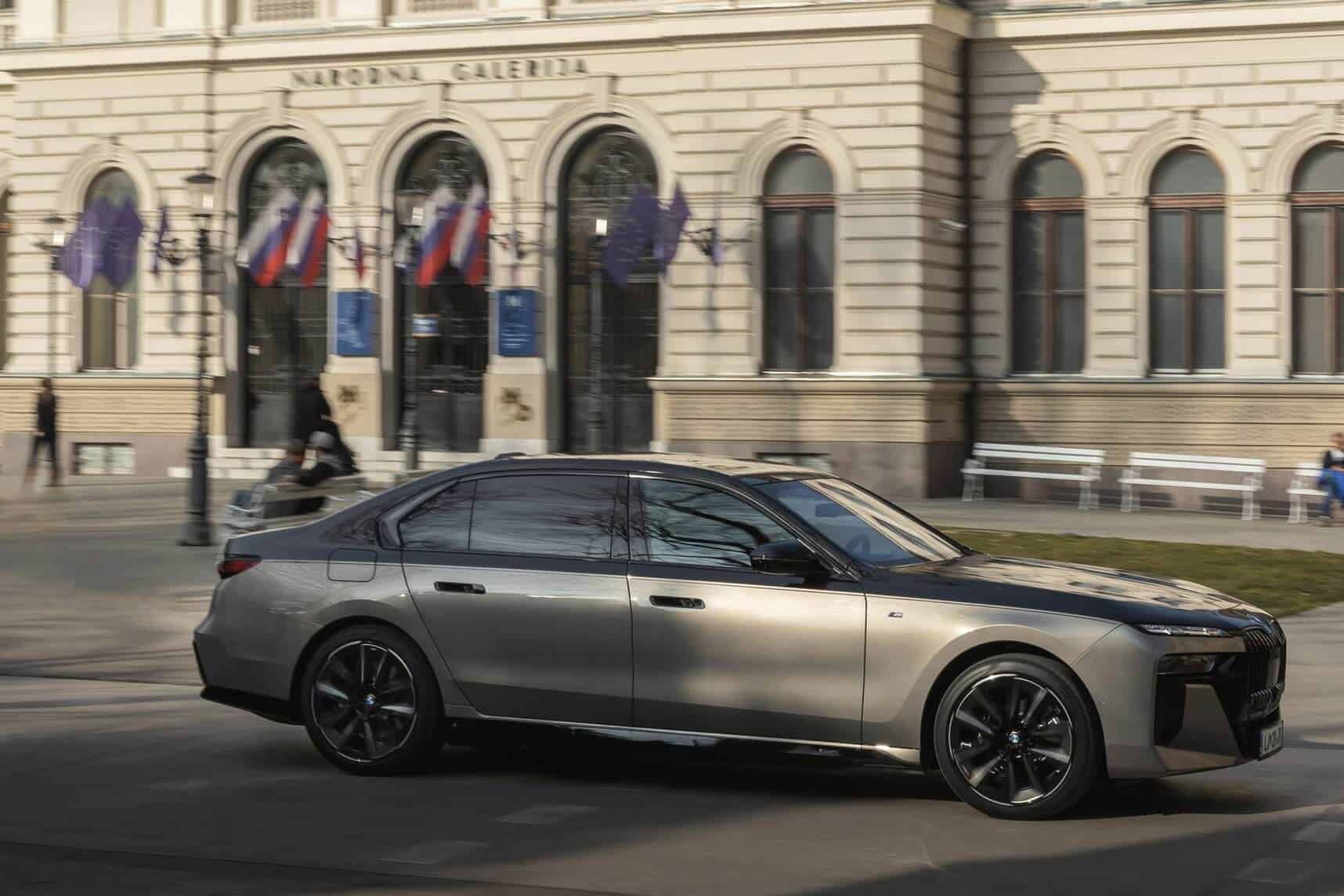 BMW Slovenia has published fresh images depicting the i7 xDrive60 with a two-tone paint by combining Sapphire Black with Oxide Gray. The fully electric sedan is built in the M Sport Package Pro specification and blacks out the mighty kidney grille courtesy of a Shadowline upgrade to complement the upper side of the body. The dark look is enhanced by the mirror caps and glossy 21-inch wheels (909 M style).