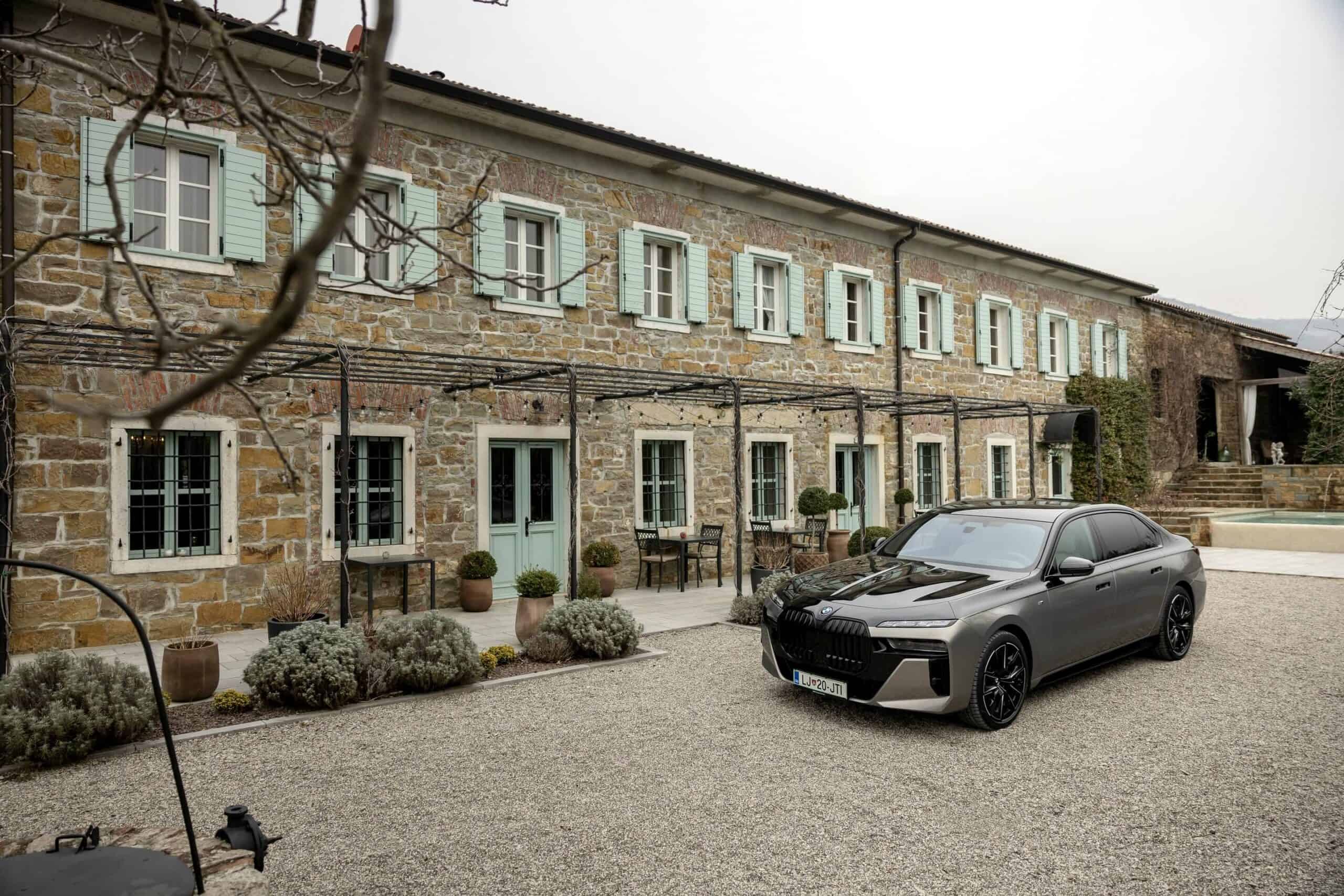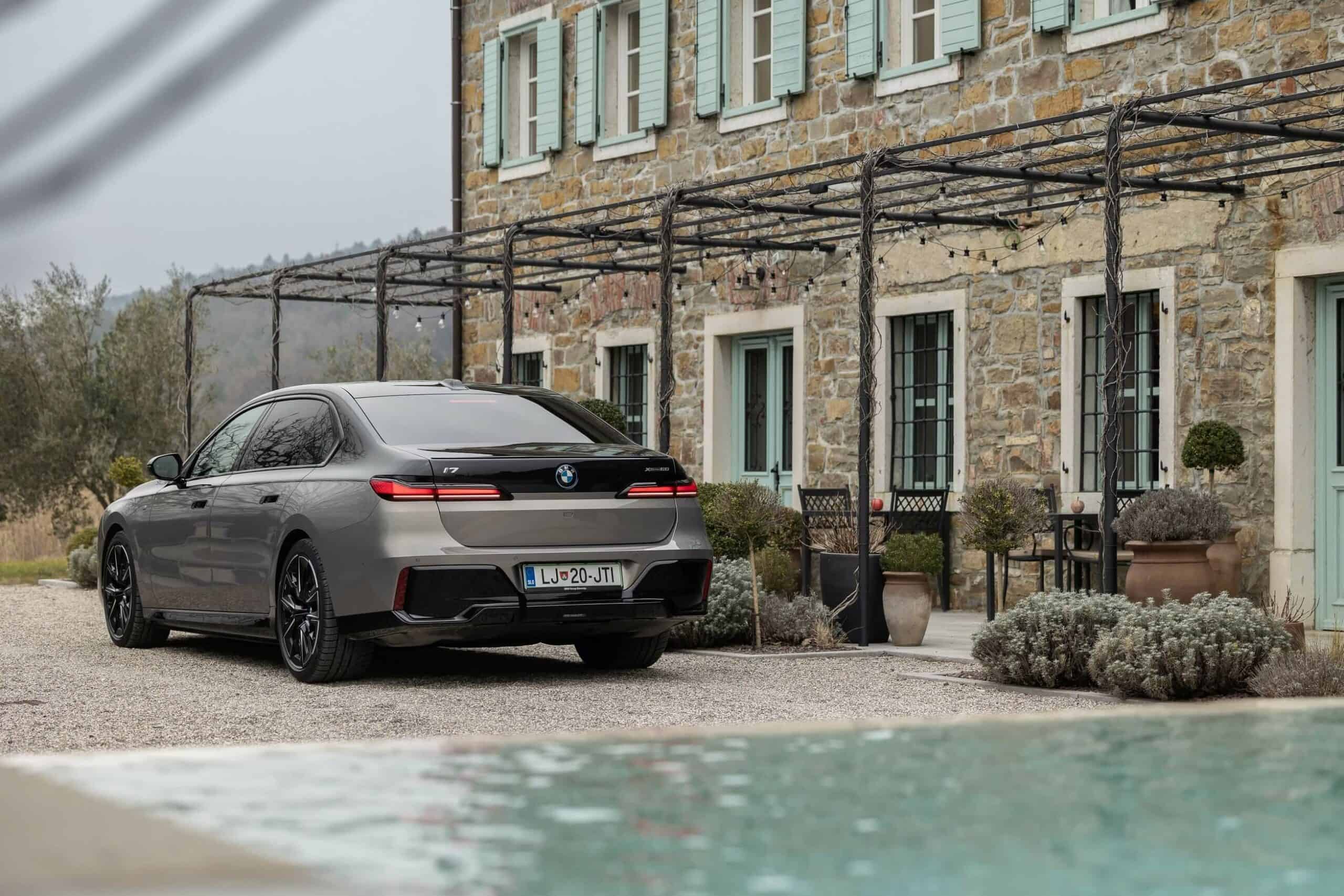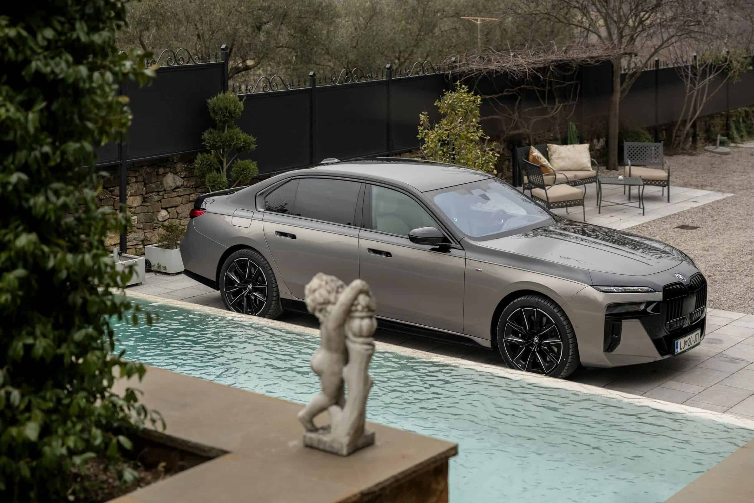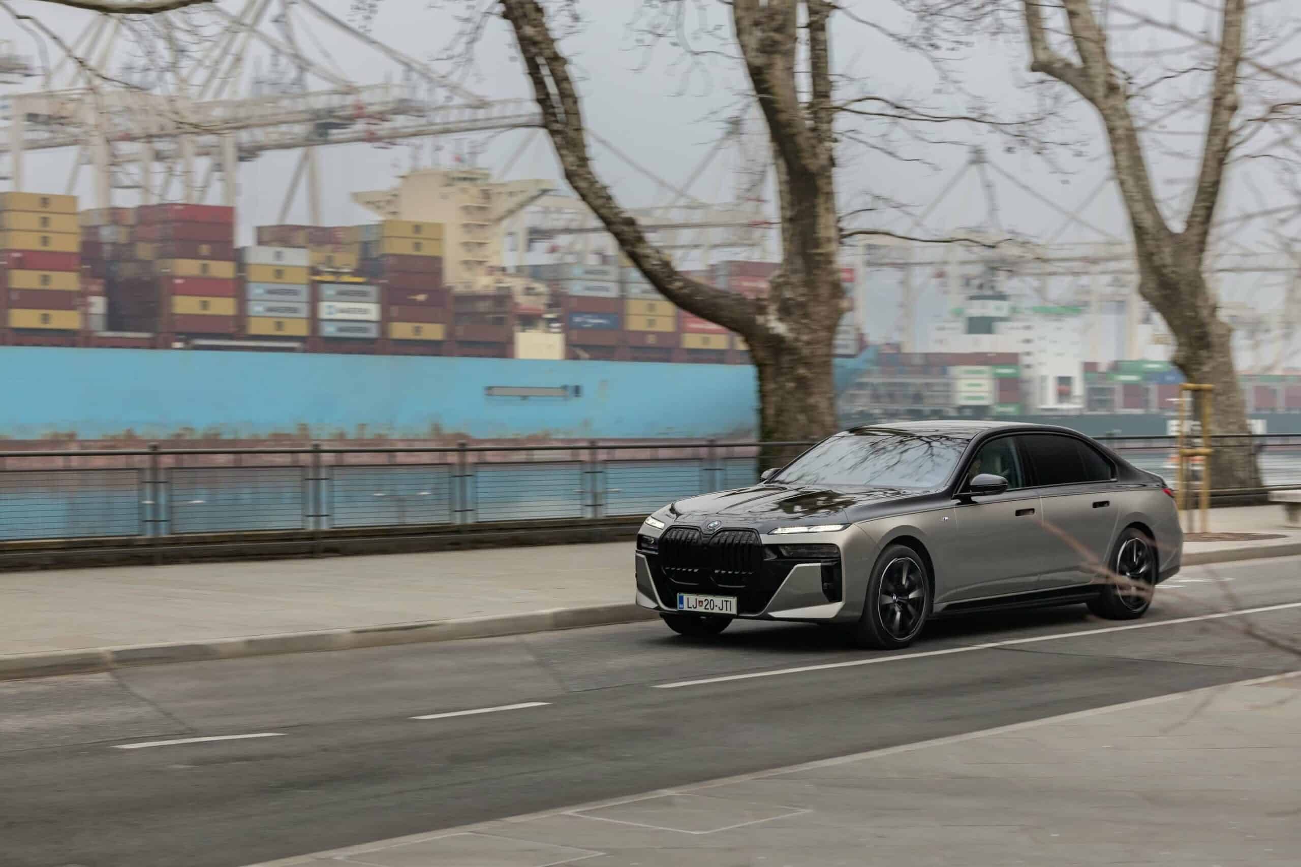 BMW Slovenia has published fresh images depicting the i7 xDrive60 with a two-tone paint by combining Sapphire Black with Oxide Gray. The fully electric sedan is built in the M Sport Package Pro specification and blacks out the mighty kidney grille courtesy of a Shadowline upgrade to complement the upper side of the body. The dark look is enhanced by the mirror caps and glossy 21-inch wheels (909 M style).
