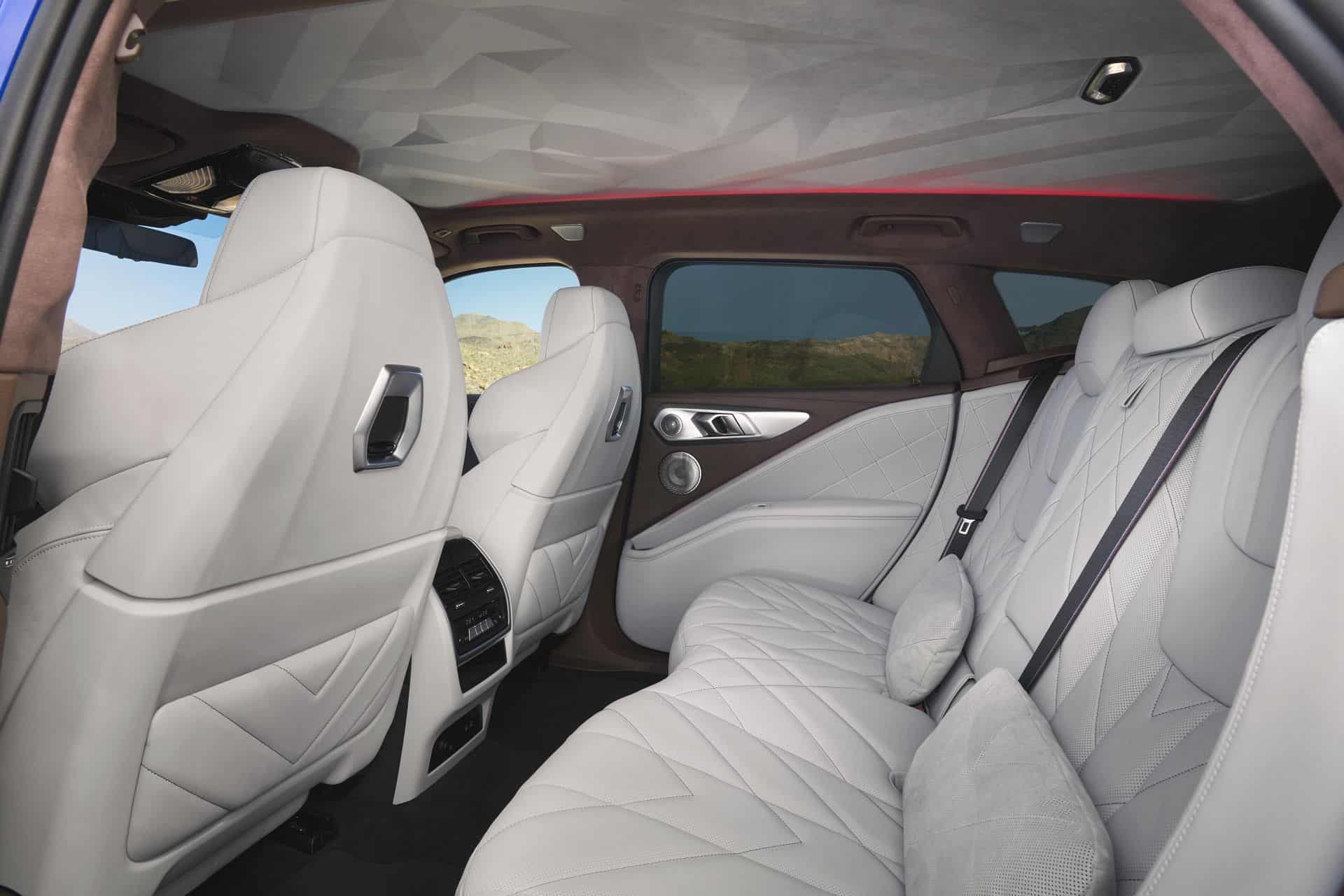 During my video review I also had a chance to sit in the back to experience the design of the XM. BMW calls the back seats the M Lounge and that’s a fair description since you do feel like you’re sitting in a very comfortable lounging chair. The bench has a good tilt which allows even passengers on the taller side to comfortably sit upright. The centerpiece of the interior is the headliner with a 3D prism design covered in Alcantara fabric and illuminated by 100 LED lights. A cool and unique feature, but remains to be seen whether customers would have made better use of a full panoramic sunroof like in the 7 Series.