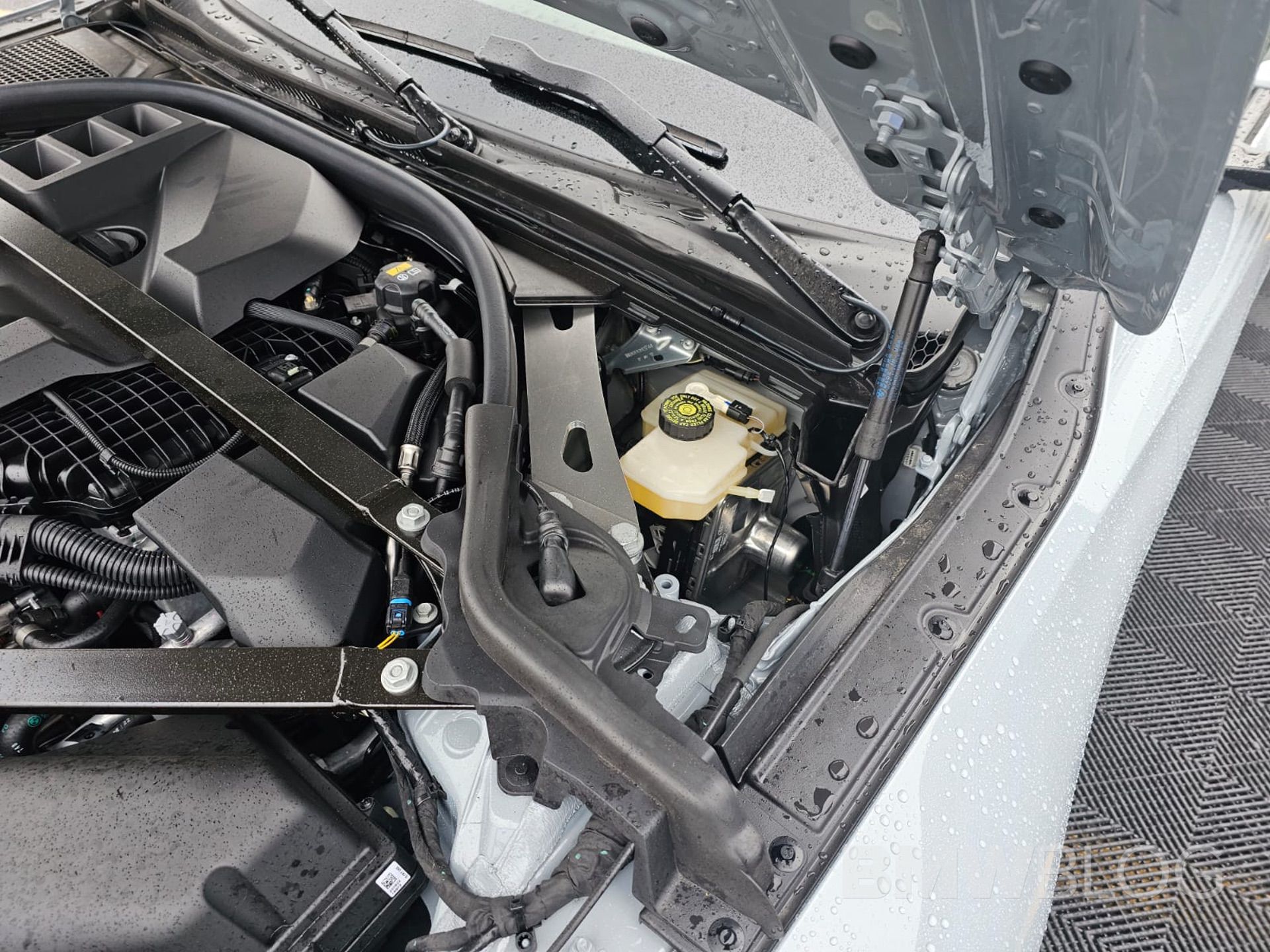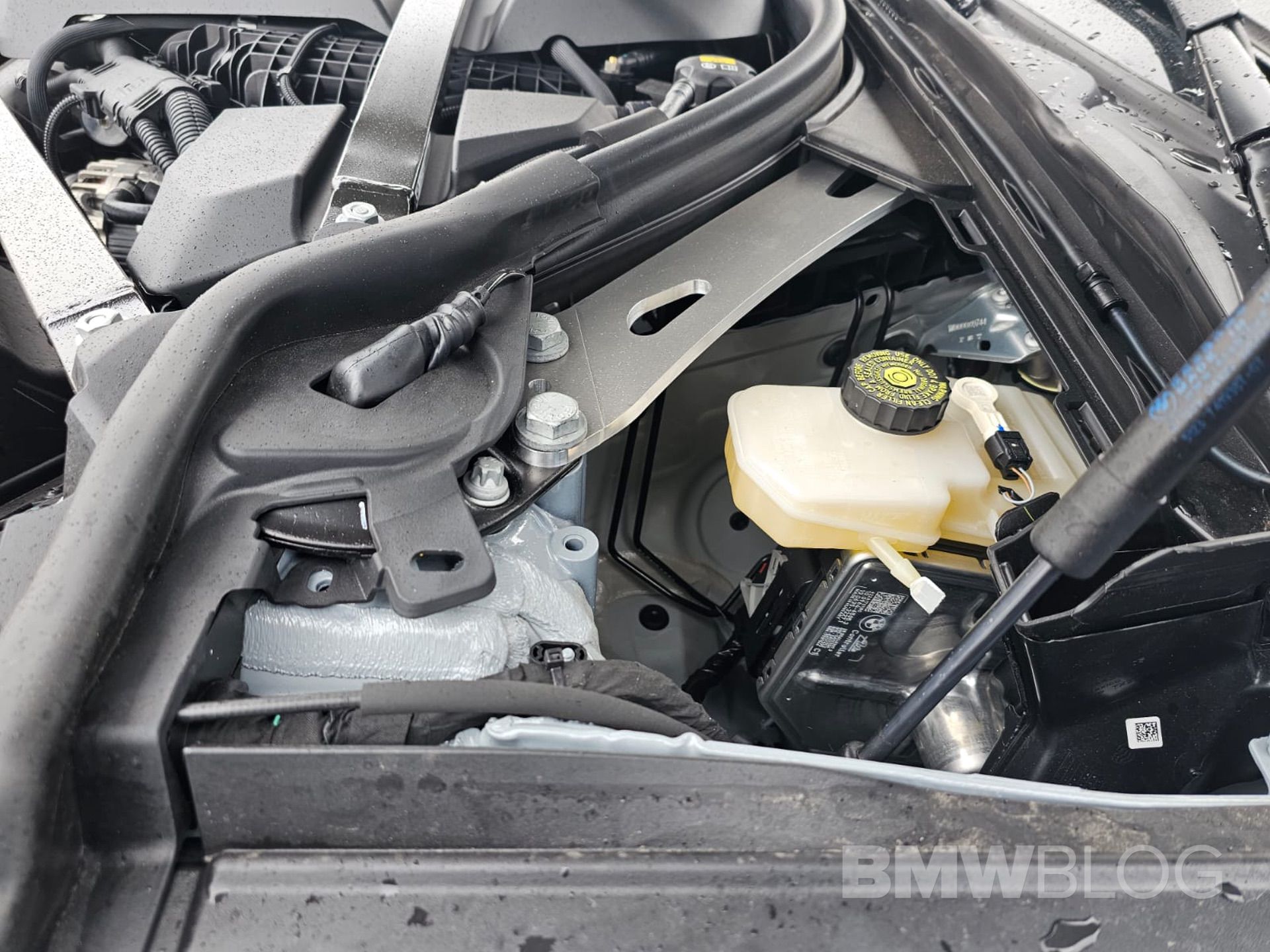 Under the hood, there’s a reinforcement plate under the circled area in the photo below, on both sides of the engine bay. There’s also a the same V-shaped strut tower brace, which meets at the front end, just as there is on the BMW M3 and M4. Both of those structural braces increase stiffness and sharpness in the front end, making the M2 turn in better by removing chassis slop. At the rear, there’s some C-pillar reinforcement as well, which makes its rear end stiffer.
